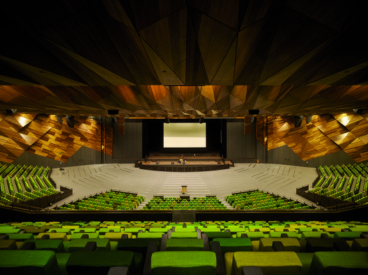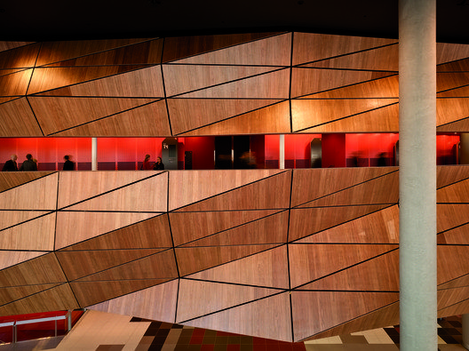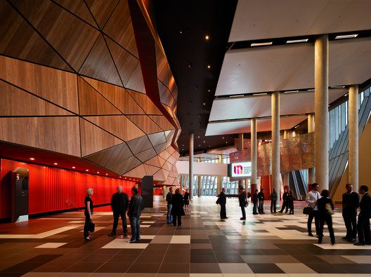 This initial condition sets up a precedent which runs through the soul of the building, providing energy and flow while creating an exciting venue which puts both Melbourne and itself on display to the public. Within the heart of the Centre is Plenary Hall, a 5000-seat, fan-shaped auditorium which can be divided into three independent auditoria. The Hall truly is the heart- acting as an organizing element for visitor circulation, it is set up as a building within the greater whole, clad in faceted timber, harkening back to the complex’ motif and its surroundings’ maritime past.