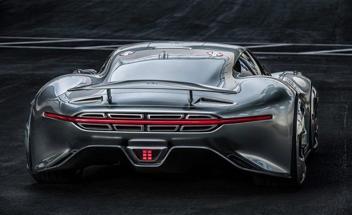 At the rear, the AMG Vision utilizes eight different exhausts that are grouped together. The sound designers tuned each exhaust individually, each with its own sound, giving the impression of multiple vehicles in one.