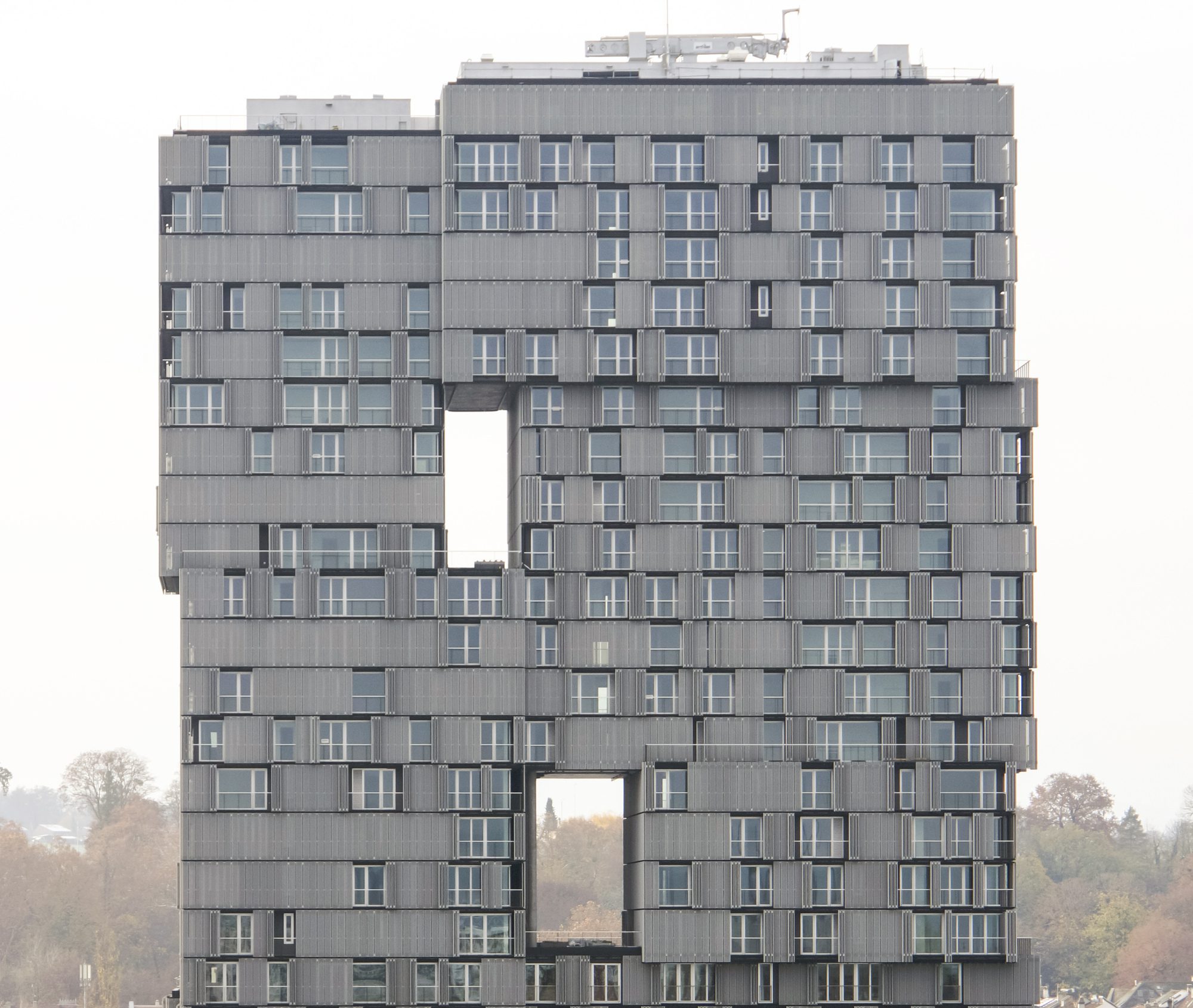 Programming volumes. The Meret Oppenheim Hochhaus is a mixed-use building with apartments, offices, a café, and a restaurant. Most programs are bound to specific volumes within the whole stack. The café and the restaurant will animate the street life along the Güterstrasse and the Meret Oppenheim Square. Above the ground floor with its restaurant, there will be 5 floors of office space. The residential portion of the building rises from the 6th to the 24th floor. The apartments may be entered independently from the service functions. On the 6th, 7th, and 15th floors, there are large outdoor areas that will function as terraces for the respective apartments, or alternatively as communal outdoor gathering spaces for the offices. The different levels provide unique views over the city and the surrounding landscape.
