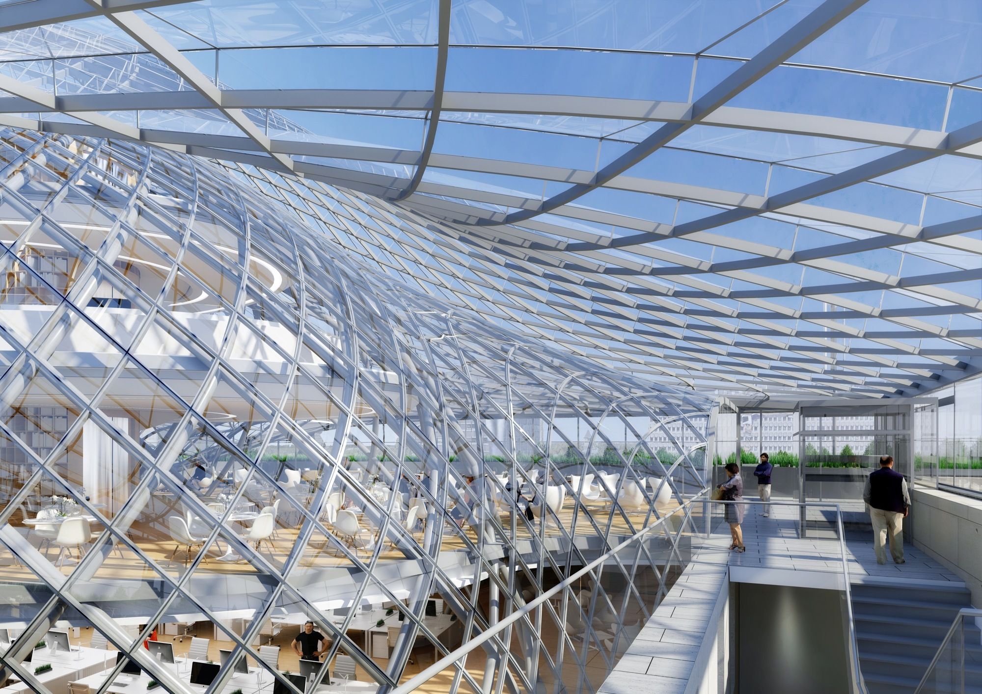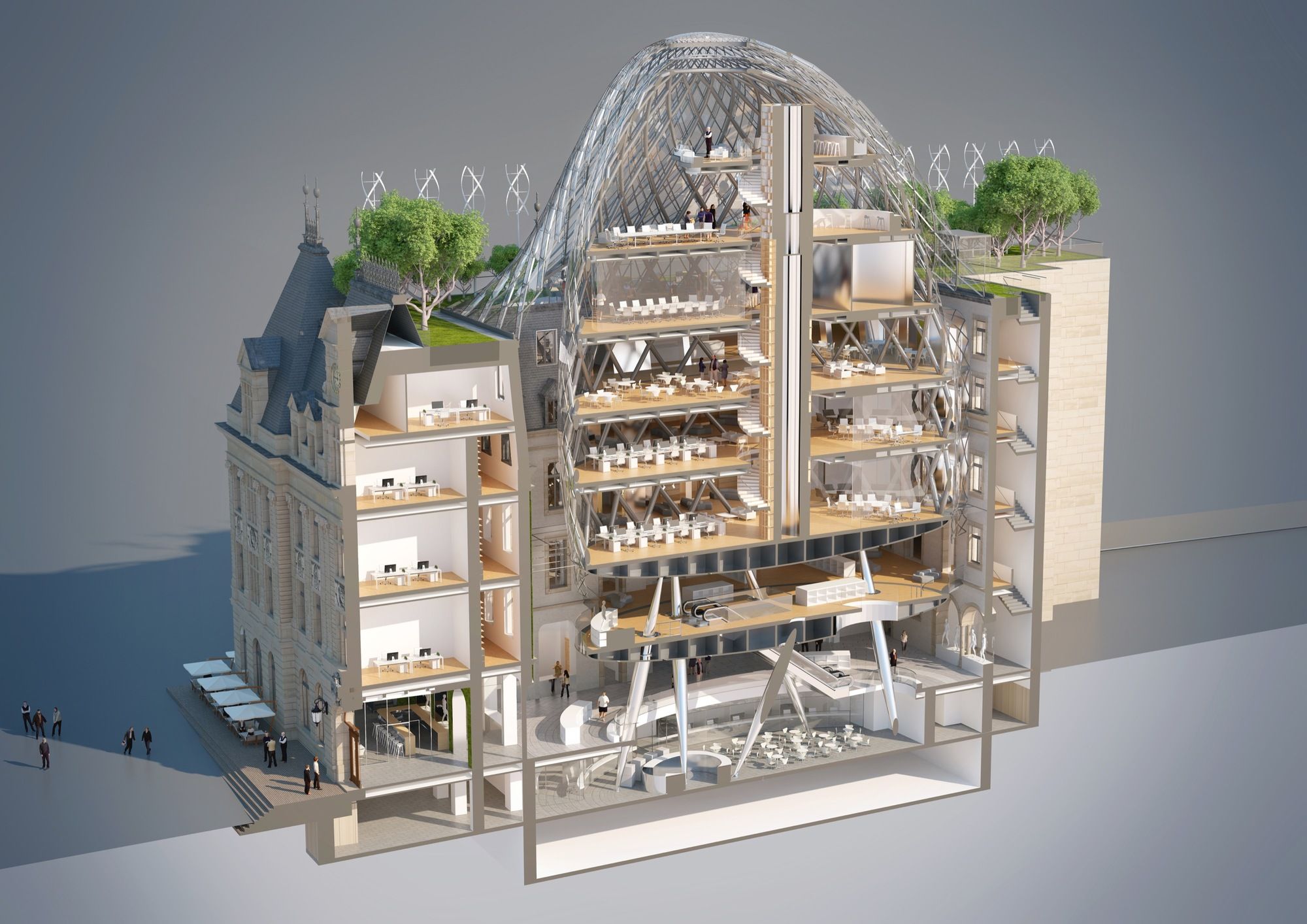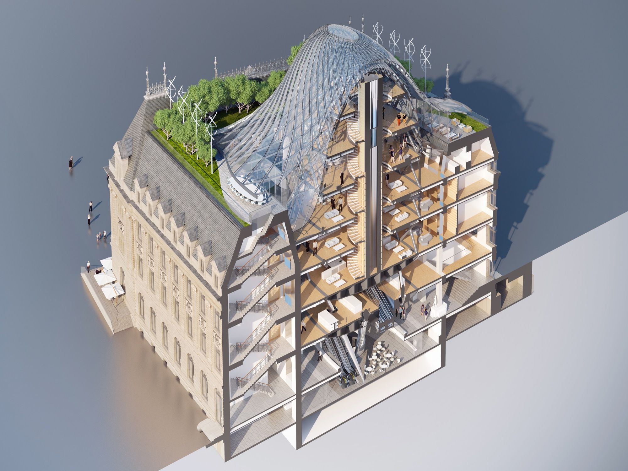 Metamorphosis of the Hôtel Des Postes was designed by architect Vincent Callebaut, who calls the Solar Dome and its Chrysalis, a Jewel Nestled in a Stone Vessel. This vessel of stone and reinforced concrete was designed by the State Architect Sosthène Weis between 1905 and 1910. At the heart of a group of prestigious buildings impregnated with the urban fabric of the City of Luxembourg, the architects surgically operate a respectful sorting between the historical volumes of the building and the functional additions that have accumulated during the 20th century, from the inner court to the gangrenous roofs.