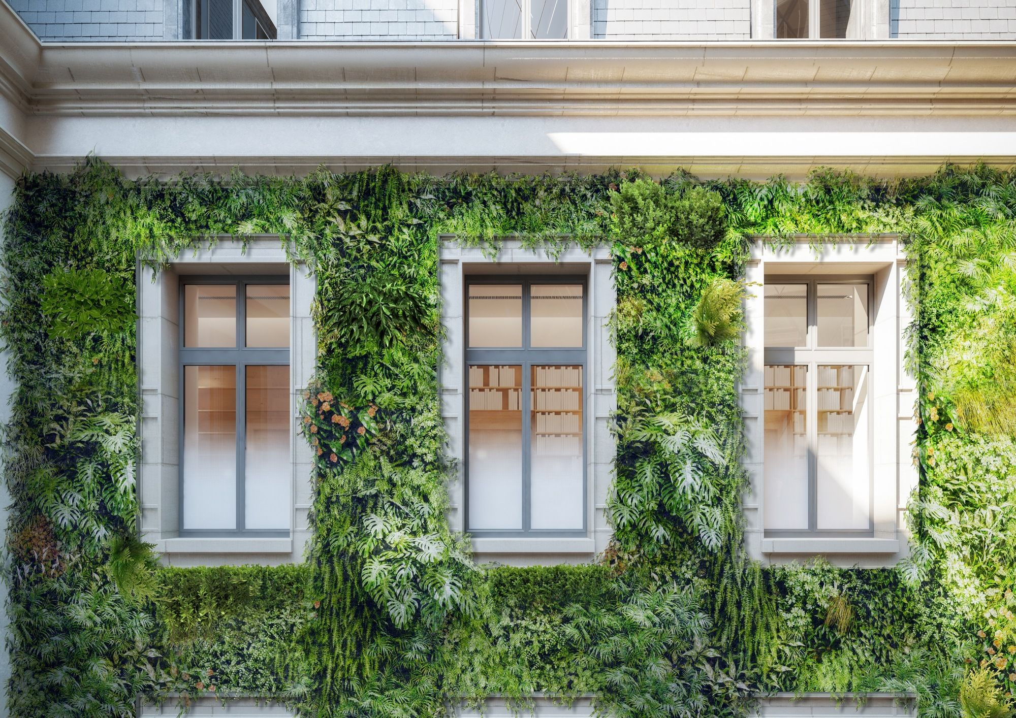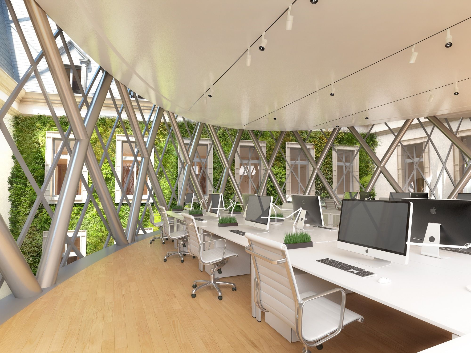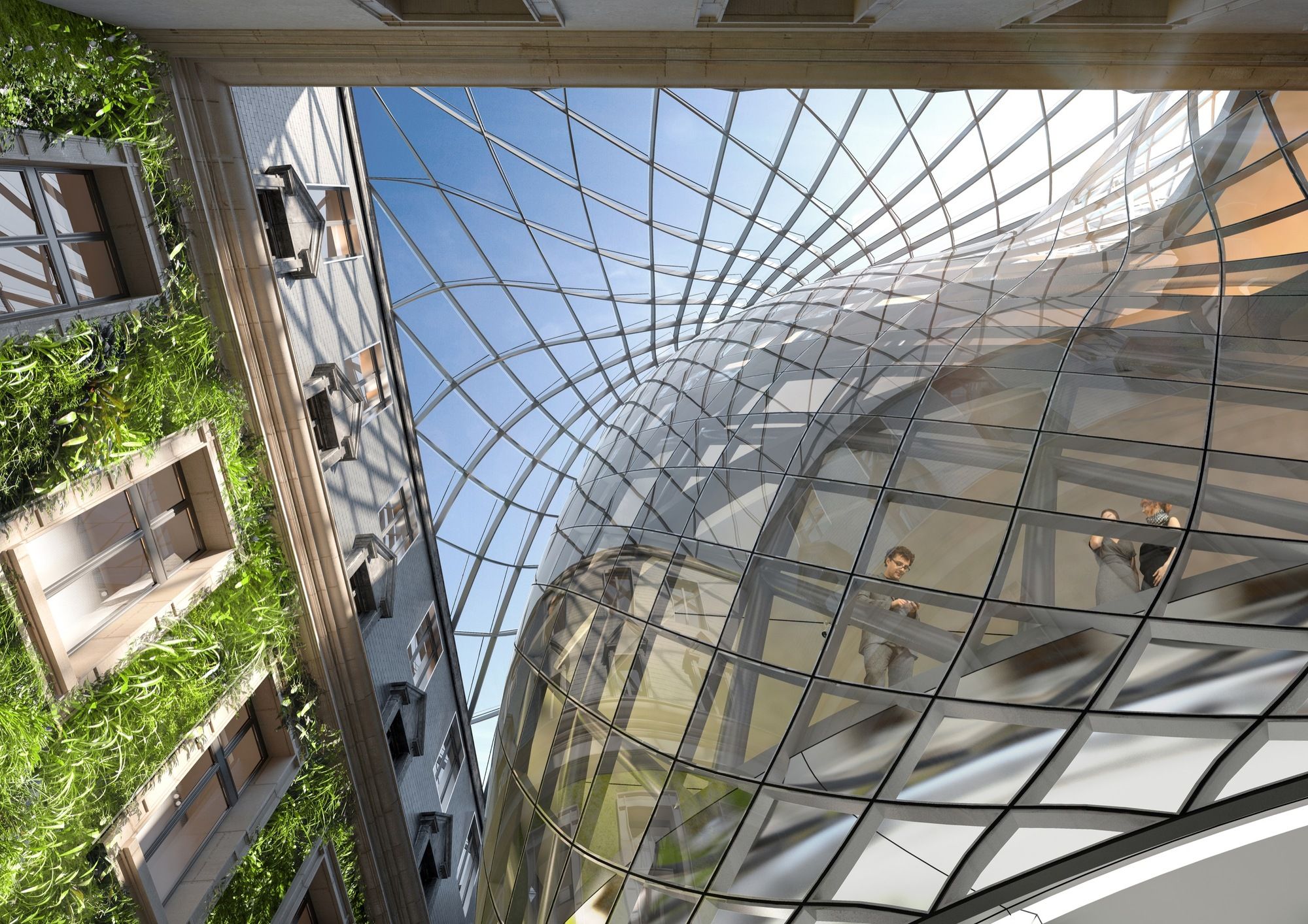 The architects have developed a chrysalis covered with a solar dome that conforms to the contours of the inner courtyard and is perfectly waterproof and airtight. This fusion of the chrysalis and the solar dome makes it possible to densify the mixed programming of the whole while offering comfortable, naturally, bio climatized spaces.