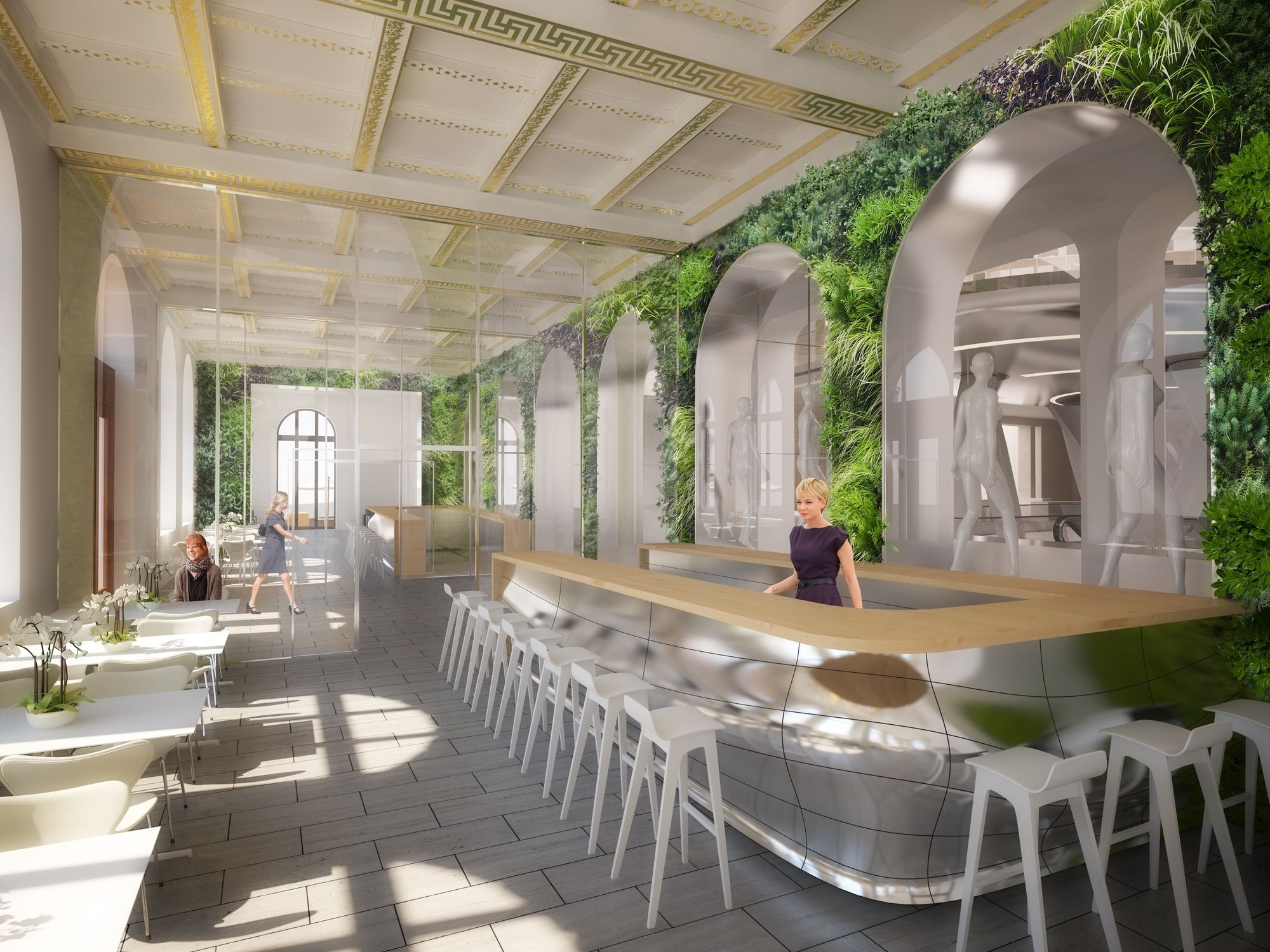 In the basement, a large, new generation Post-Store with a coffee shop takes place under a double height ceiling. It can be accessed using a structural glass staircase centered on the entrance to the main facade of the historic building.