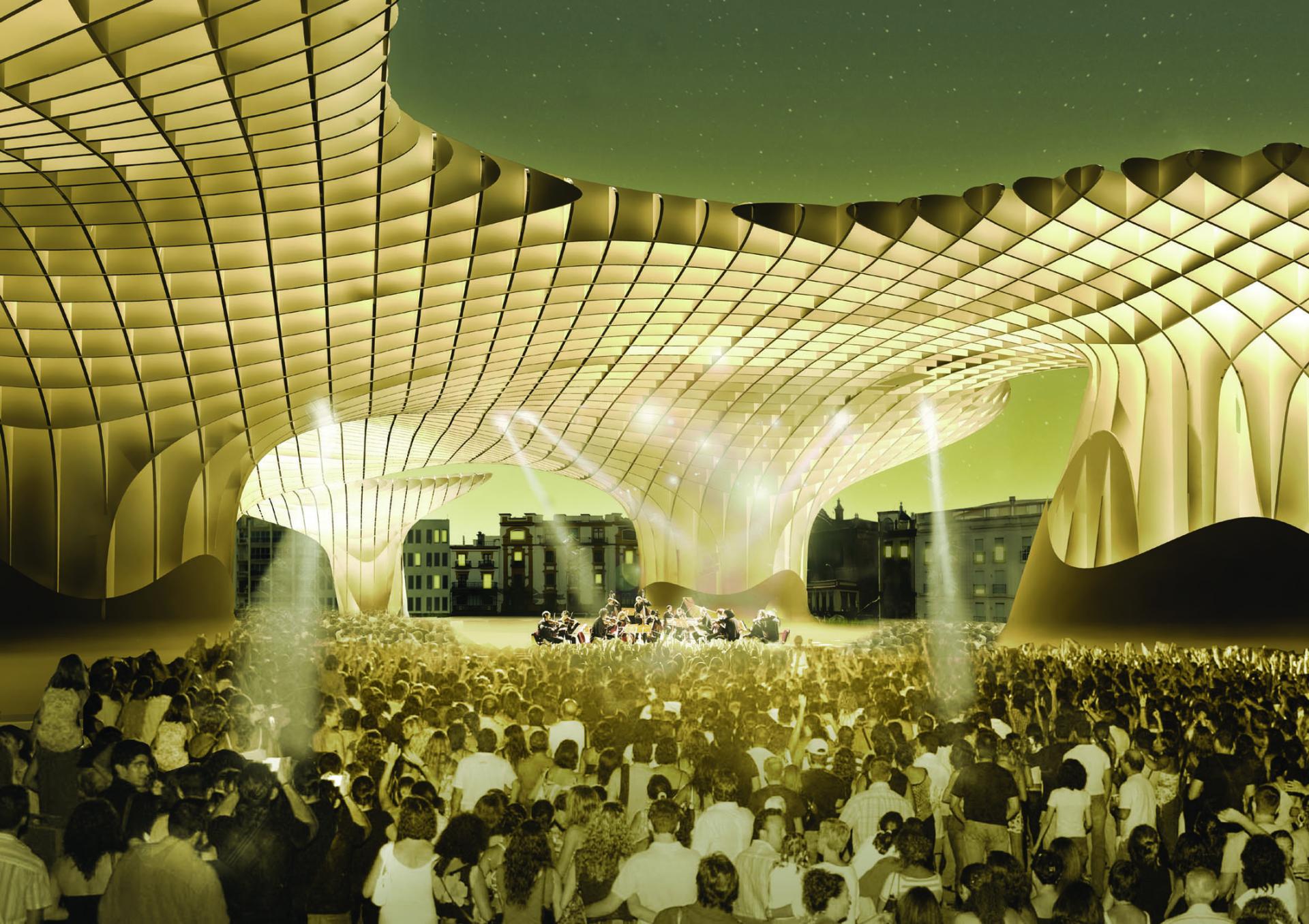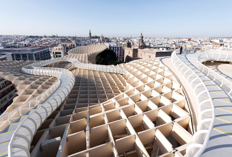 the Metropol Parasol is the winner of the competition for the redevelopment of the Plaza de la Encarnacion, and opened in April of 2011. The scheme offers an archeological museum, elevated plaza, farmers market, multiple bars and restaurants, as well as a panoramic view from a terrace atop the parasol.