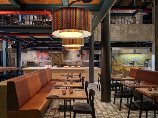 Another unusual and interesting feature is the blending of the restaurant space with the kitchen, where tortillas are baked, tacos are prepared, and dishes are grilled and cooked in a wood-fired oven right before the guests’ eyes. Ceviche is prepared in the fish tank section, with the individual ingredients almost within reach. The kitchen, like the large cocktail bar upstairs, has an authentic design and material solution, including a beverage display case that extends over the bar to another gallery.