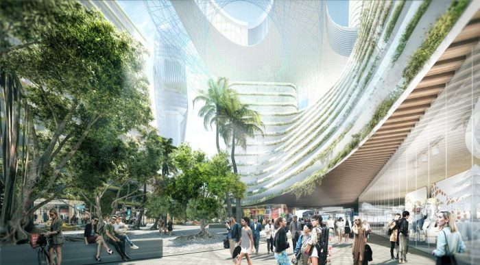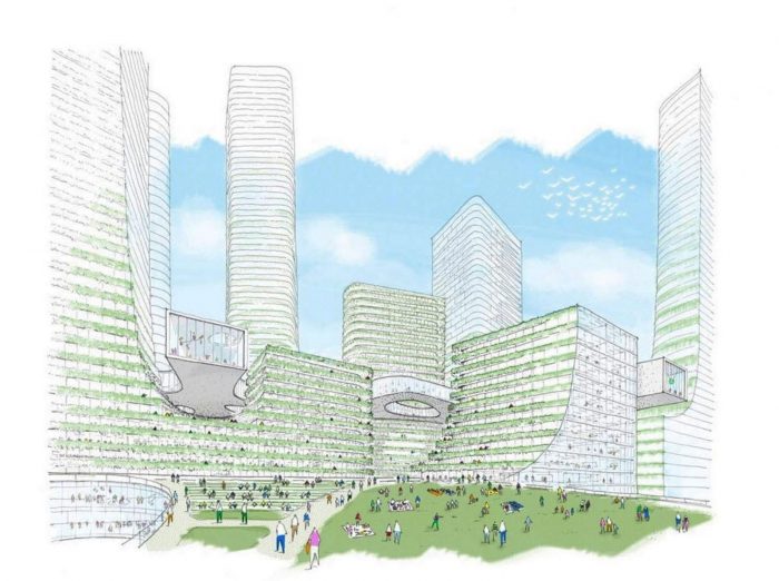 According to the designers, the whole development is designed and split up into two major levels, the horizon and cloud level. The first is an outdoor based green roof landscape, that includes social and cultural gathering spaces. The cloud level is designed to be floating up in the sky and create a network of spaces that connect the taller buildings at the height of 61 meters and above. It is will feature shared amenities such as daycare and tech support, informal collaboration and exhibition spaces and education facilities. “True innovation today requires the very thing that cities, at their best, have always provided: creative proximity,” the architects stated.