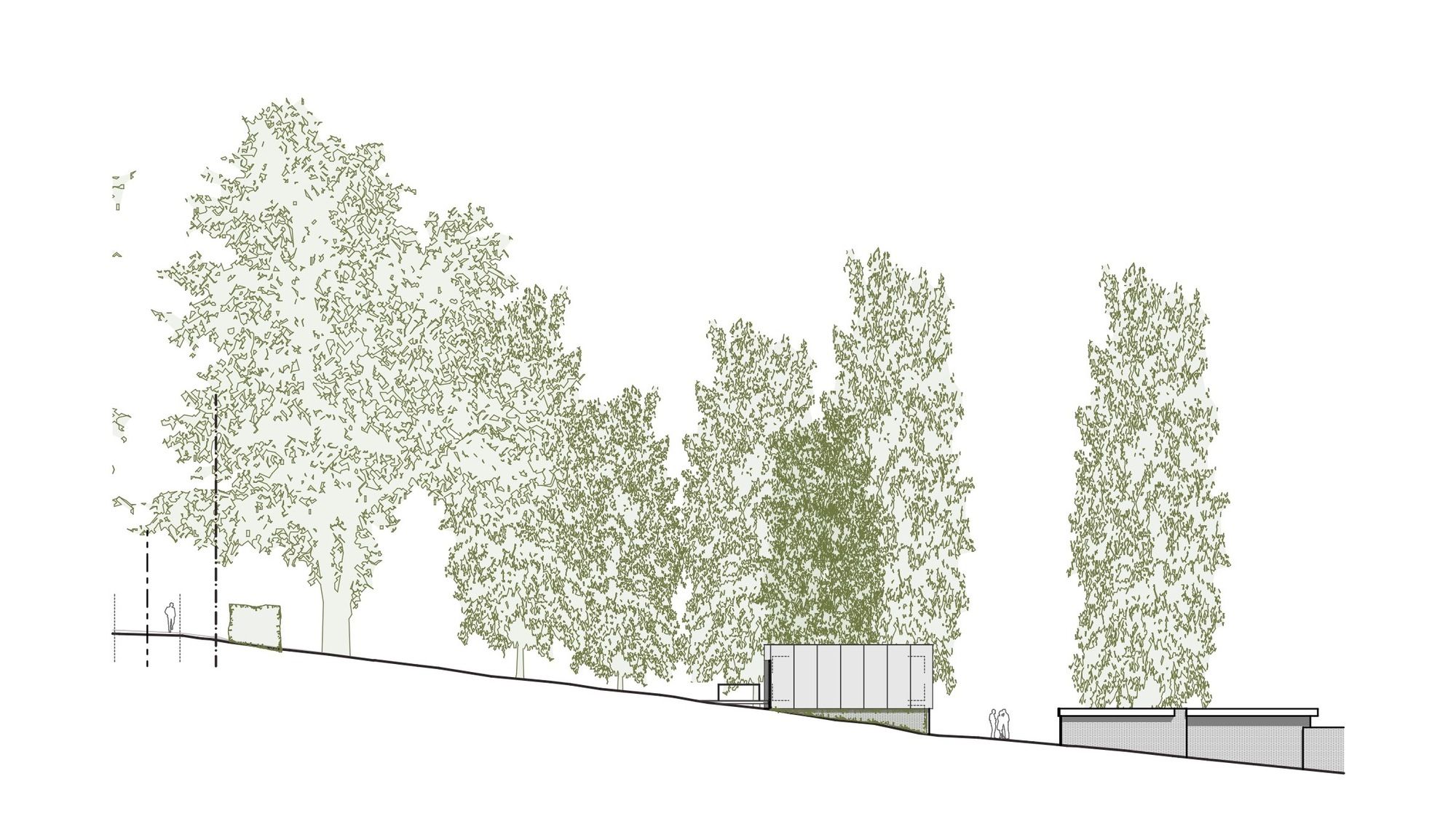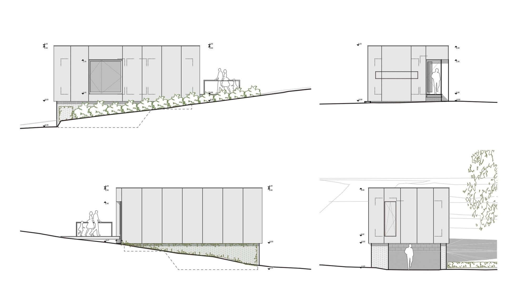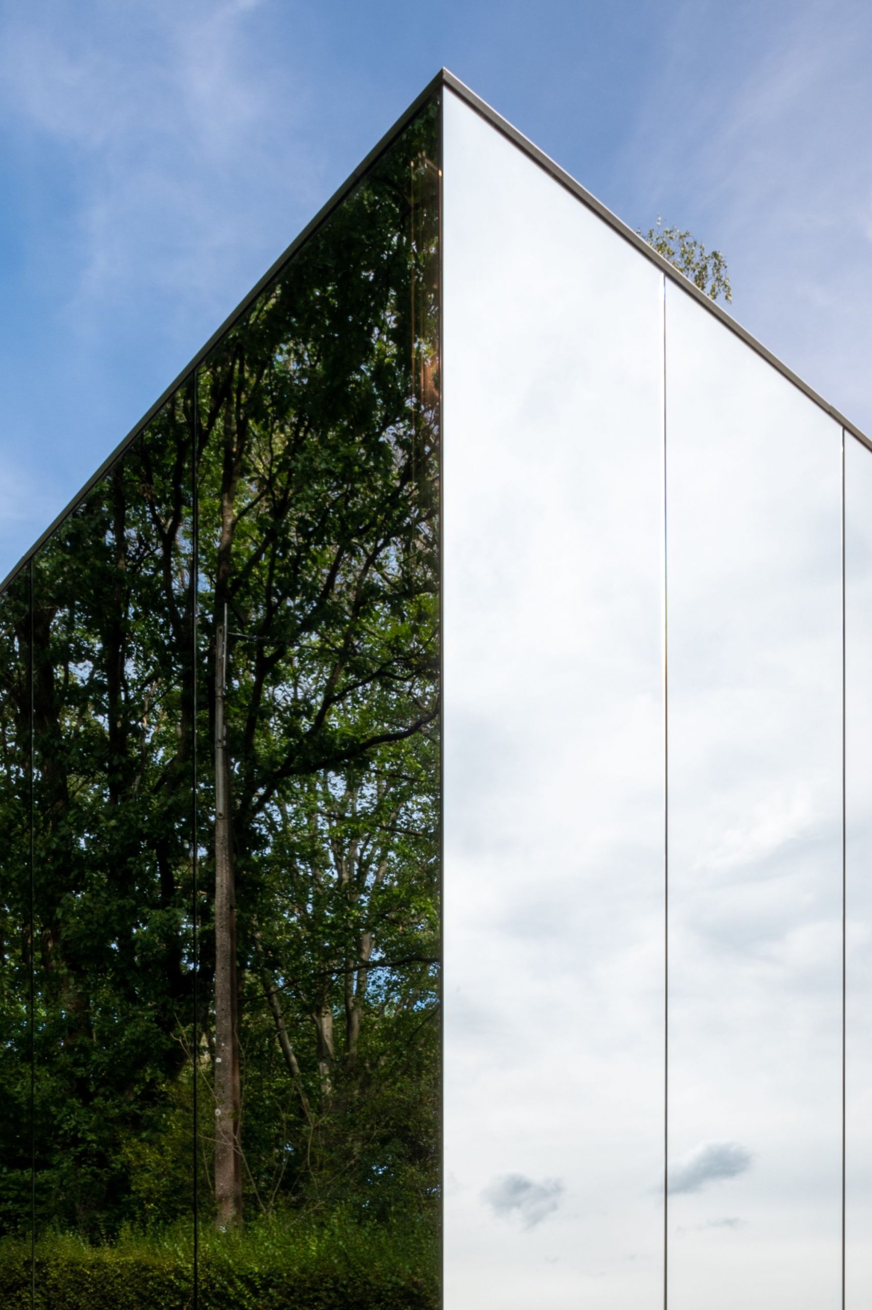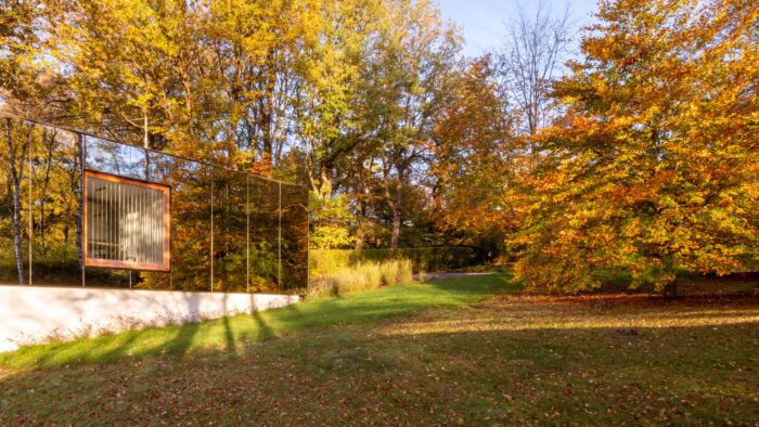 The project consists of the construction of a volume intended to house the spaces of an architect’s office, a meeting room, and technical premises. The volume is implanted in the extension of an existing house built in the 70s in a heavily wooded environment, from which it takes the architectural language for the base (painted bricks, masonry heads, height). Placed on this base, we find the “mirror box” that houses the professional functions. This volume is covered with mirrored skin in order to “disappear” in its environment.