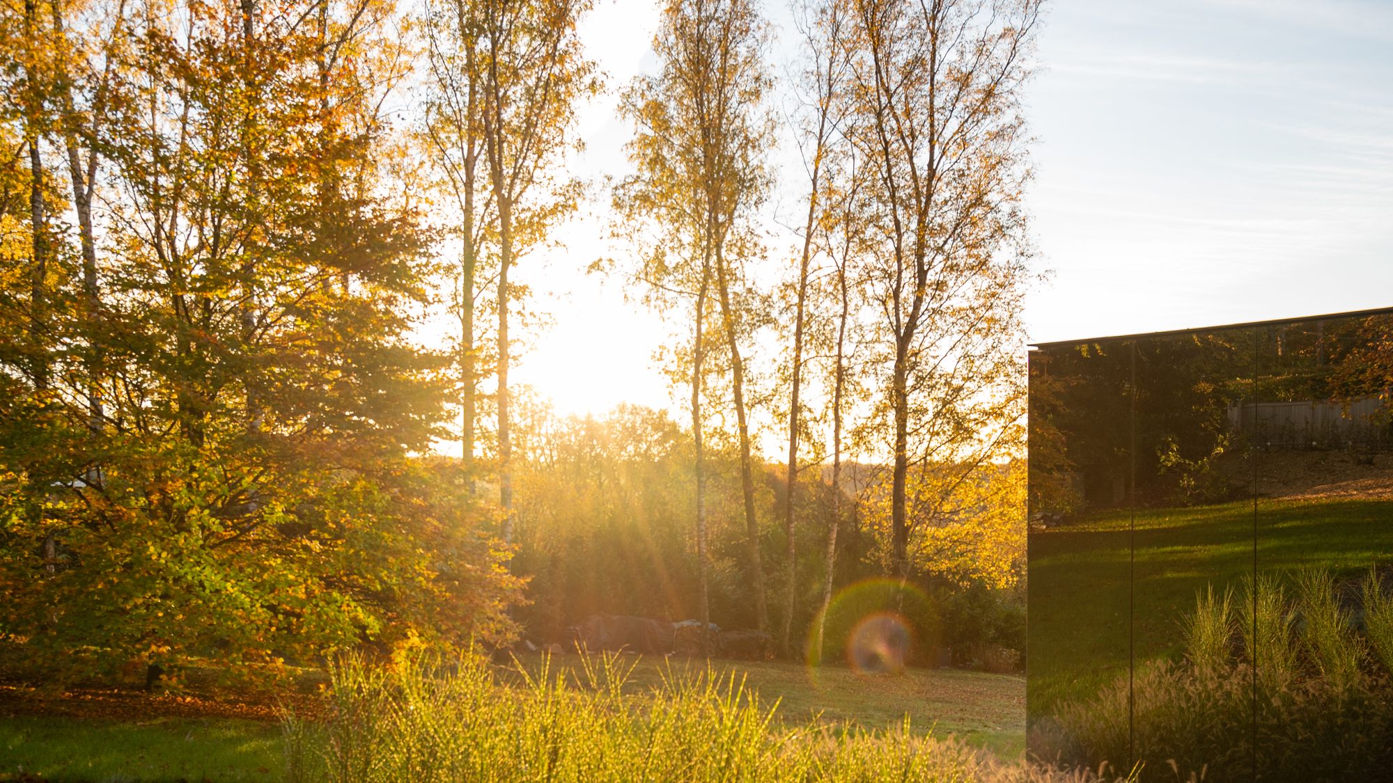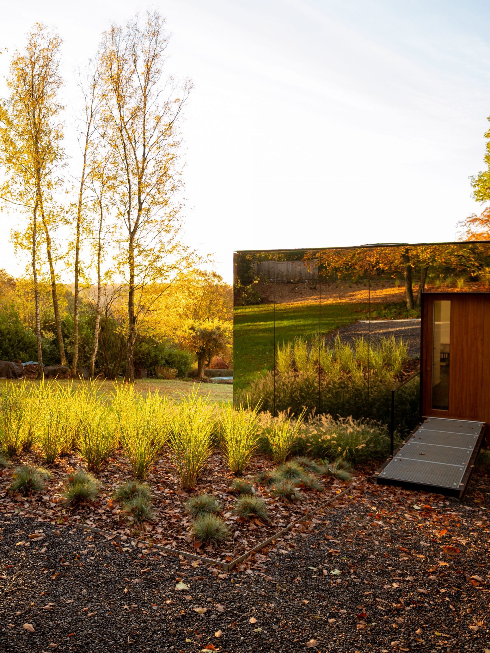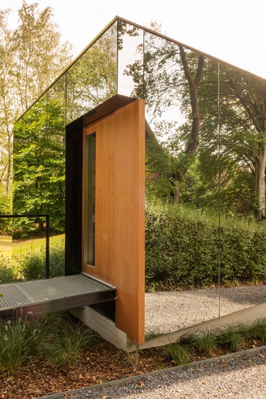 Access is via a metal grating walkway, floating above a cloud of grasses, which leads to a wooden door uncovered by the extrusion of the mirror skin on the northwest corner. From the workspace, the wide opening onto the garden allows to reduce the inner/outer limit and to feel immersed in the direct environment.
