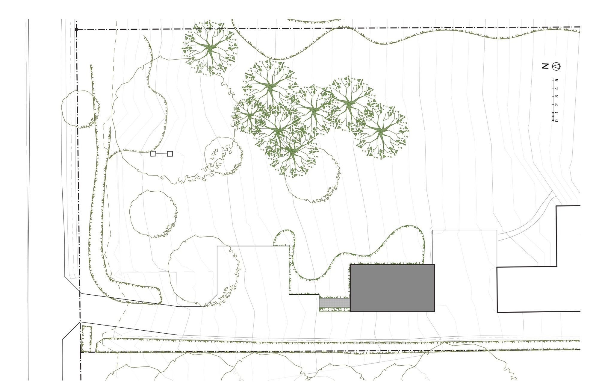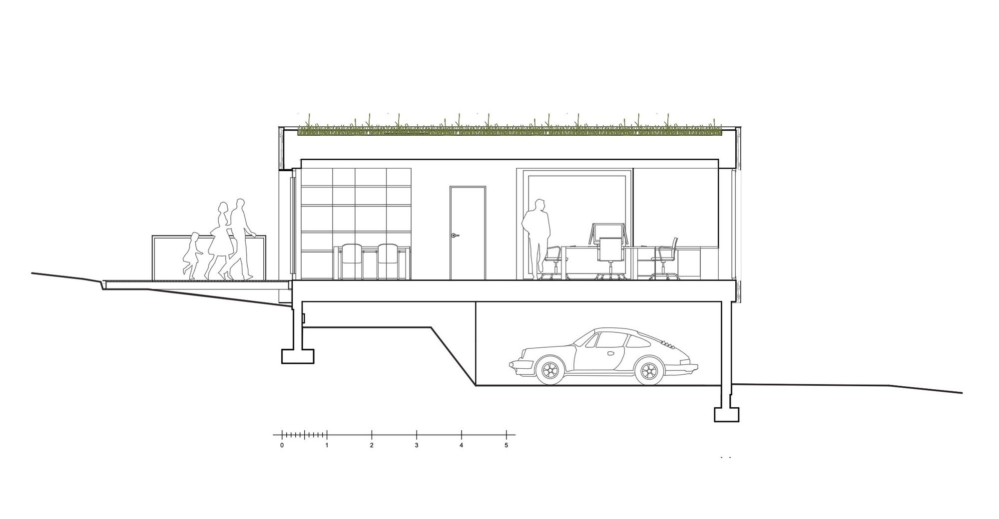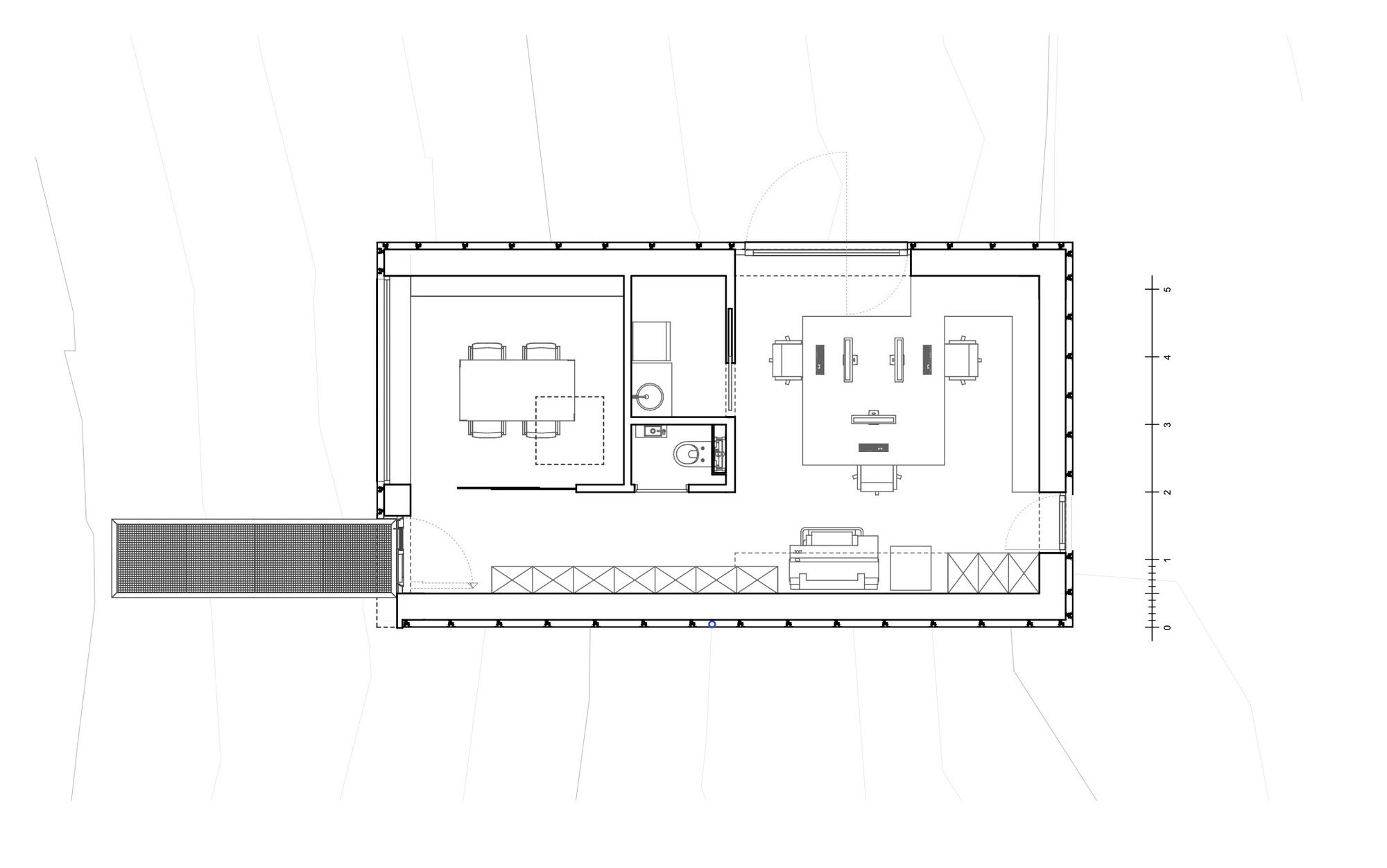 Access is via a metal grating walkway, floating above a cloud of grasses, which leads to a wooden door uncovered by the extrusion of the mirror skin on the northwest corner. From the workspace, the wide opening onto the garden allows to reduce the inner/outer limit and to feel immersed in the direct environment.