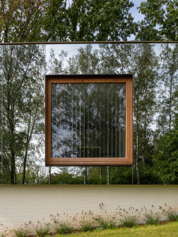 Thanks to the high reflection capacity of this cladding, the new building literally blends into the site. In an almost surreal way, the large square office bay gives the impression, from the garden, of immersion in the interior space, through a notch in the vegetation laid on a brick base. The other windows are hidden behind the translucent skin (SGG Mirastar® glass) and are only visible after dark.