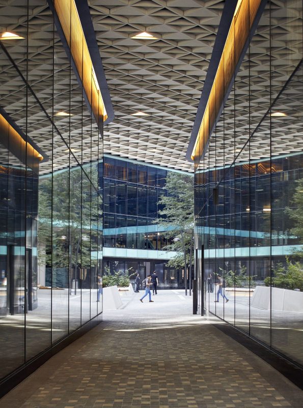 The building’s facade comprises 3D panels and patterned glazing which allow daylight into the office spaces while optimizing solar shading. The glass is complemented by a copper cladding that acquires a patina over time, in reference to local design traditions.