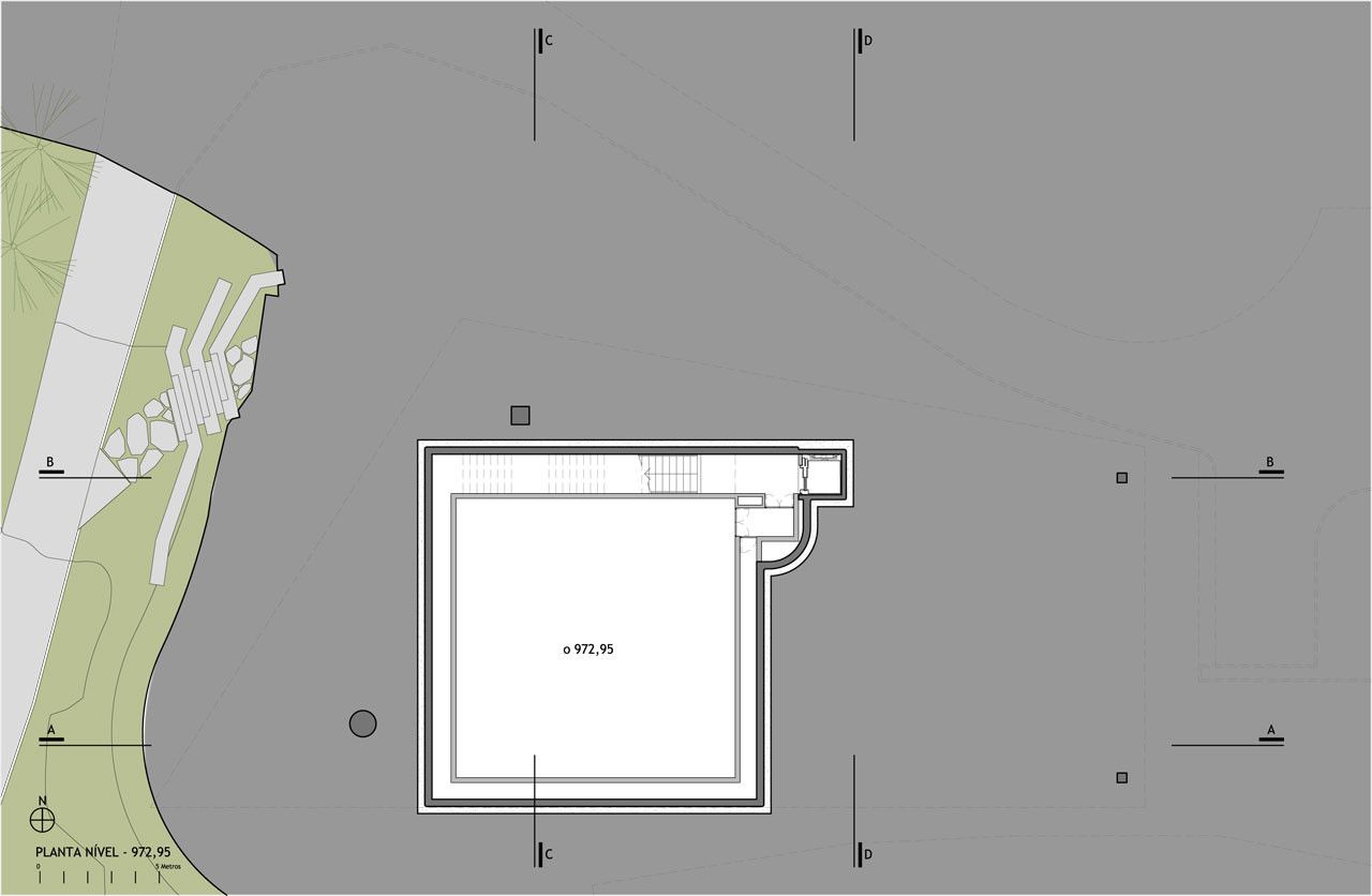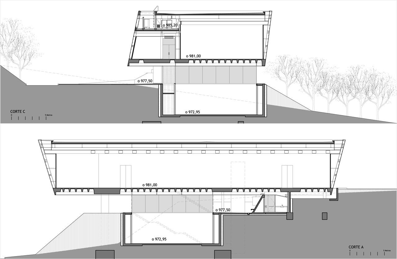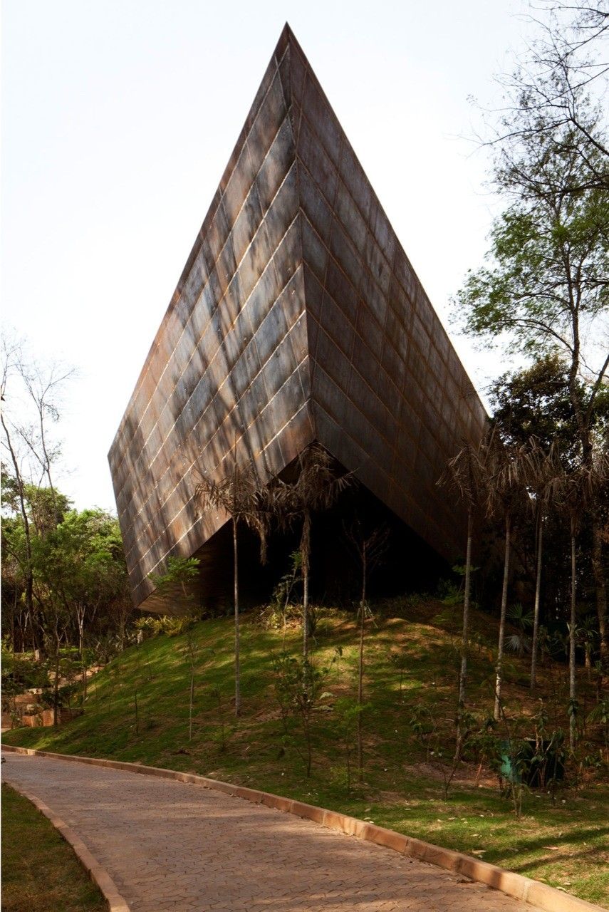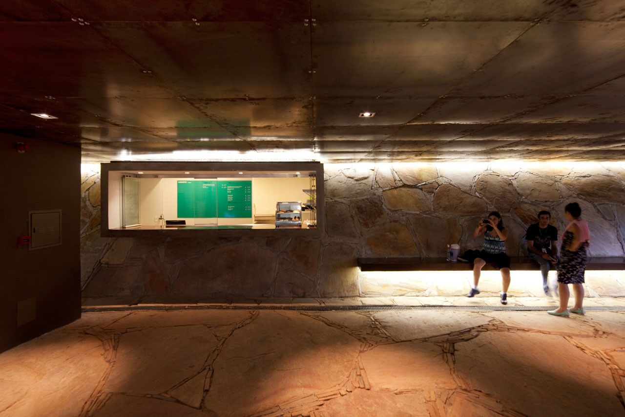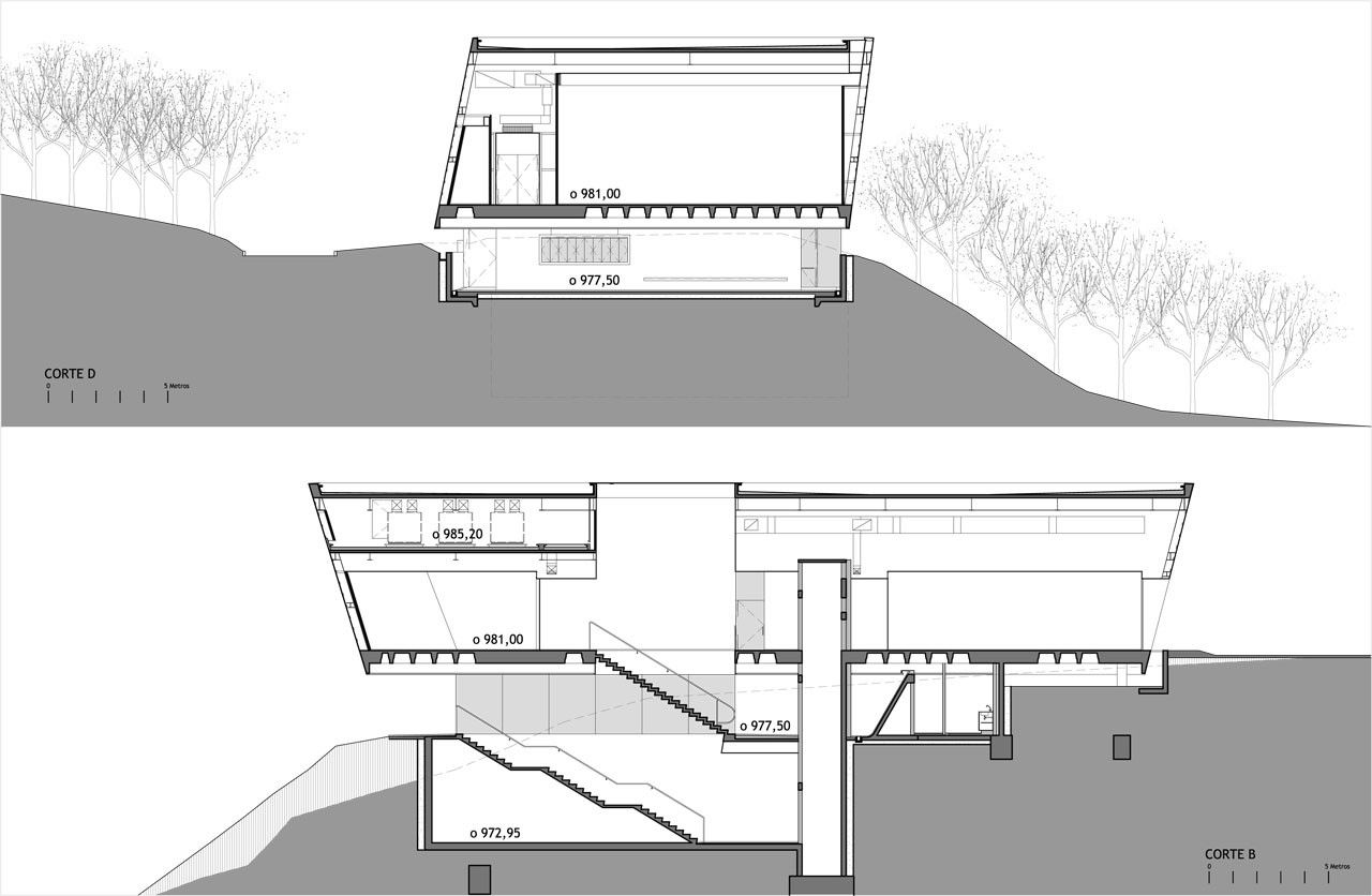 Miguel Rio Branco Gallery designed by Arquitetos Associados, Located in a sloped site surrounded by the forest, this pavilion redesigns topography to diminish the visible mass of the building while defining a cantilevered structure that visually floats over the terrain. An entrance area is defined in half level with the two main exhibition spaces.