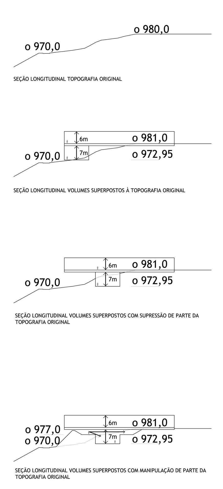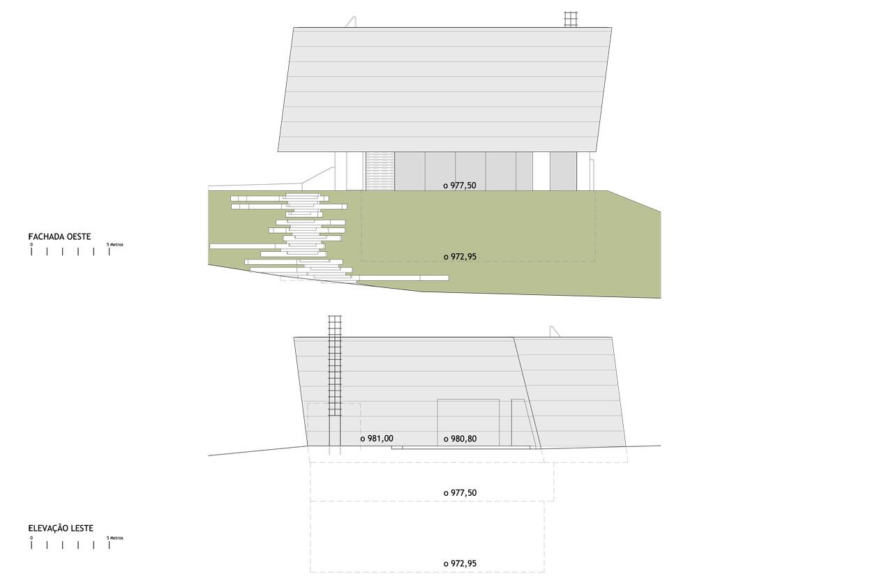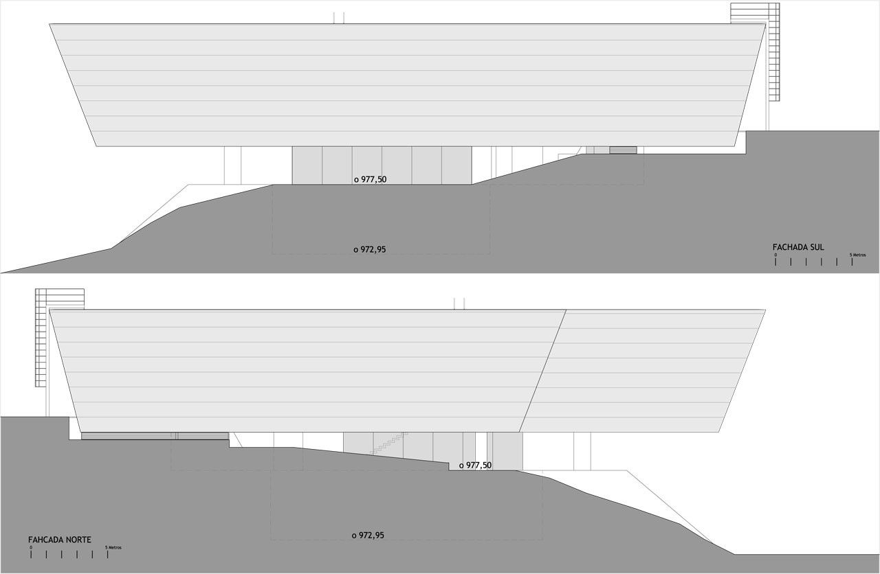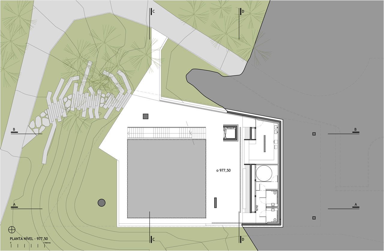 Miguel Rio Branco Gallery designed by Arquitetos Associados, Located in a sloped site surrounded by the forest, this pavilion redesigns topography to diminish the visible mass of the building while defining a cantilevered structure that visually floats over the terrain. An entrance area is defined in half level with the two main exhibition spaces.