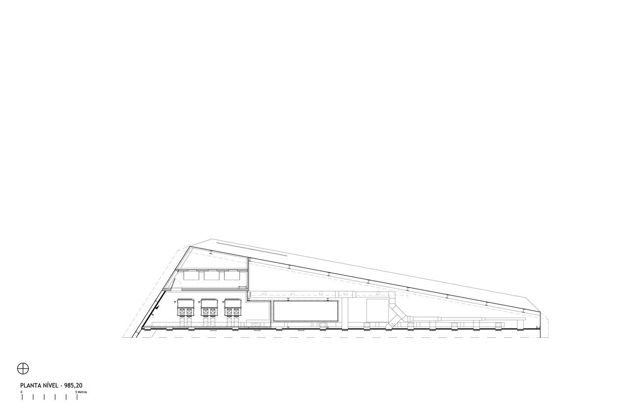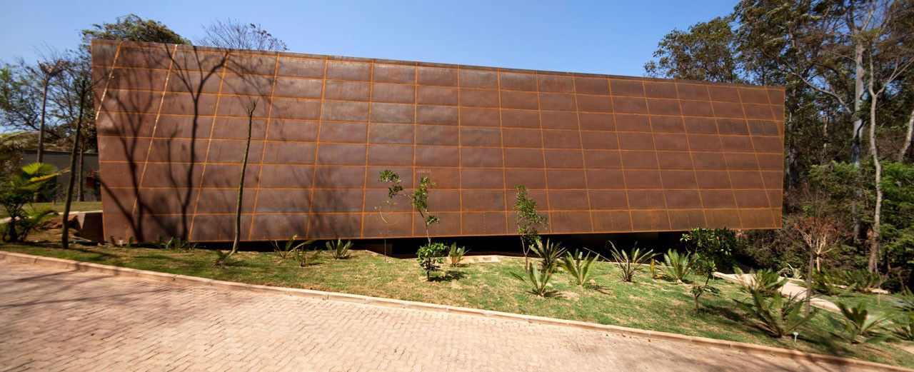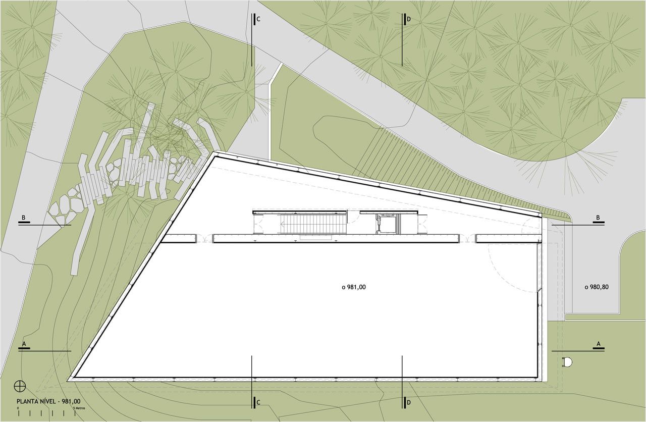 Treated as a continuation of the exterior area, the covered plaza configures a transitional space that organizes flows, houses facilities and allows visual interaction with the underground square room, located 4.5 meters below. The other exhibition space, on the other hand, is a closed regular pavilion on the upper floor, defined by the corten steel volume. This dominant formal element, built with a steel structure that allows maximum flexibility for the interior spaces, presents some subtle formal distortions that allow the creation of linear skylights along the main walls.
