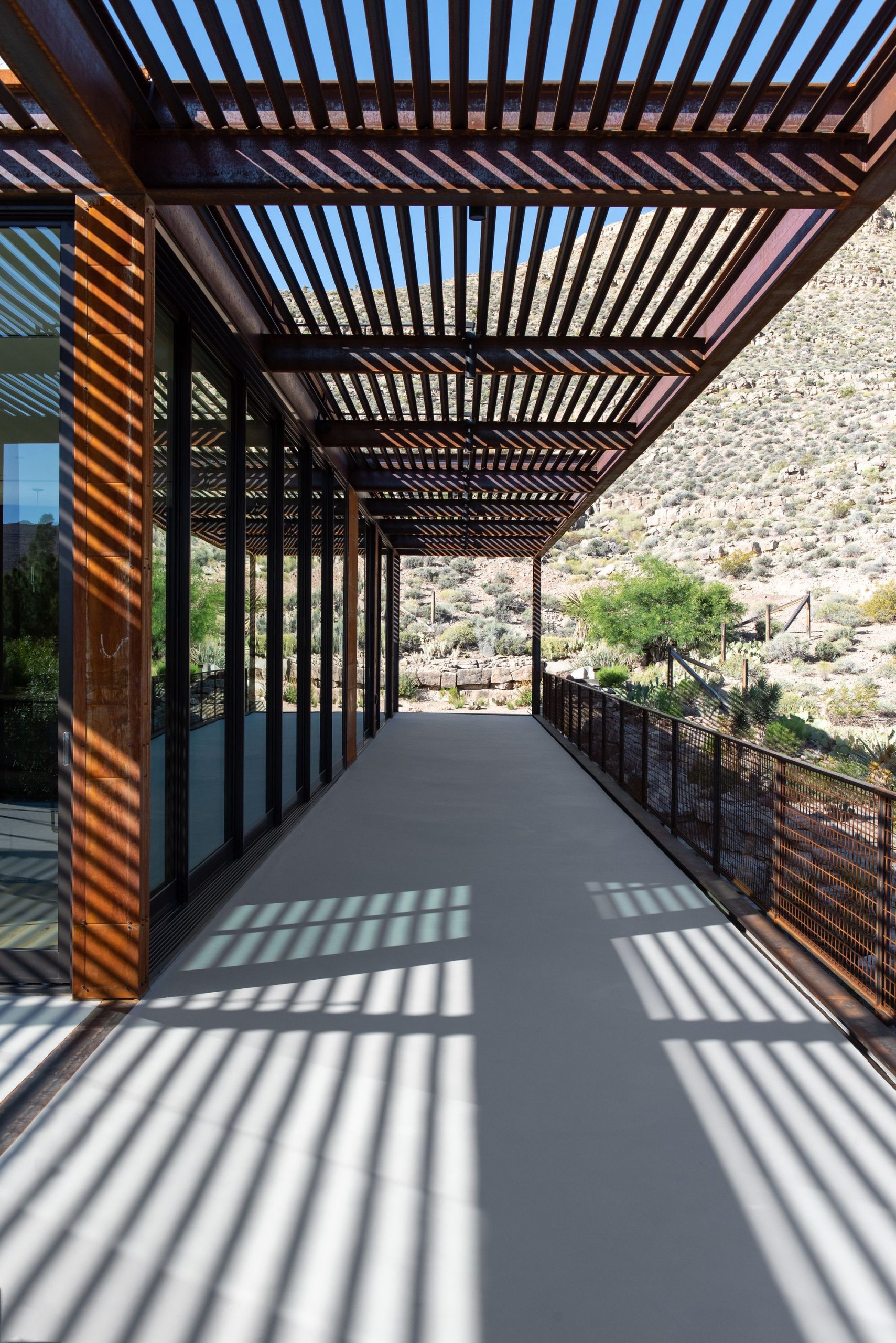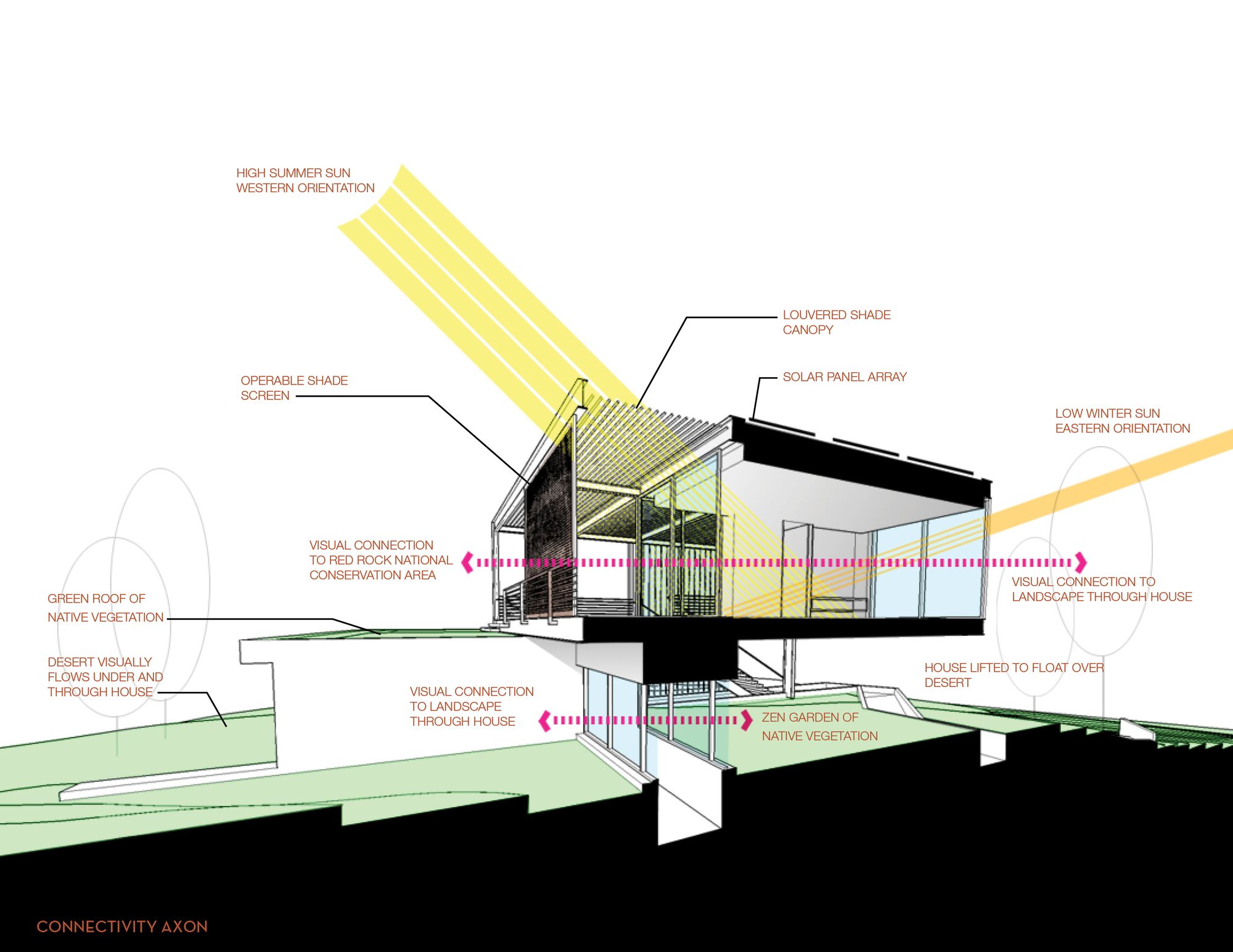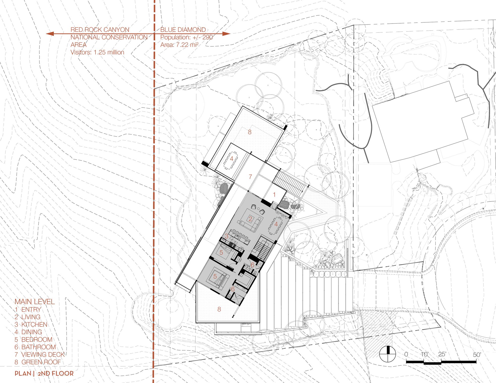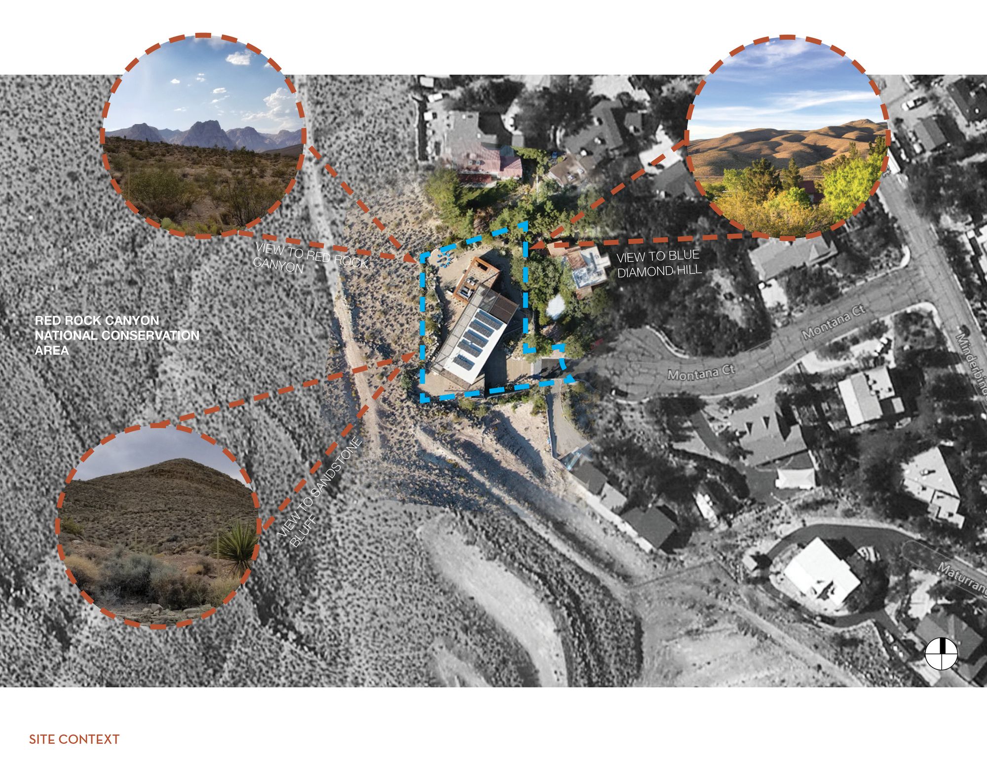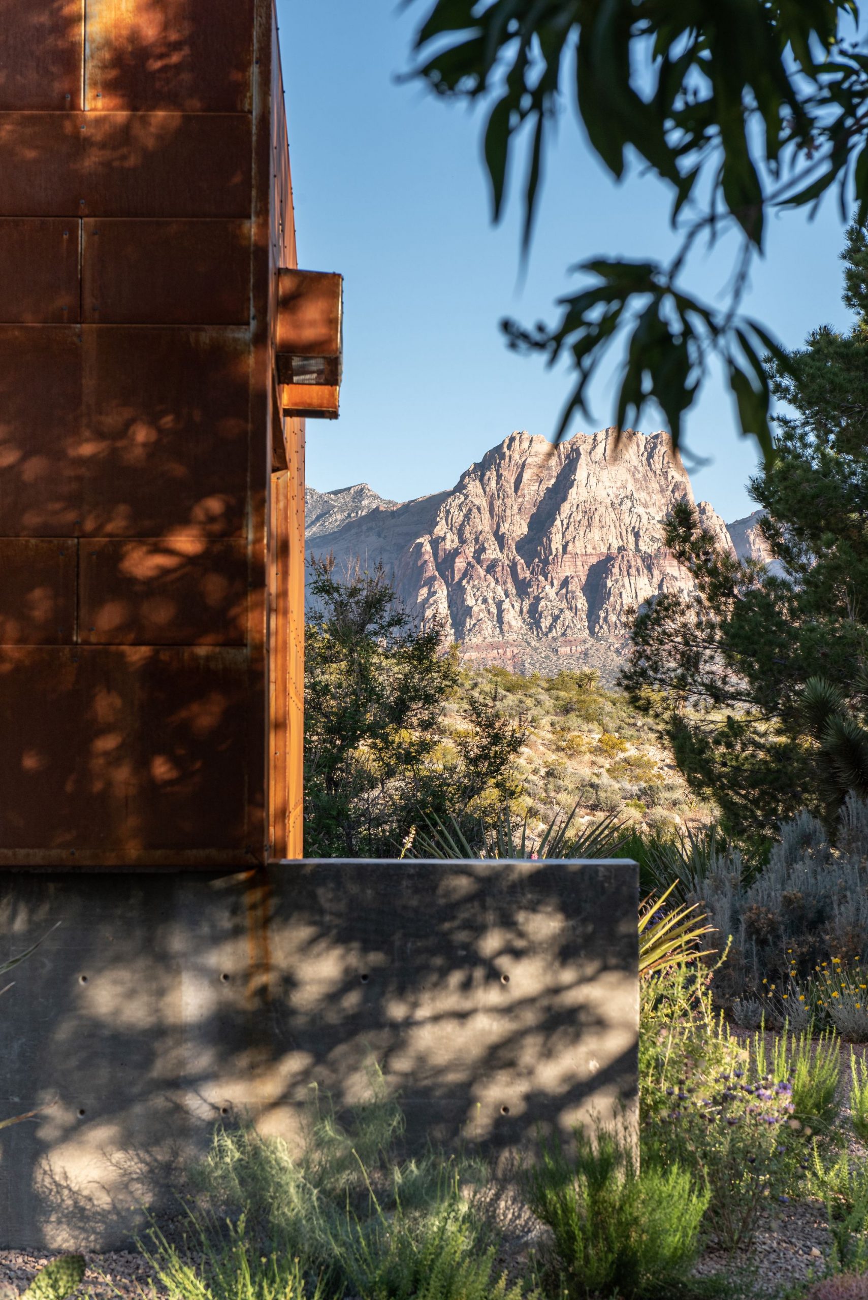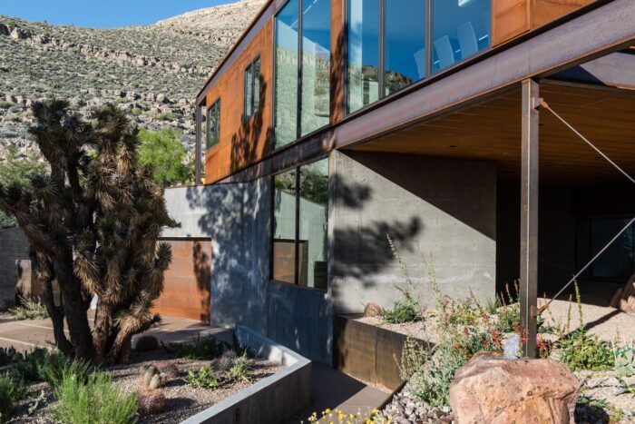 The site for minimum/maximum is one of those rare diamonds in the rough. Upon first viewing, the site seems cluttered in a maze of flora as it is layered with beautiful native plants and trees, but when one looks beyond that, it becomes clear that the site has some of the most panoramic and unobstructed views of Red Rock Canyon and Sandstone Bluff that one could ever hope for.
