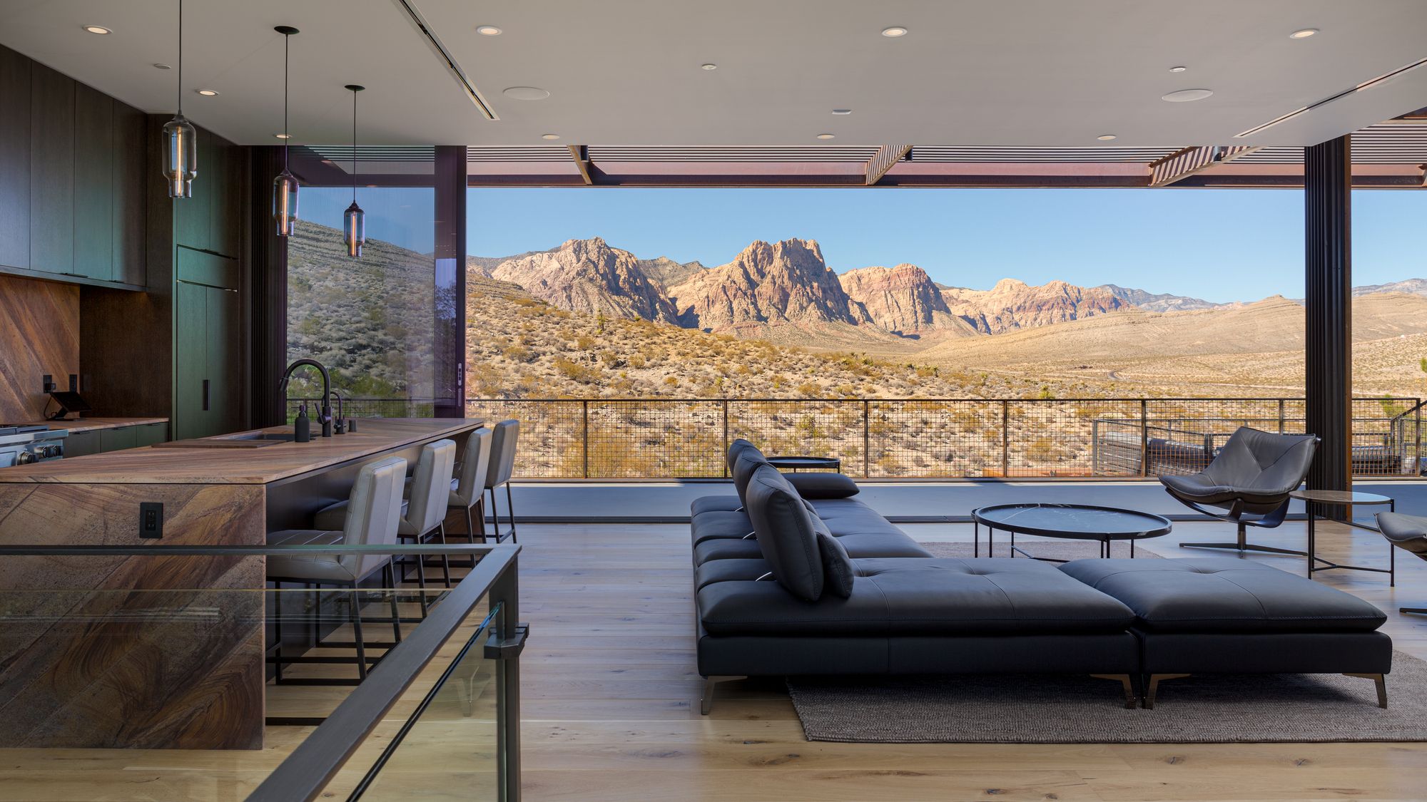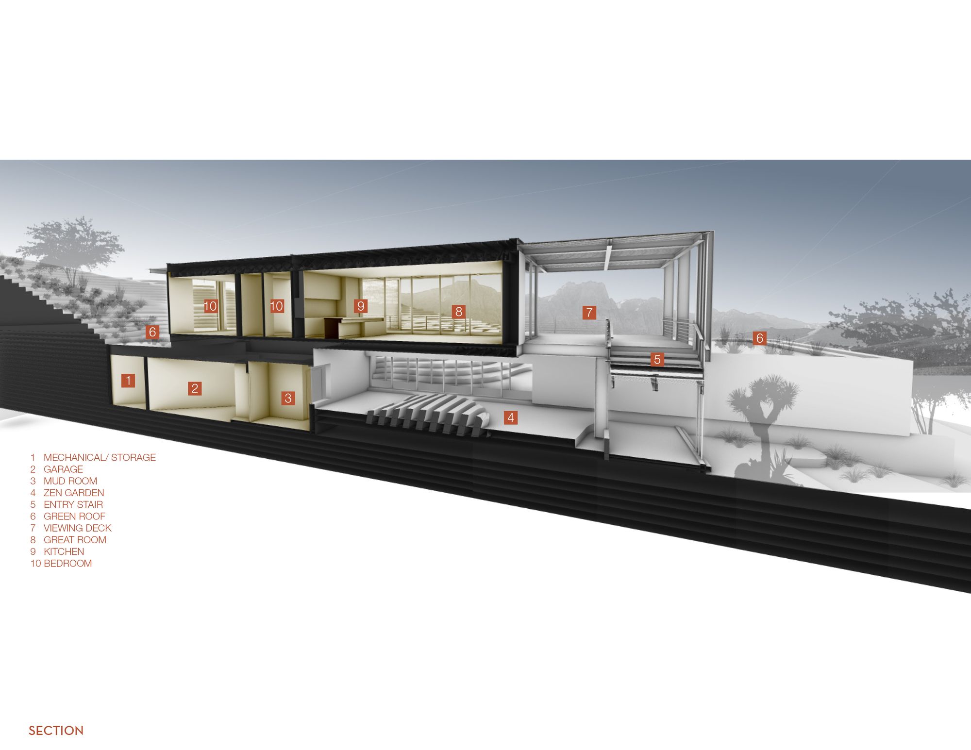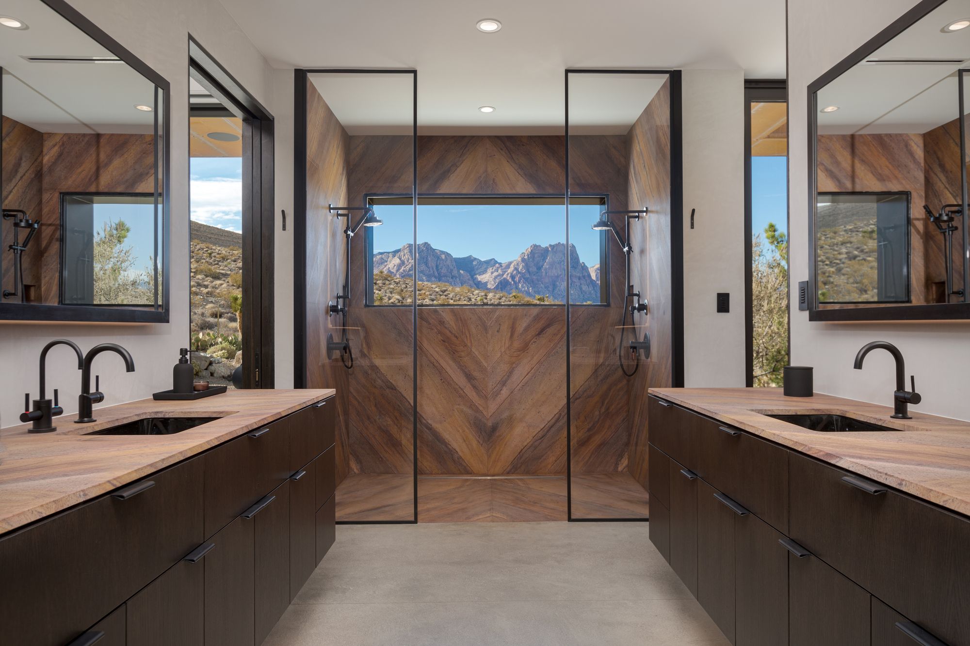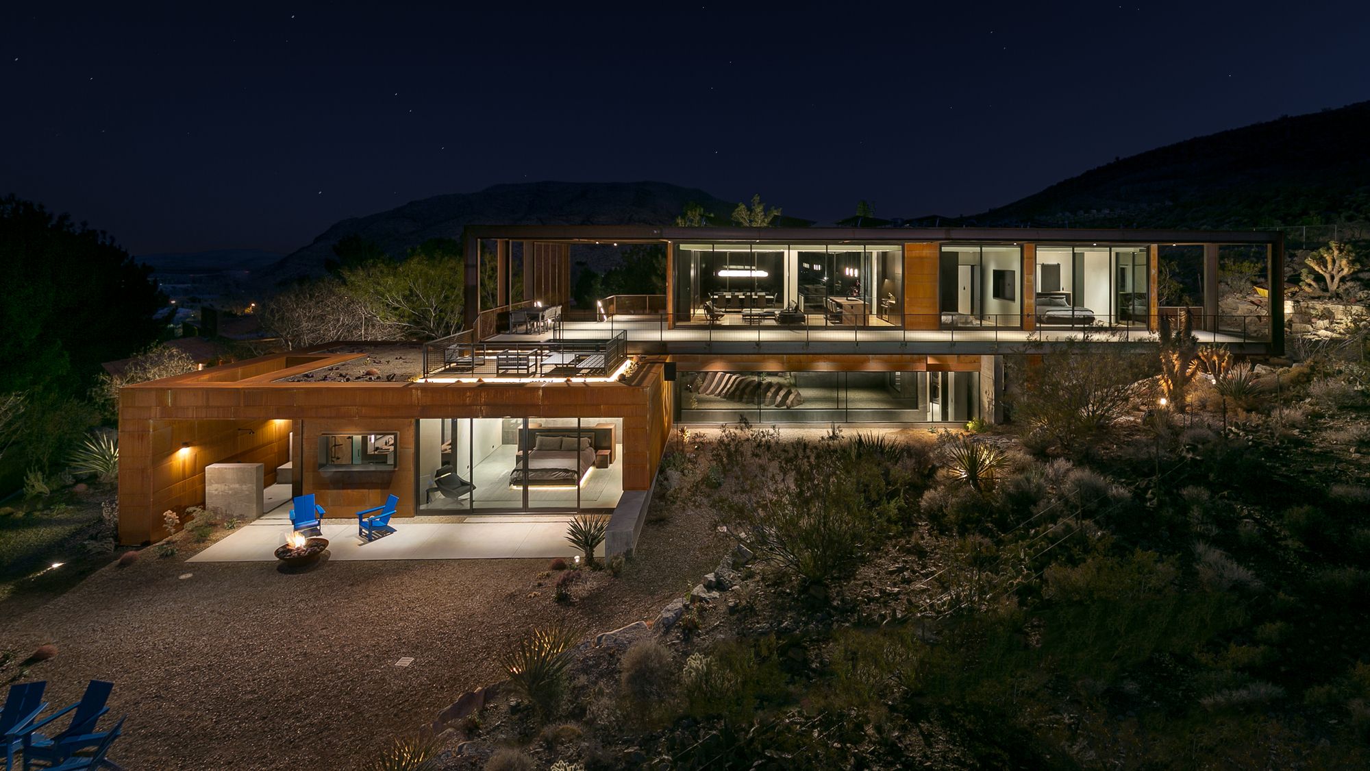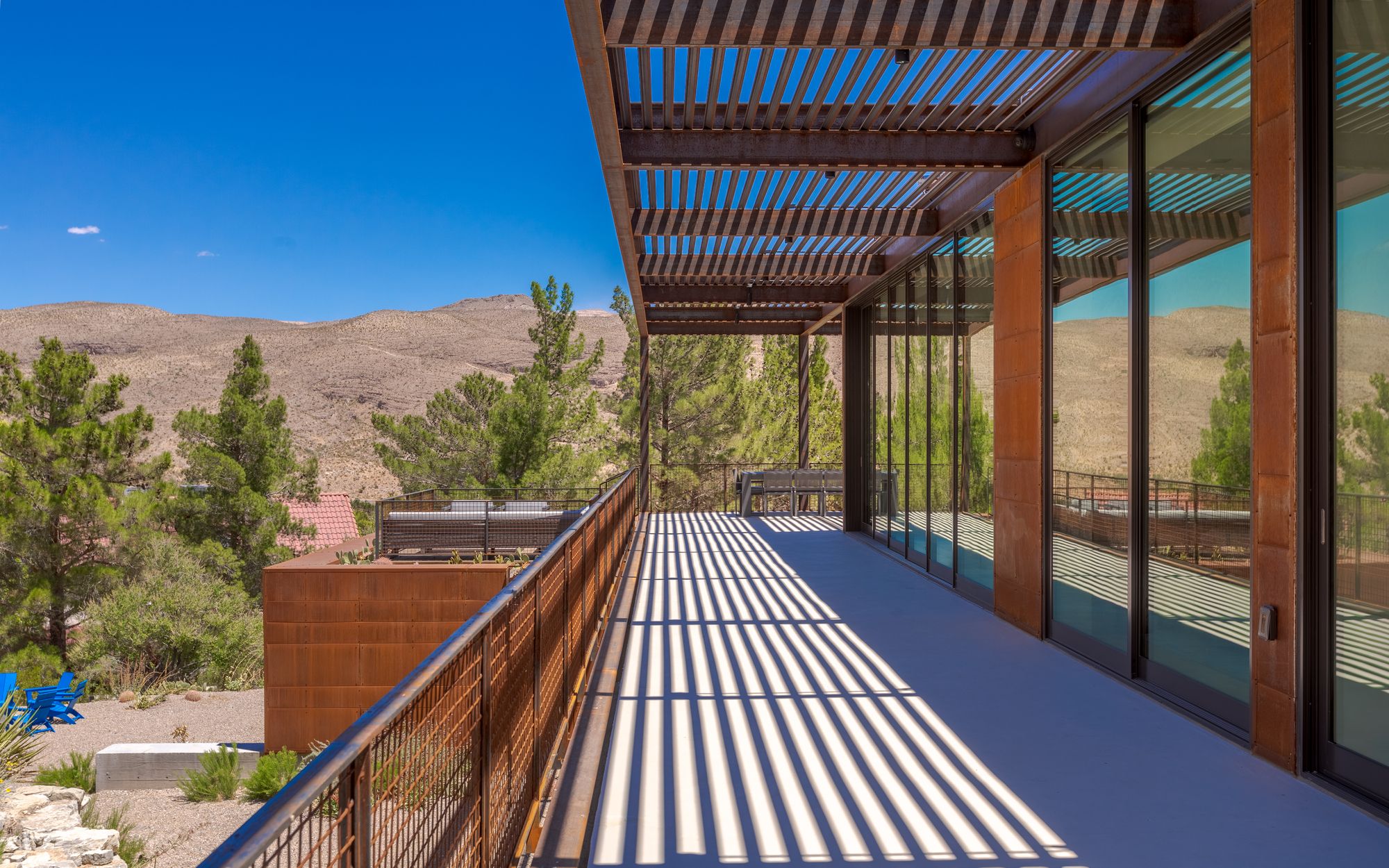 The site for minimum/maximum is one of those rare diamonds in the rough. Upon first viewing, the site seems cluttered in a maze of flora as it is layered with beautiful native plants and trees, but when one looks beyond that, it becomes clear that the site has some of the most panoramic and unobstructed views of Red Rock Canyon and Sandstone Bluff that one could ever hope for.