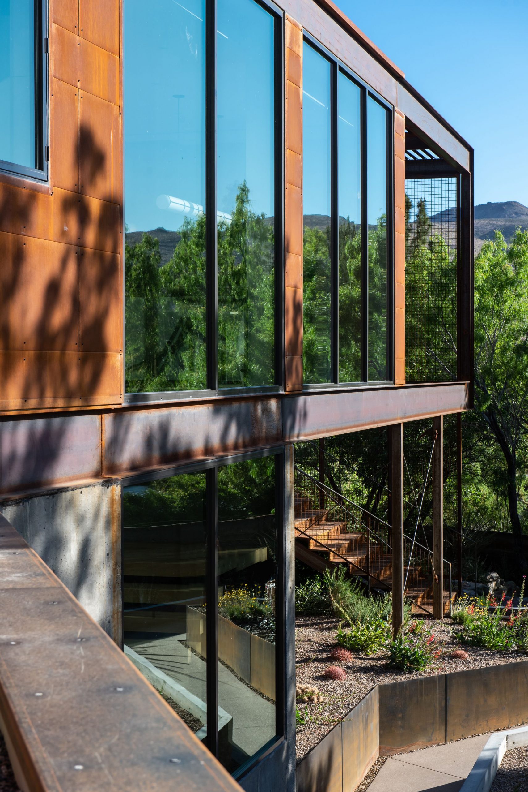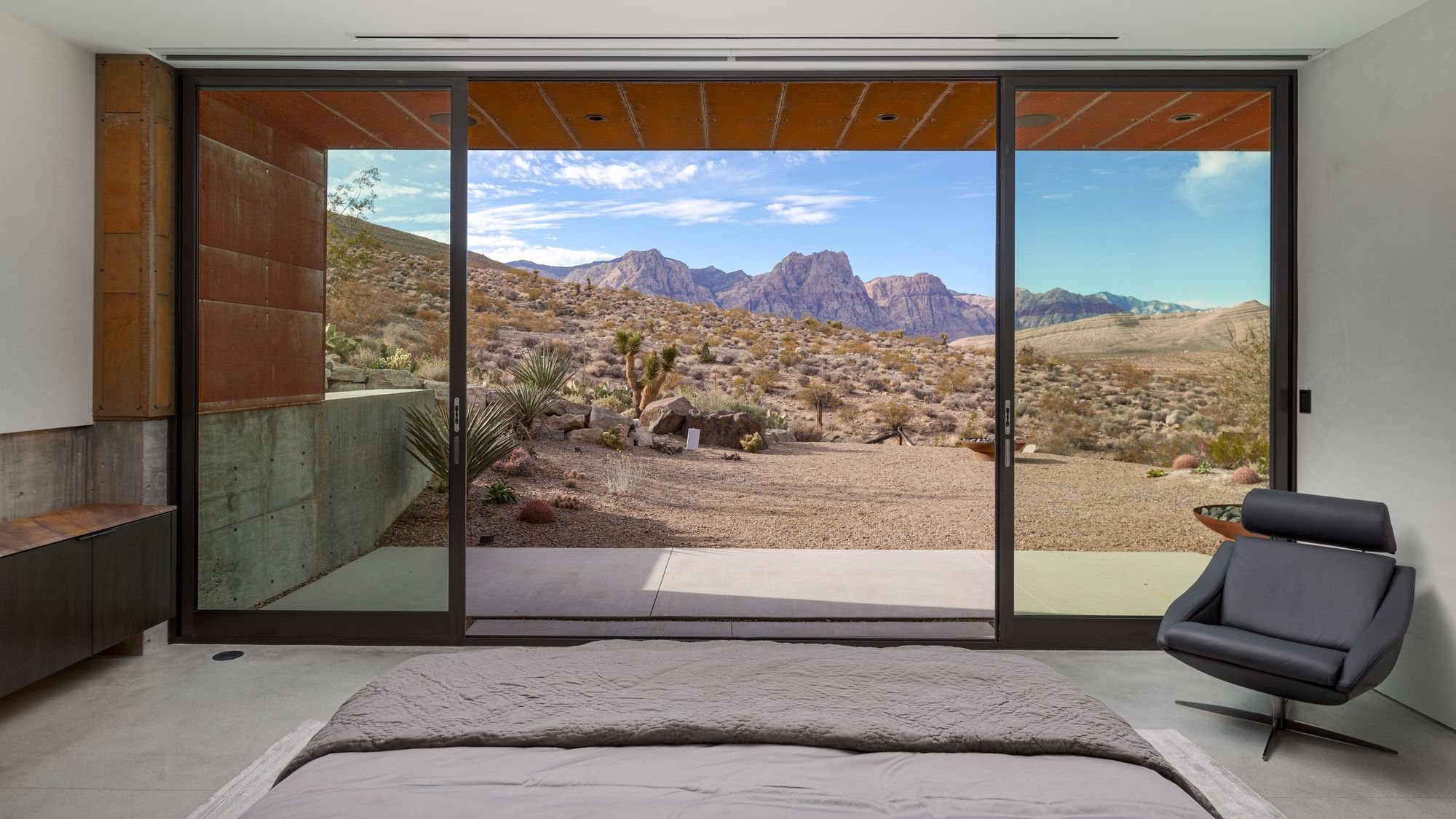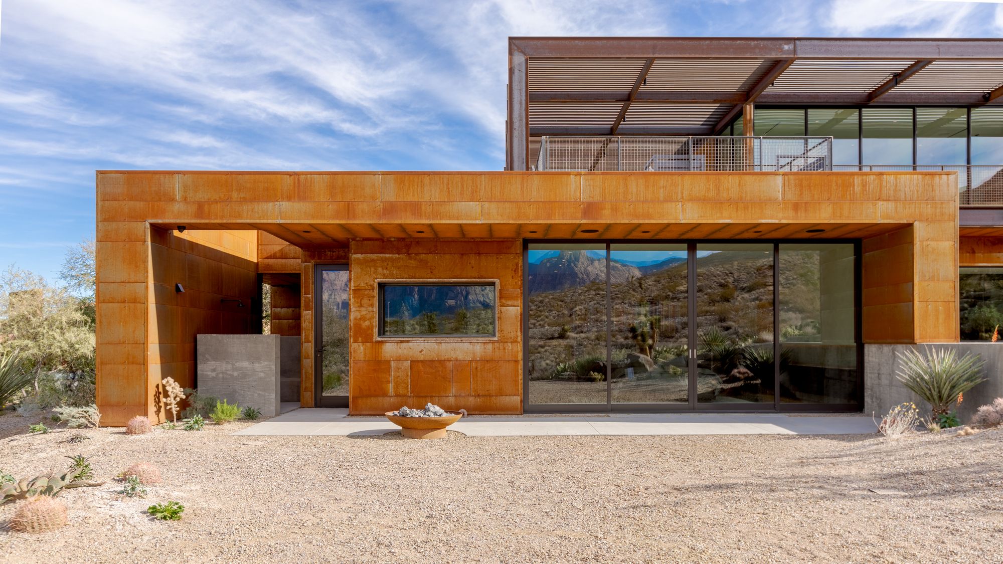 Key Materials – Concrete (smooth face) and Weathered steel (or known as COR-TEN). The primary materials were chosen for their straightforward approach to construction, durability, and relevance to the desert environment. The natural patina of the materials will complement the existing site and contrast the minimal architectural design of the home.