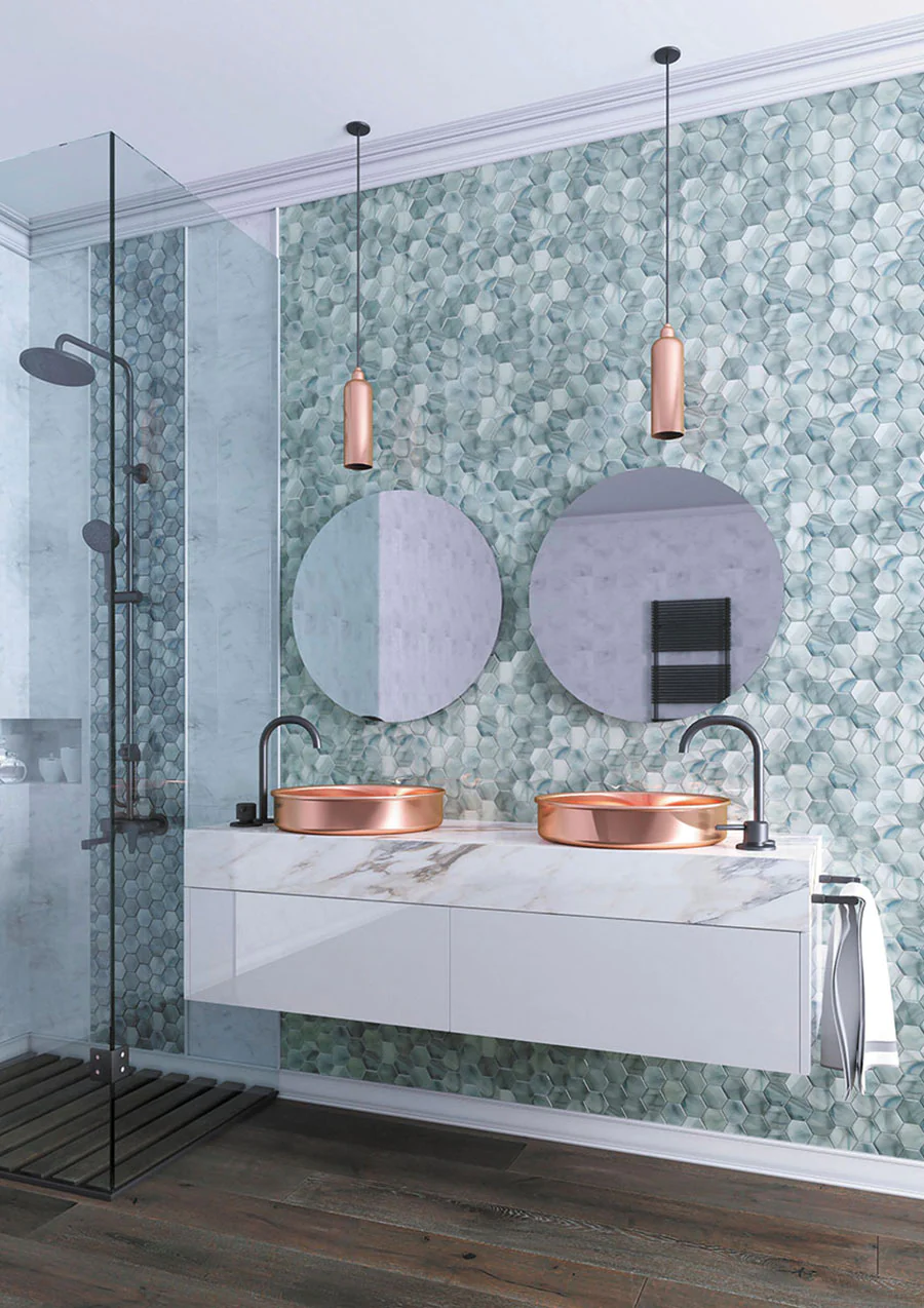 Minimal and uncompromising, sleek and cutting-edge. The brass fittings in this ultra-contemporary bathroom are to die for. Copper’s understated gleam warms up the otherwise icy minimalism of the space.