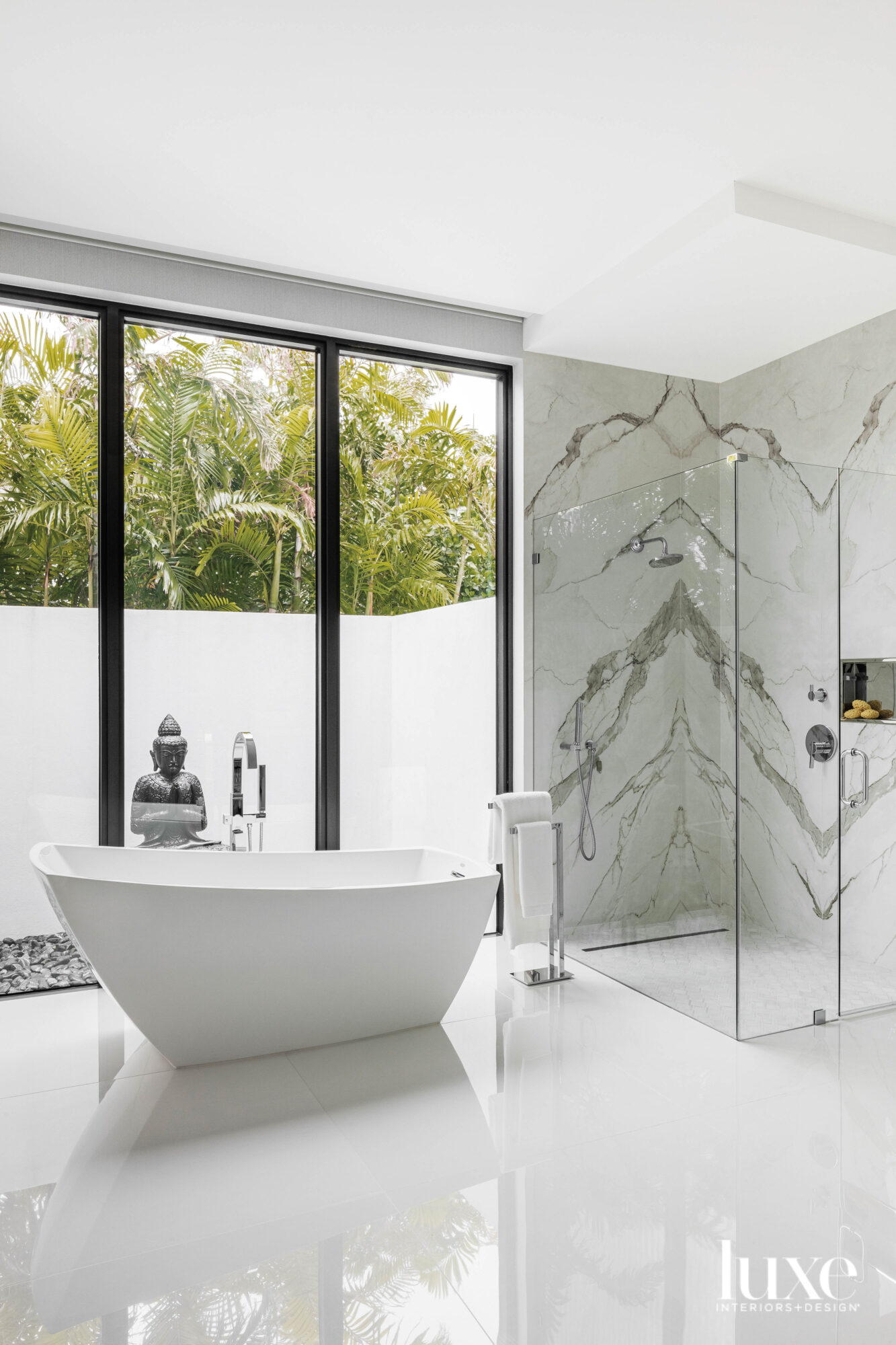 Elegant and timeless, simple and understated. When working with the finest materials, minimal embellishment is required. This bathroom’s polished marble floors and walls are complemented by a glass window providing a view of the garden’s natural beauty. Lighting and other fixtures are kept understated so as not to detract from the exquisite atmosphere.