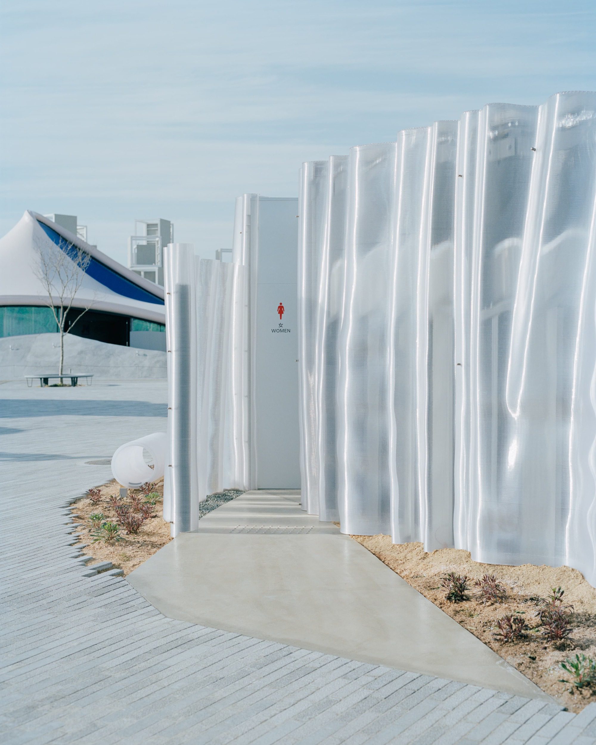 Mirage in Yumeshima, This project is a public restroom for the EXPO 2025. In response to the context of a plaza surrounded by iconic architectural landmarks, this structure was conceived not as a clearly defined form, but as something that recedes into the background—an architecture that allows only the phenomena of its surroundings to come into focus.