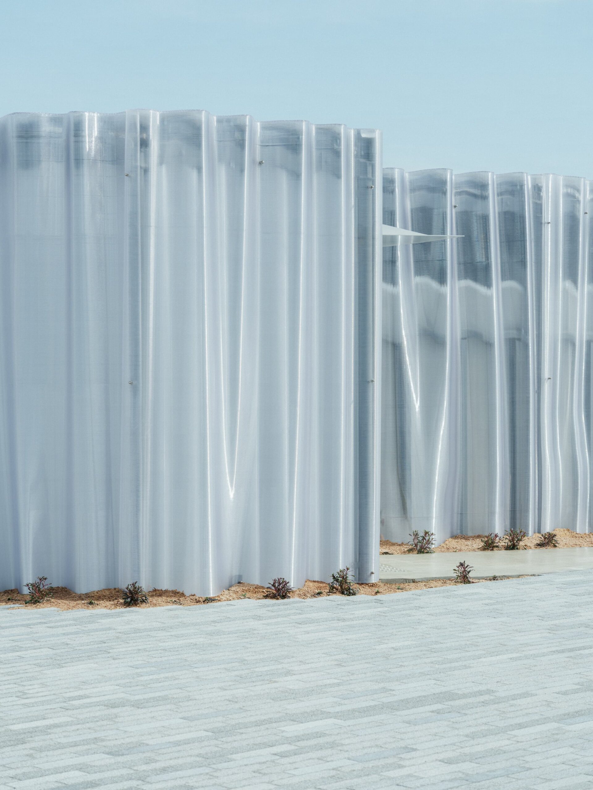 The wave-shaped 3D-printed panels inherently contain distortions from the fabrication process, which are intentionally embraced as part of the architectural expression. The 3D-printed panels, which combine reflectivity and translucency, intricately capture surrounding light, allowing the building’s presence to emerge through its relationship with the environment. Appearing only during the exhibition, this architecture then continues its journey to another place. Veiled in transient light, it evokes a mirage floating above an island.