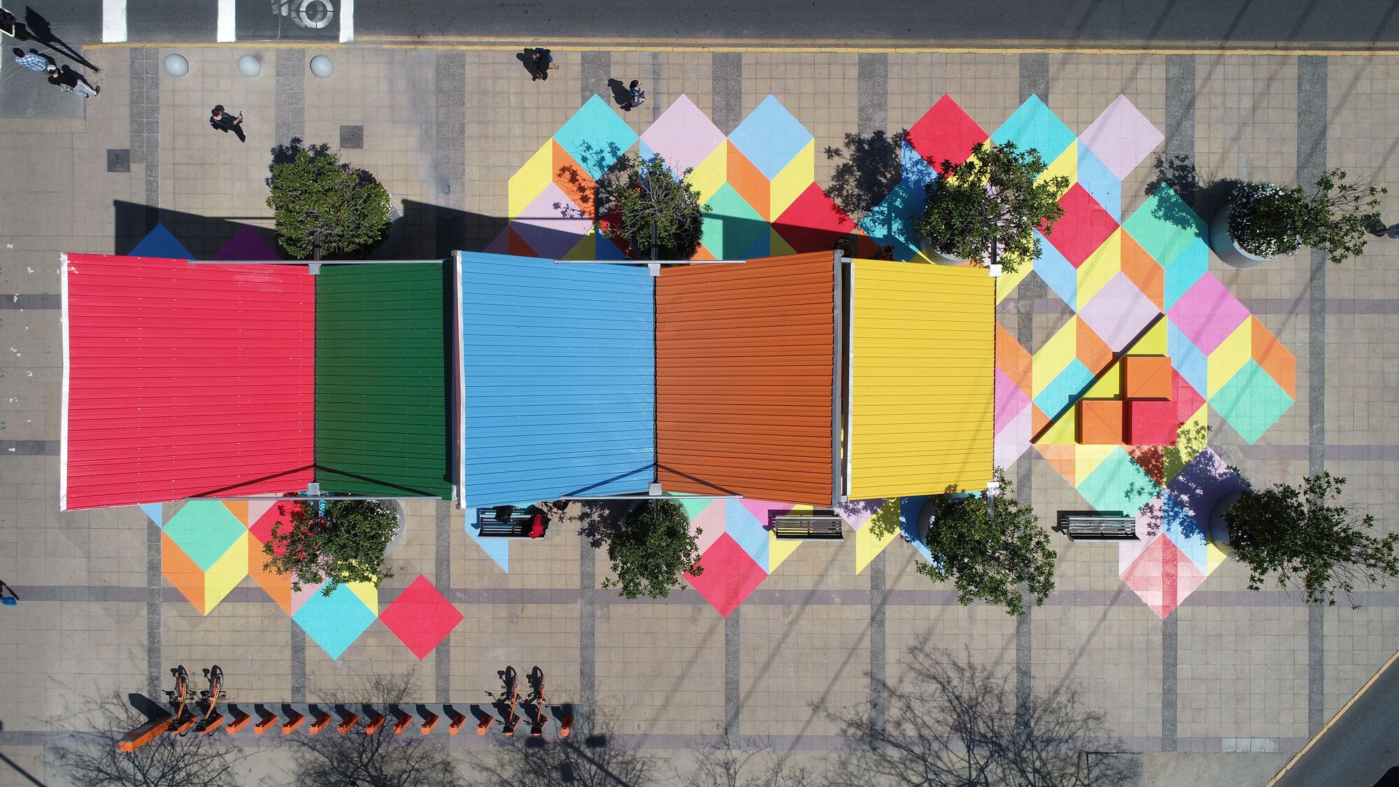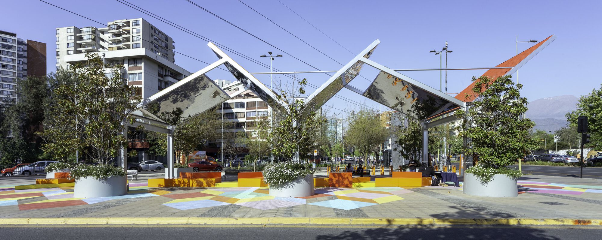 Mirrors Plaza is an urban infrastructure project resulting from a Public and Private articulation that includes 4 basic elements for its development: an existing square, a floor painting, new urban furniture, and a cover. All of this generates dynamism and unexpected uses in the residual space of our city.
