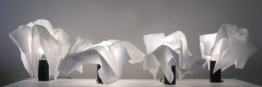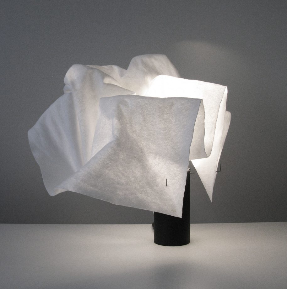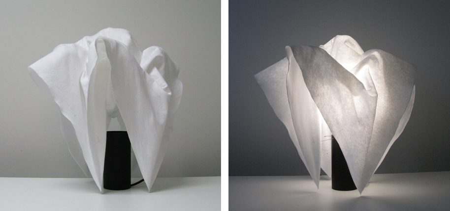 Misha, a series of experimentation in fabrics behavior towards light, the Misha, labelled #1 to #4 consists of four ingeniously designed table lamps. Square pieces of white fabric dipped in fabric hardener are hung from their edges.
