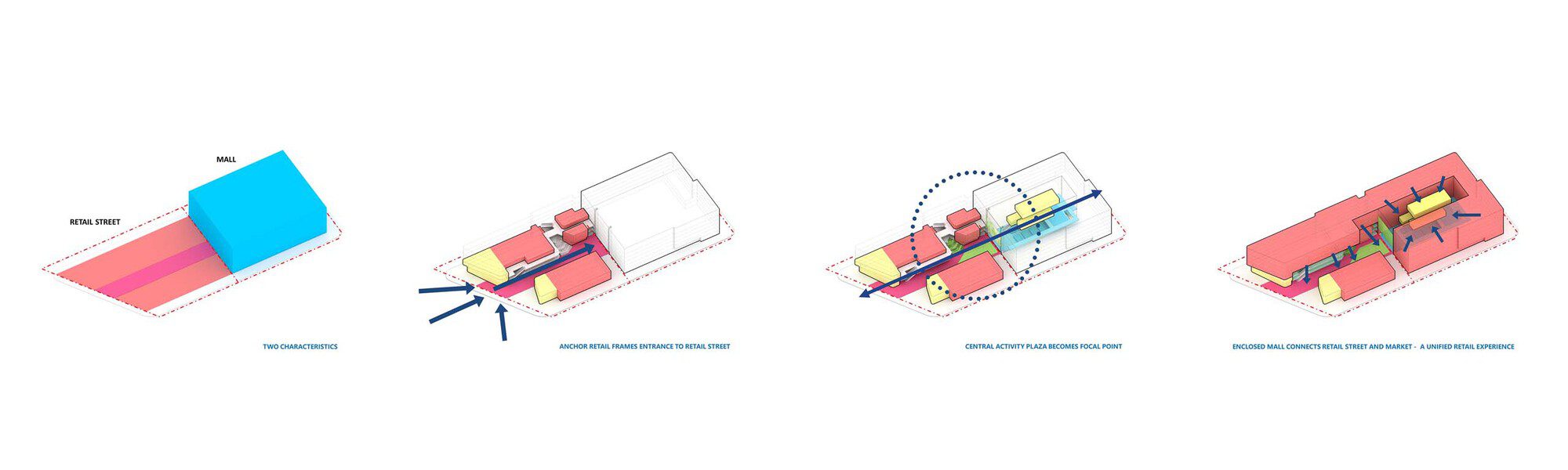 The retail street is punctuated by the shopping mall entrance – the jewel of the scheme. The design of the entrance is animated by three floating food truck-inspired structures, which creates a unique spatial experience for dining and gastronomic experiences.