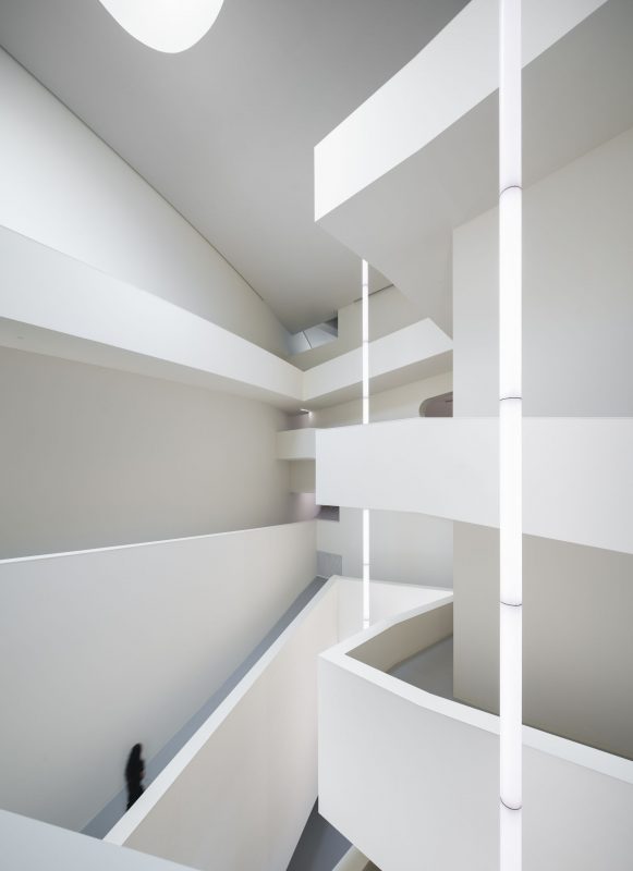 Finally, on the Southeast side, there is an ample, full height triangular space, top lit by a roof light and surrounded by ramps from the first to the fourth floor. The natural lighting is highlighted by the white walls and is brought into the surrounding rooms, through deliberately placed openings.