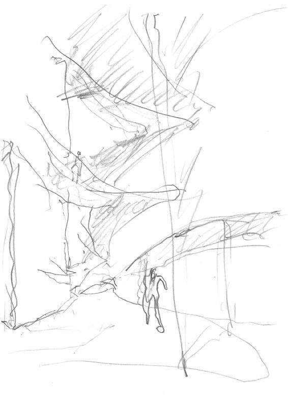 Leaning against on the hillside, its undulating form hovers above the ground.