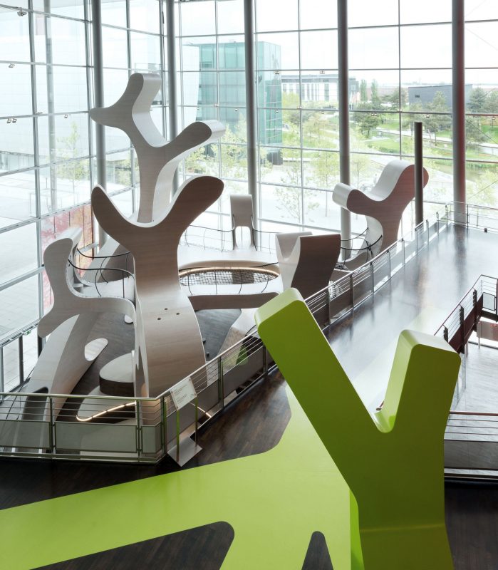 Mobiversum is a kids zone at the Volkswagen Autostadt museum in Wolfsburg, Germany based off the initial Level Green installation in collaboration with art + com for environmentally friendly sustainable design. The form of the initial permanent exhibition was adapted from the PET sign, most commonly associated with recycling and environmental awareness, which is abstracted into the spatially dictative structures.
