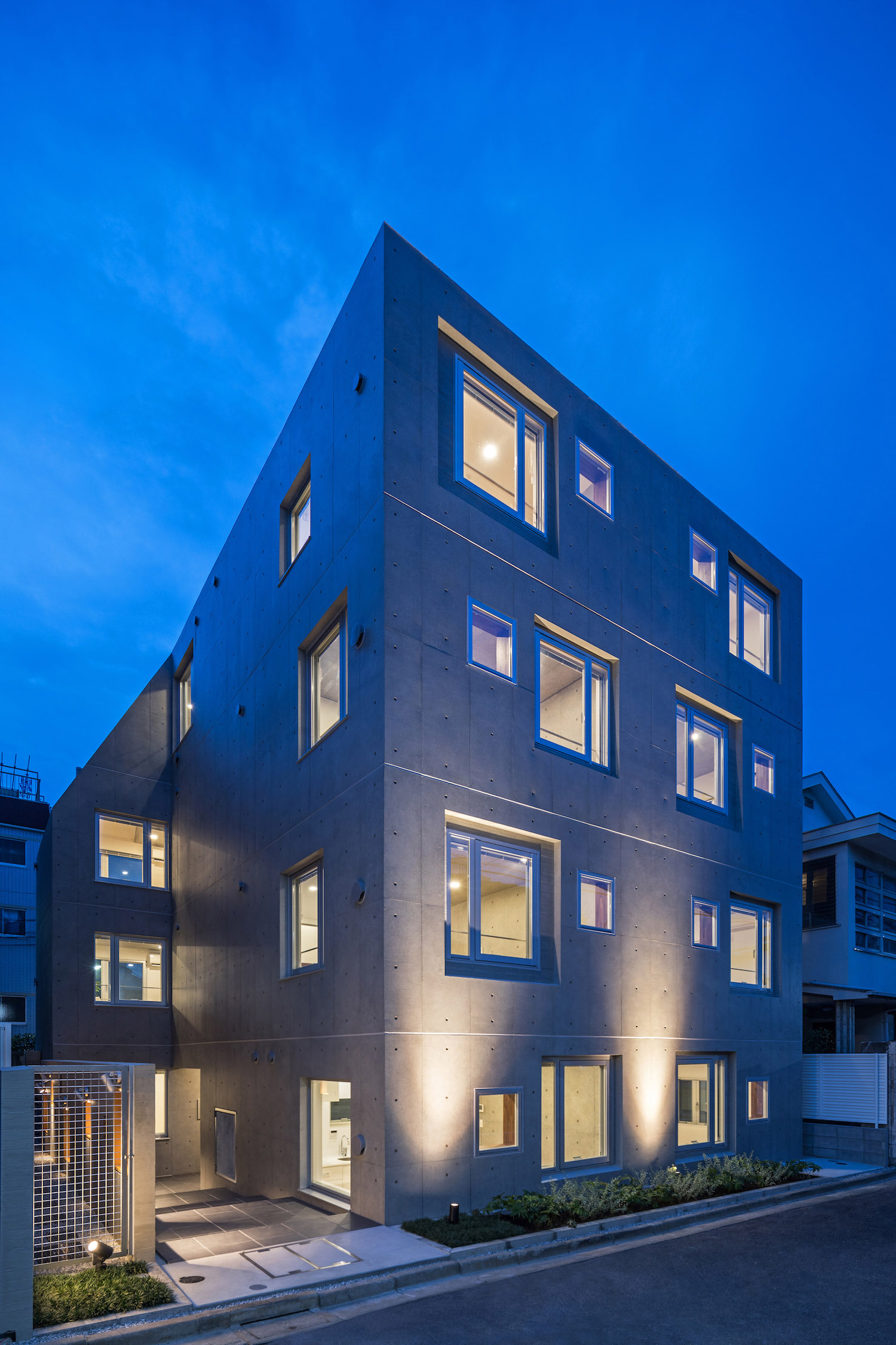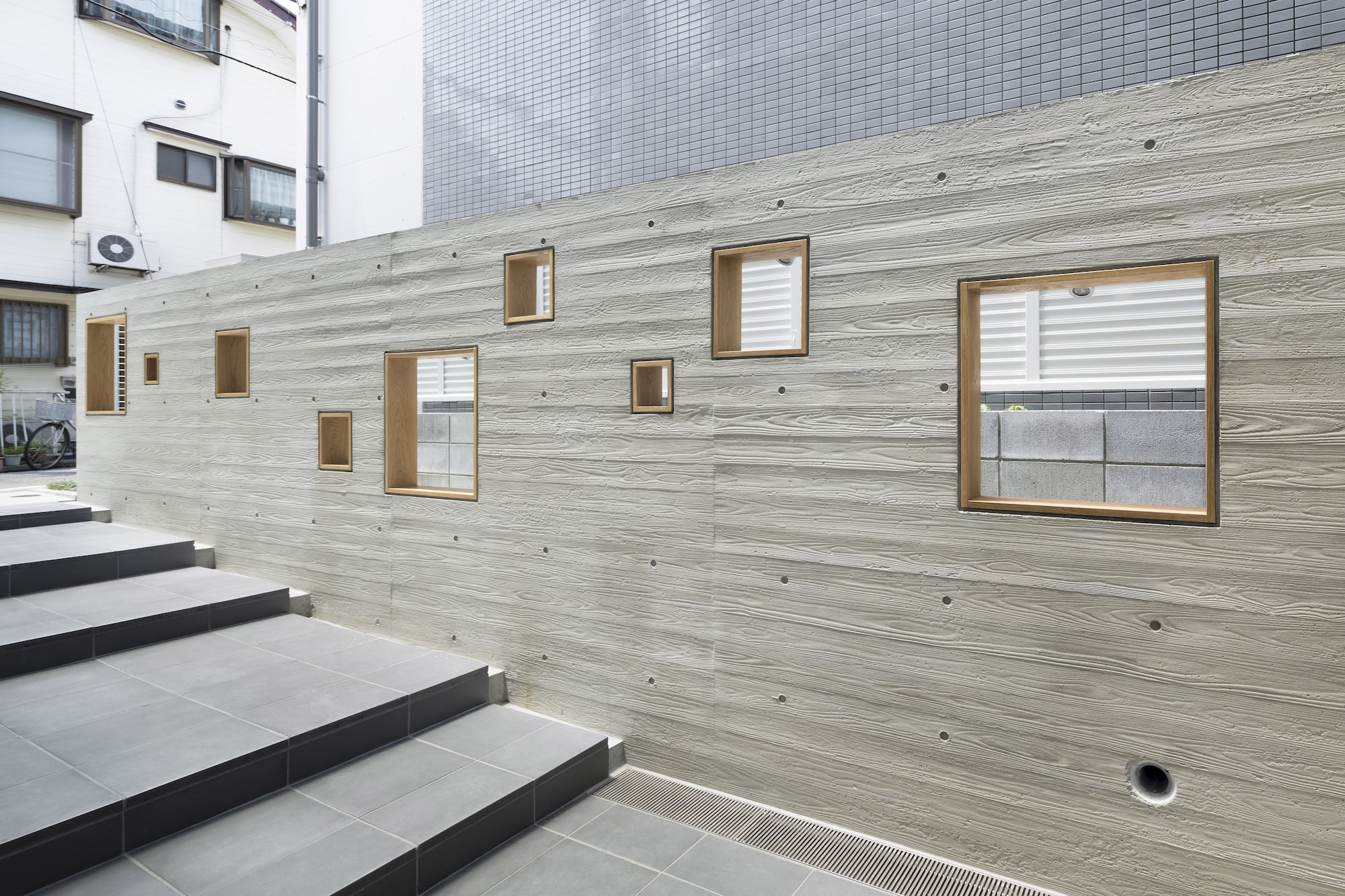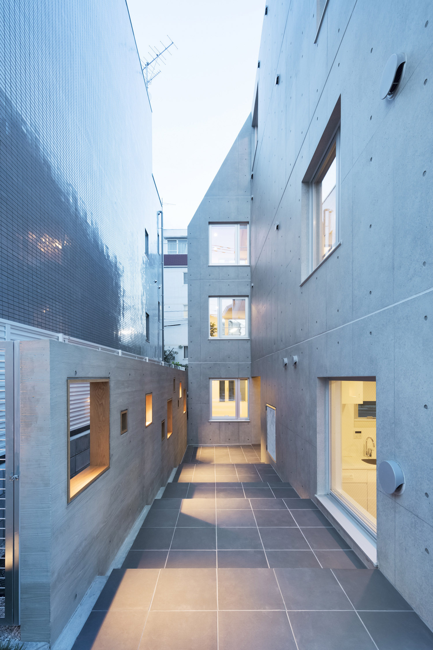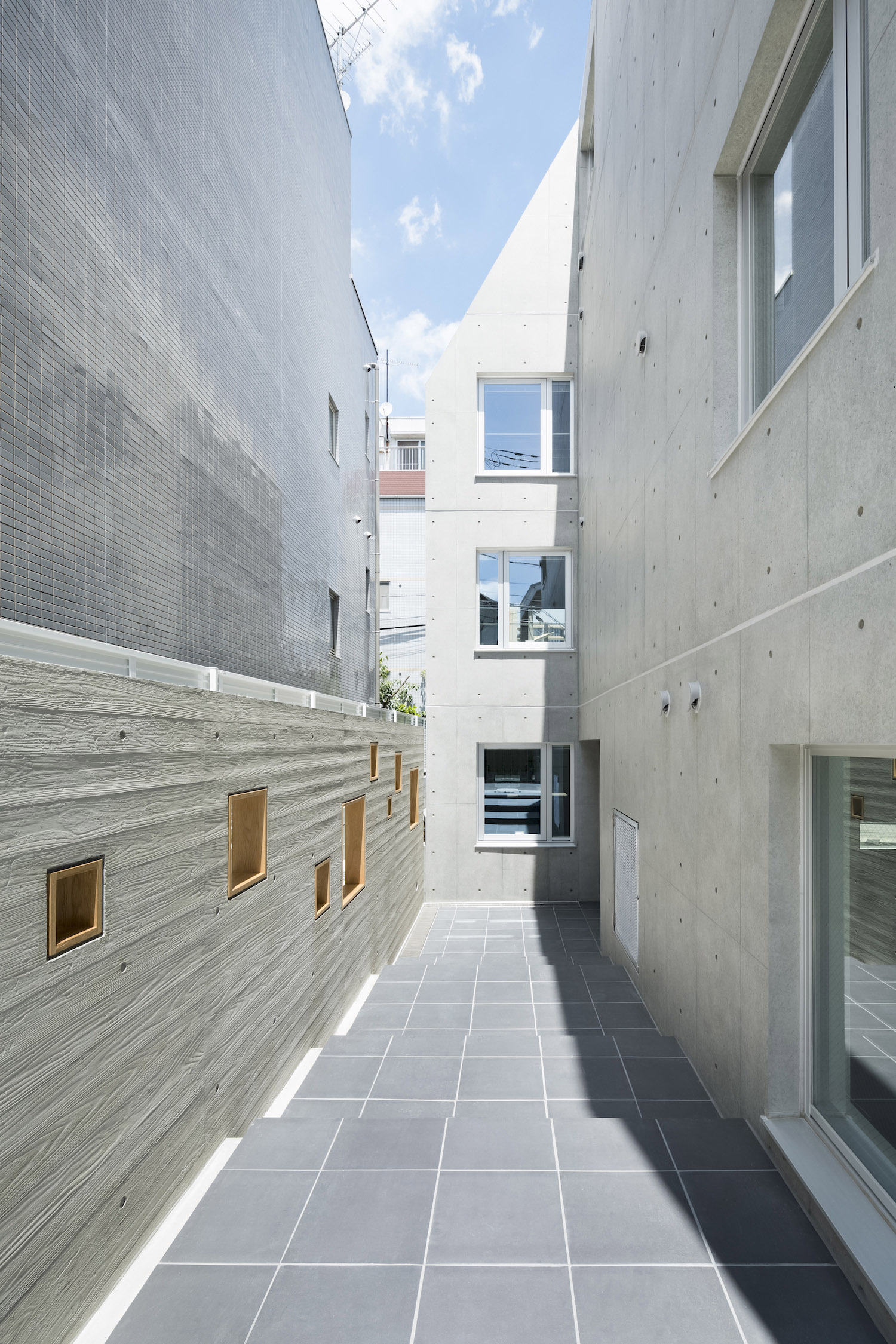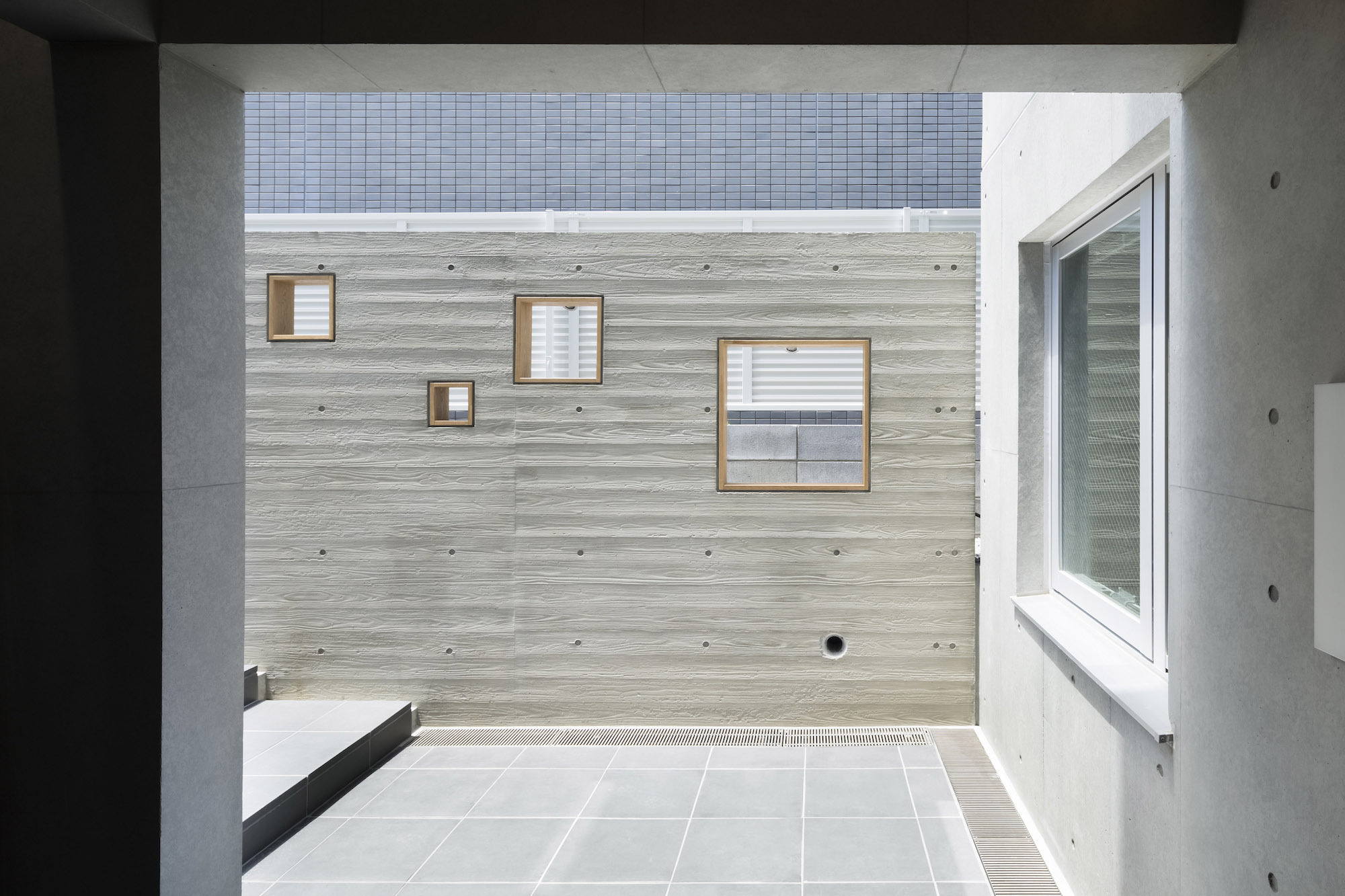 The approach is finished with Japanese roof tiles and the walls are lined with board-formed concrete. At night, the alley is filled with tranquil lights filtering through square wooden frames within the wall. The facade finished with fine exposed concrete, is given characteristic shade using square openings. The openings are recessed slightly from the surface and are bordered with wooden textures. The arrangement of the opening is shifted slightly to avoid direct views while taking light, air, and view. With this arrangement of openings, we also attempted to reduce the massive weight of the concrete. The interior shows a vivid but exquisitely simple contrast of materials. Walls are either plain white or finished with exposed concrete.