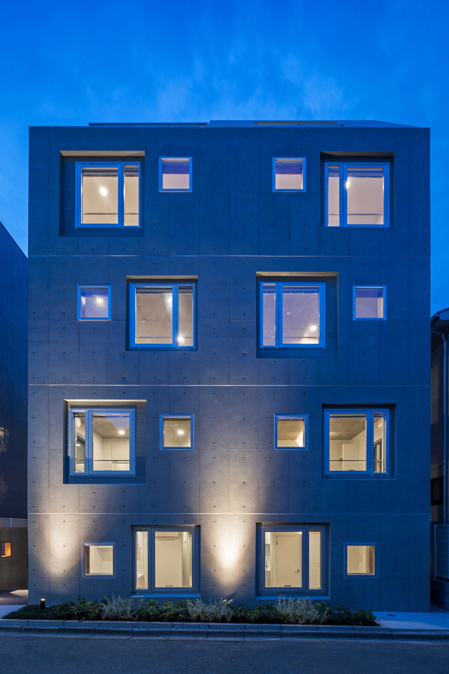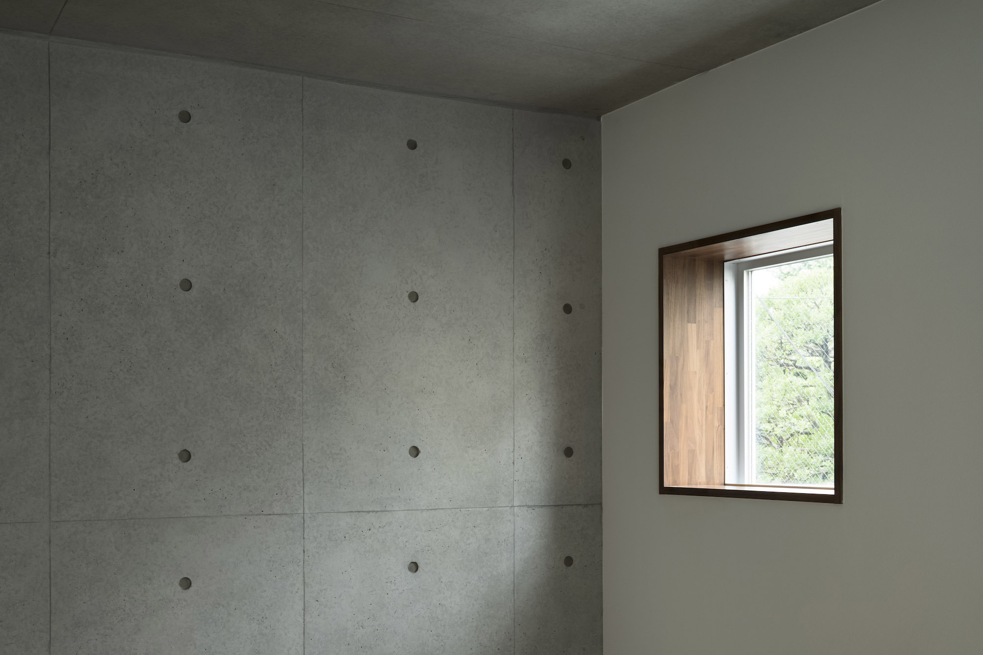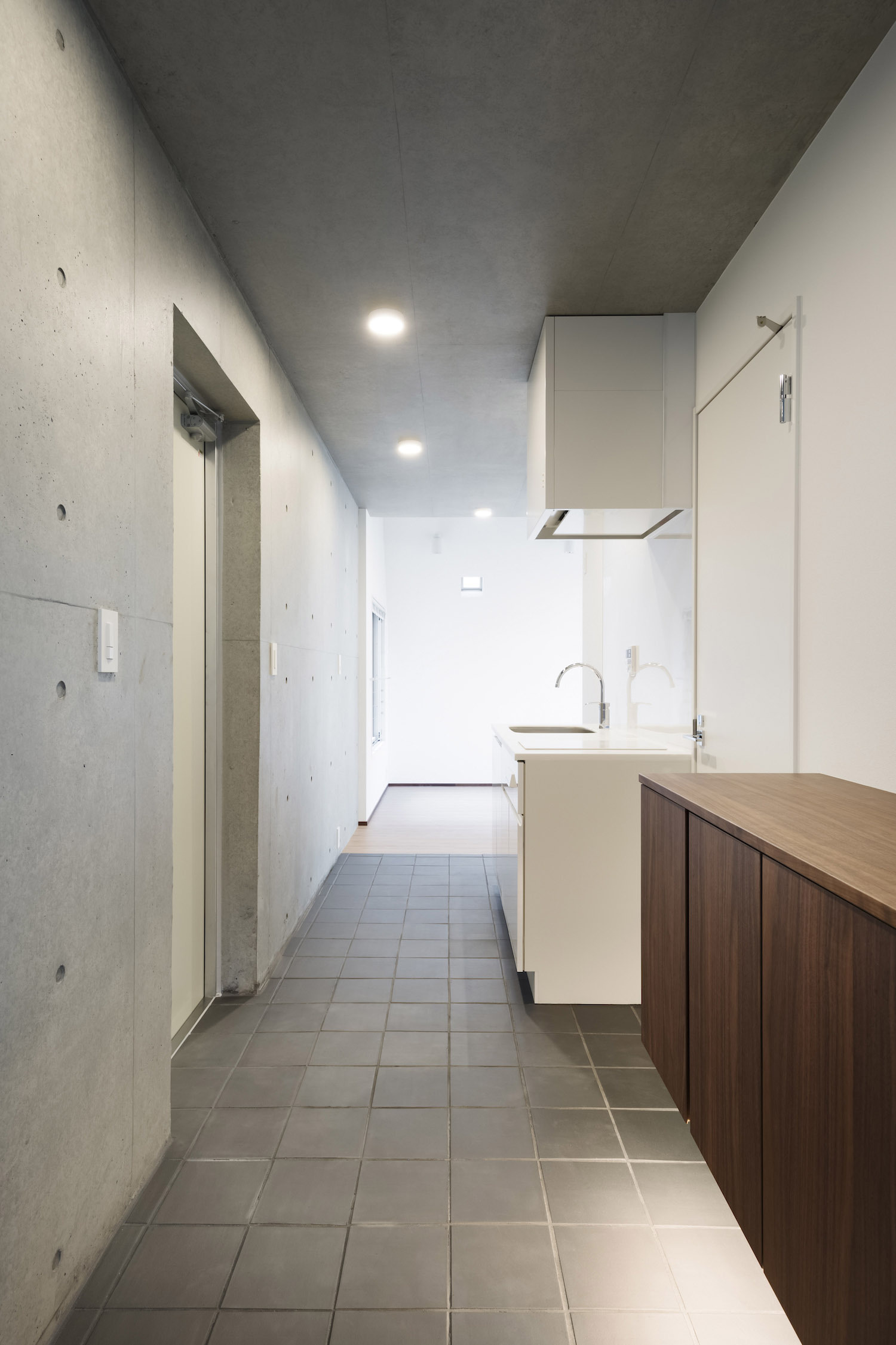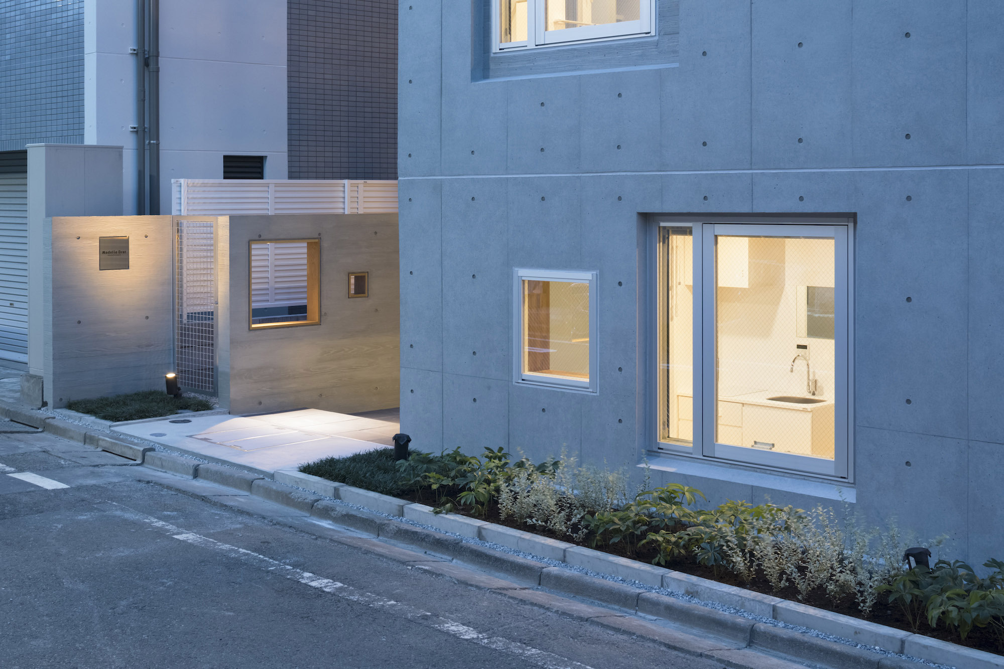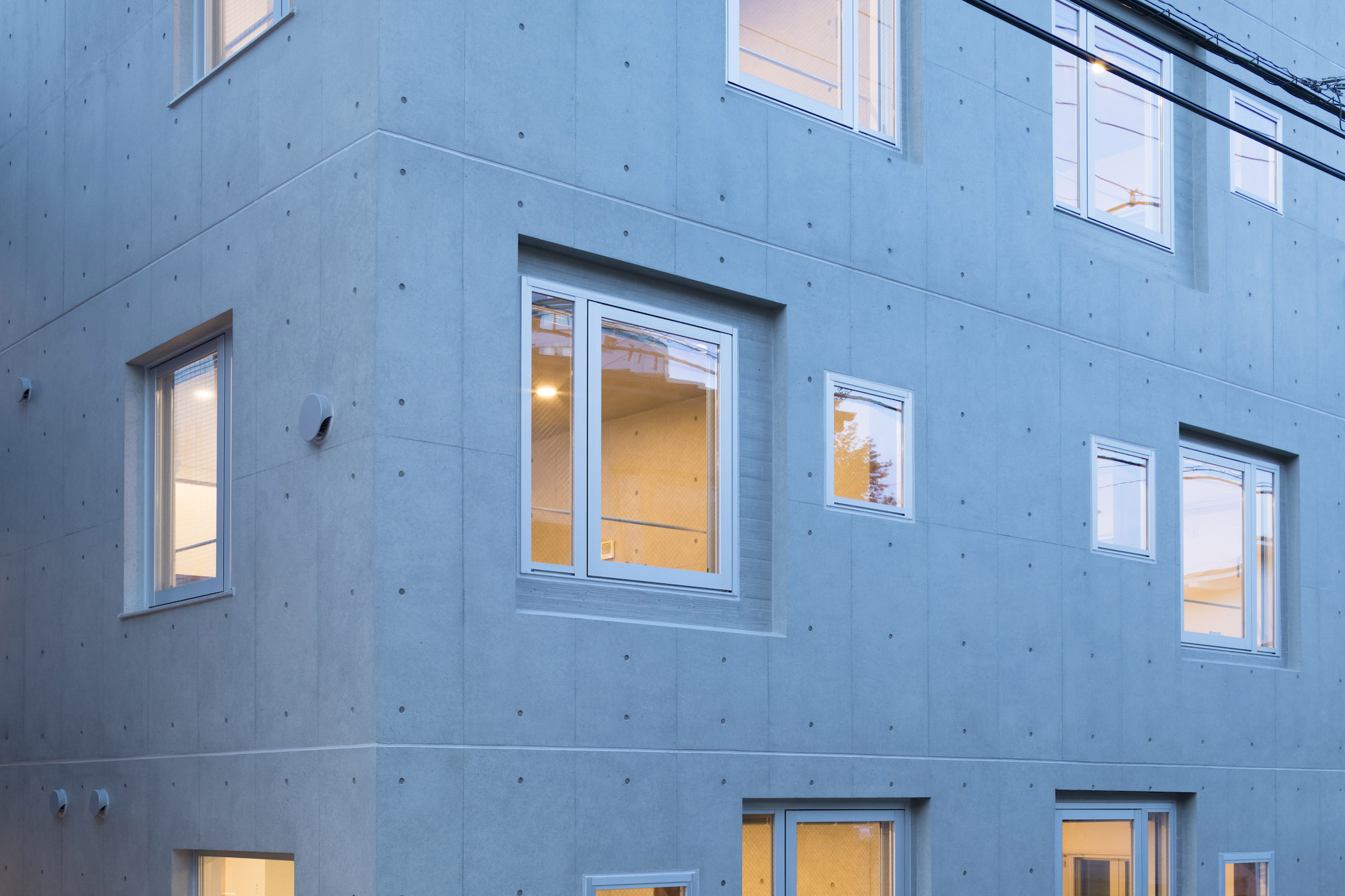 The approach is finished with Japanese roof tiles and the walls are lined with board-formed concrete. At night, the alley is filled with tranquil lights filtering through square wooden frames within the wall. The facade finished with fine exposed concrete, is given characteristic shade using square openings. The openings are recessed slightly from the surface and are bordered with wooden textures. The arrangement of the opening is shifted slightly to avoid direct views while taking light, air, and view. With this arrangement of openings, we also attempted to reduce the massive weight of the concrete. The interior shows a vivid but exquisitely simple contrast of materials. Walls are either plain white or finished with exposed concrete.