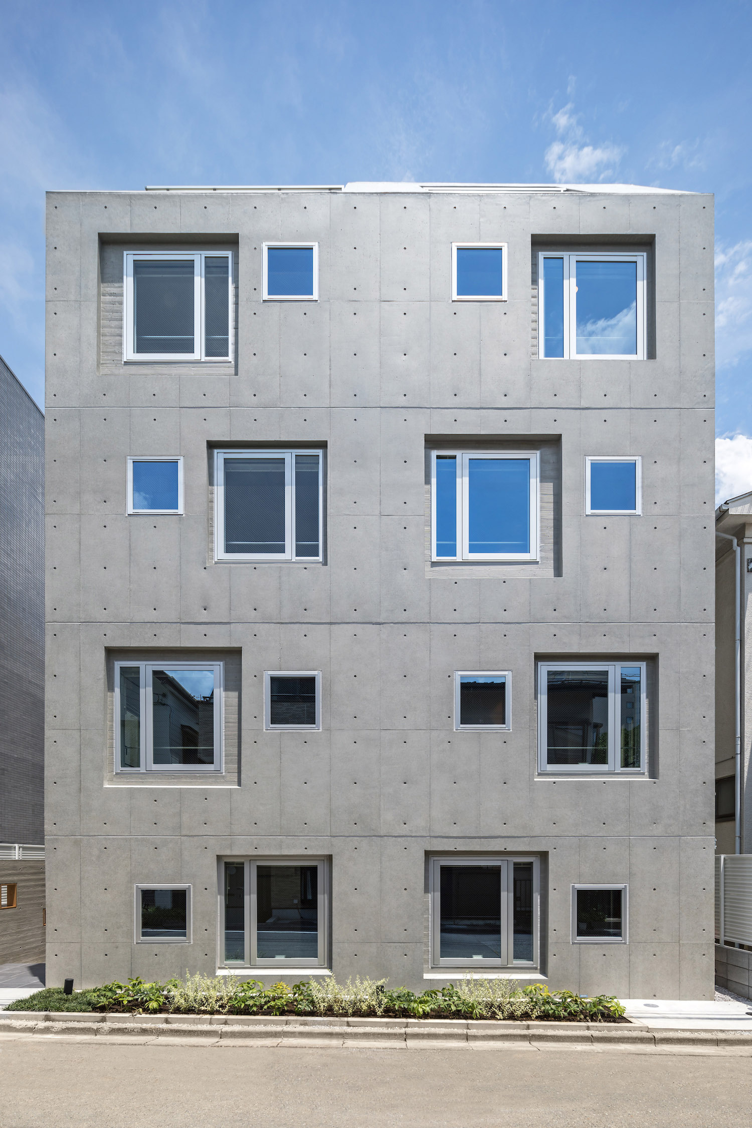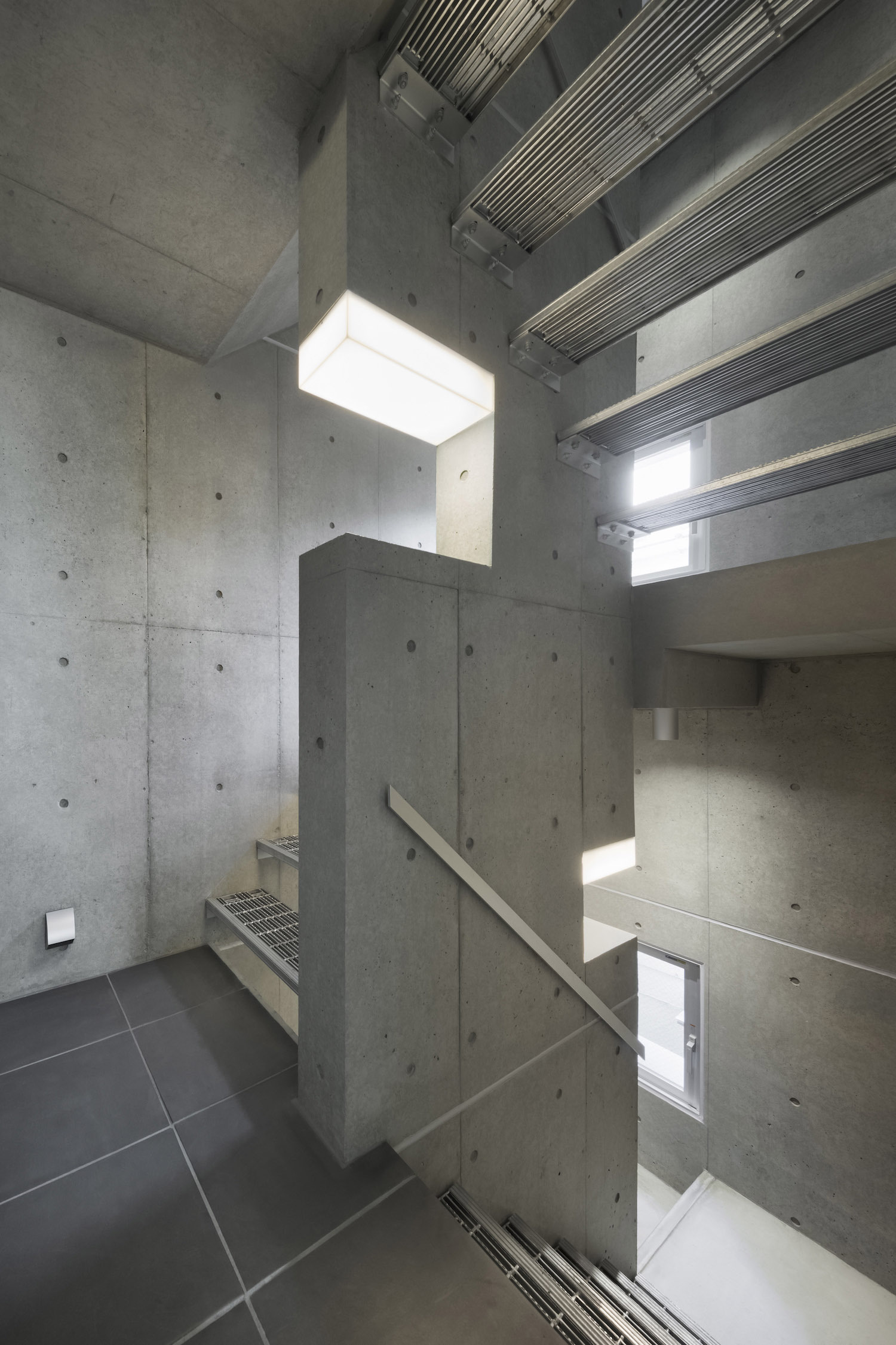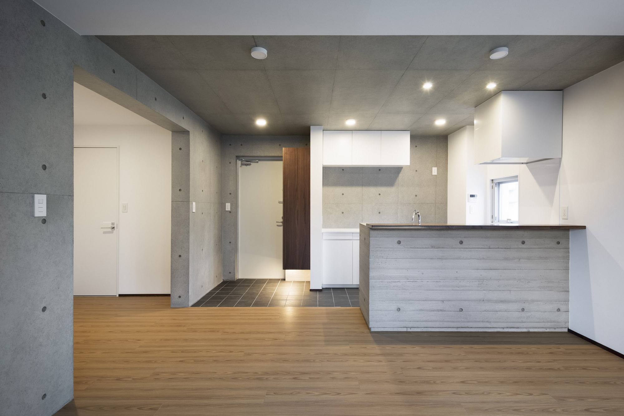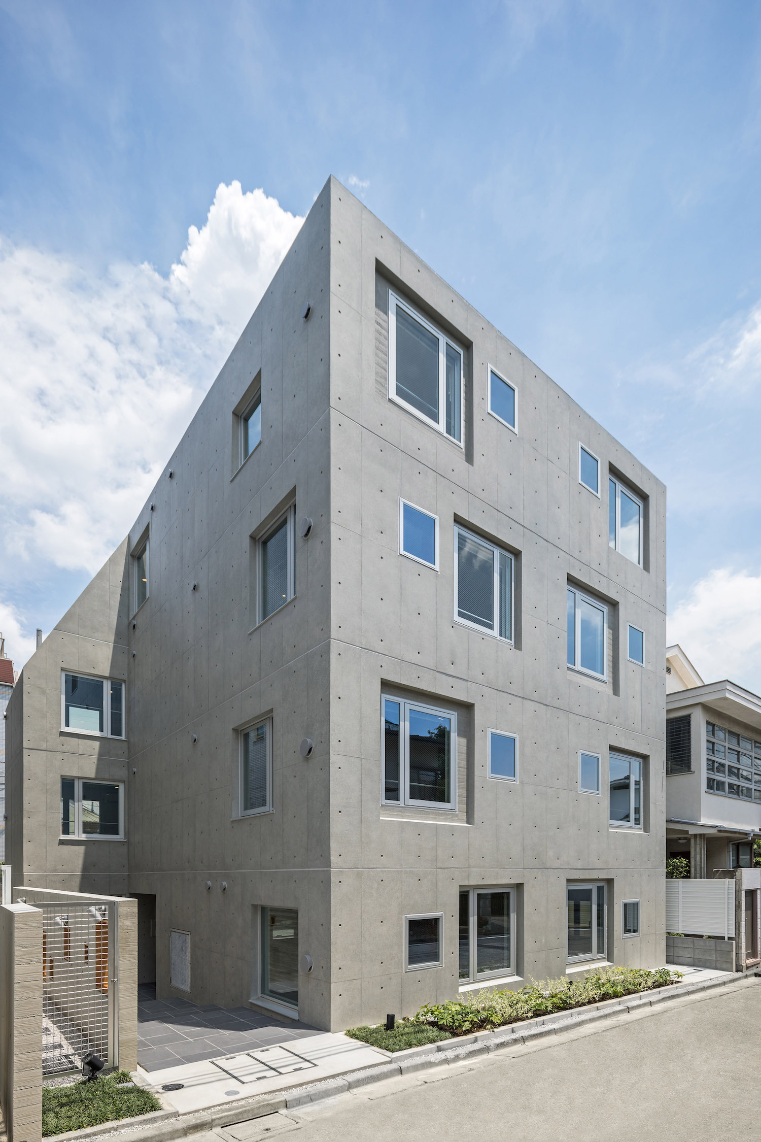 The approach is finished with Japanese roof tiles and the walls are lined with board-formed concrete. At night, the alley is filled with tranquil lights filtering through square wooden frames within the wall. The facade finished with fine exposed concrete, is given characteristic shade using square openings. The openings are recessed slightly from the surface and are bordered with wooden textures. The arrangement of the opening is shifted slightly to avoid direct views while taking light, air, and view. With this arrangement of openings, we also attempted to reduce the massive weight of the concrete. The interior shows a vivid but exquisitely simple contrast of materials. Walls are either plain white or finished with exposed concrete.