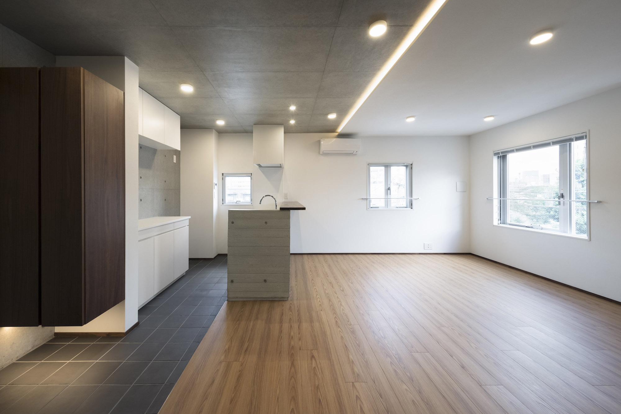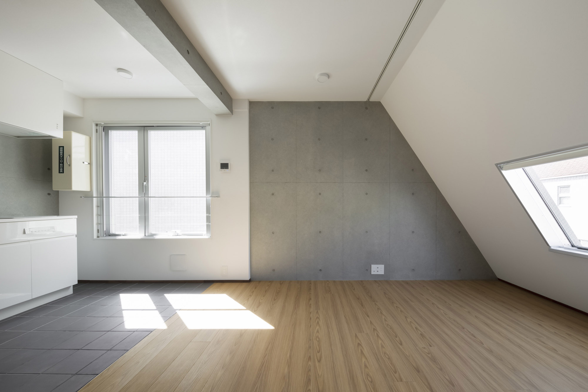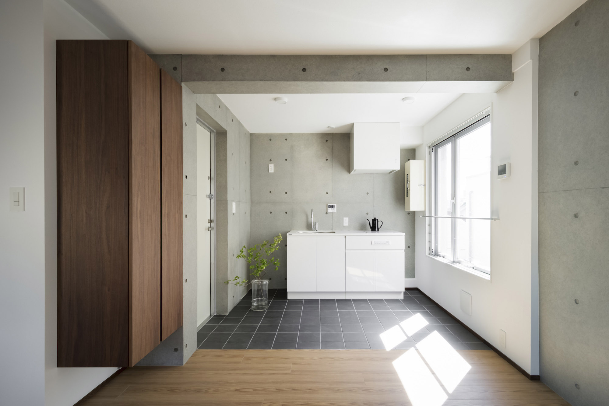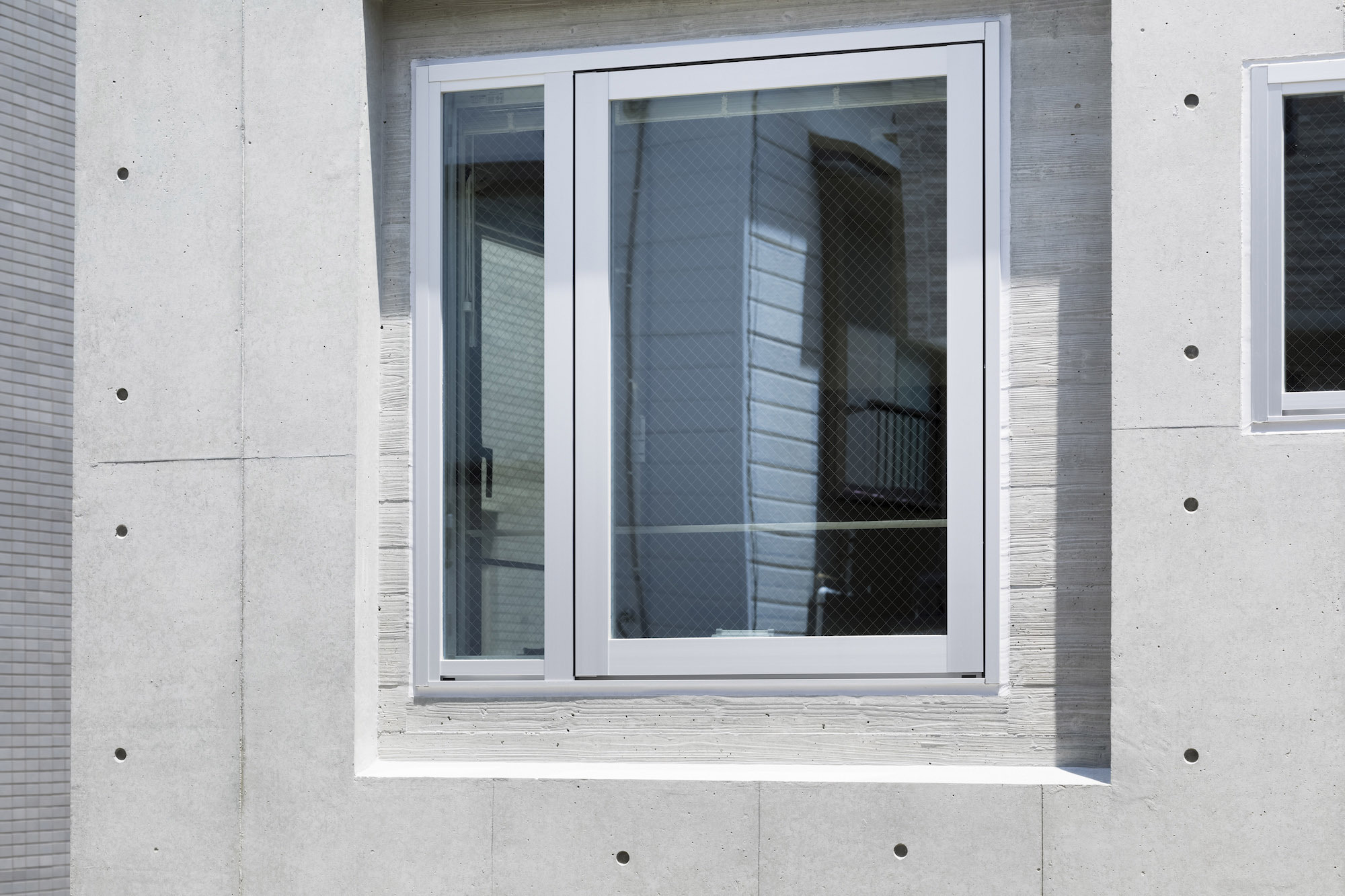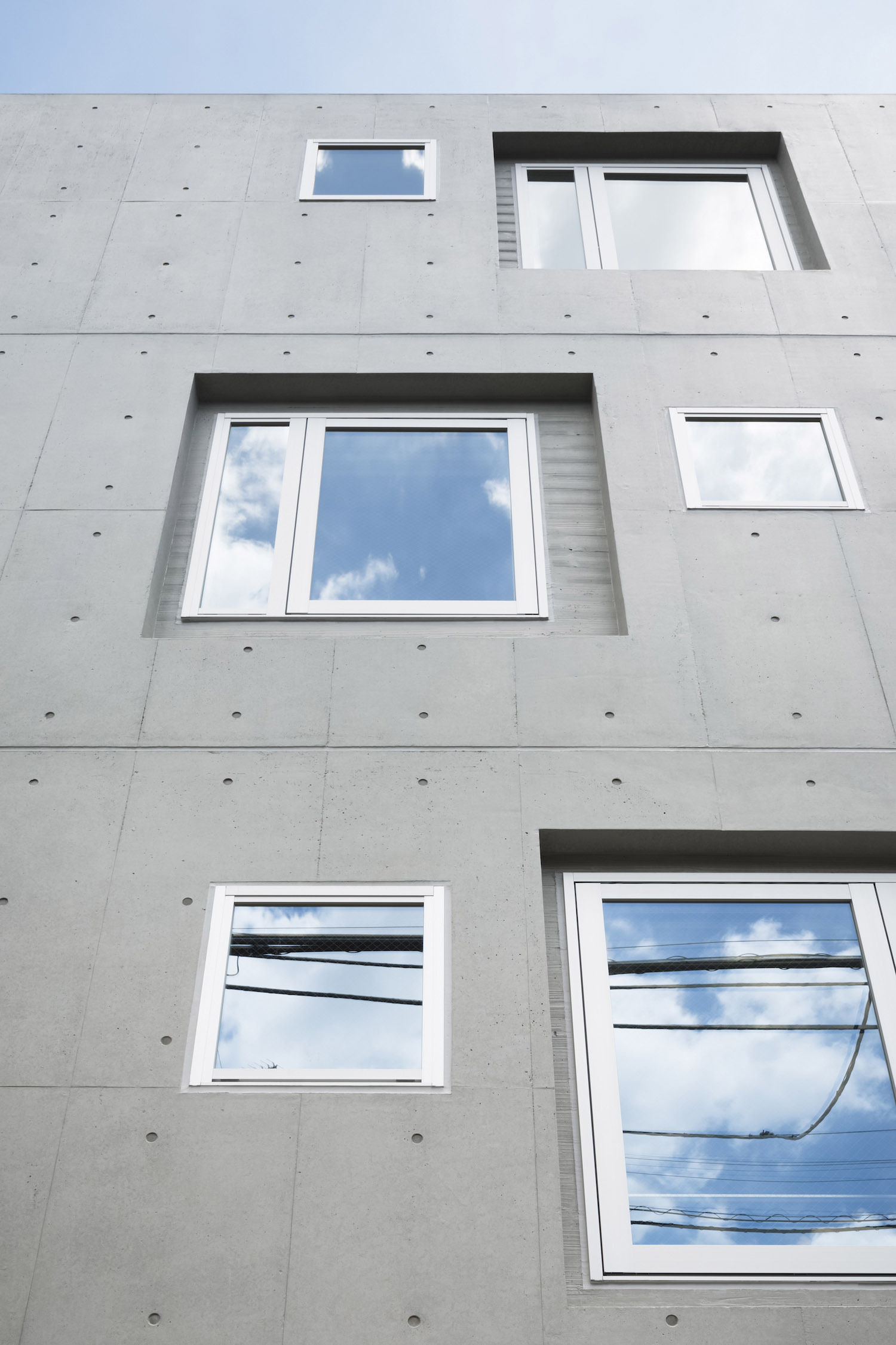 The approach is finished with Japanese roof tiles and the walls are lined with board-formed concrete. At night, the alley is filled with tranquil lights filtering through square wooden frames within the wall. The facade finished with fine exposed concrete, is given characteristic shade using square openings. The openings are recessed slightly from the surface and are bordered with wooden textures. The arrangement of the opening is shifted slightly to avoid direct views while taking light, air, and view. With this arrangement of openings, we also attempted to reduce the massive weight of the concrete. The interior shows a vivid but exquisitely simple contrast of materials. Walls are either plain white or finished with exposed concrete.