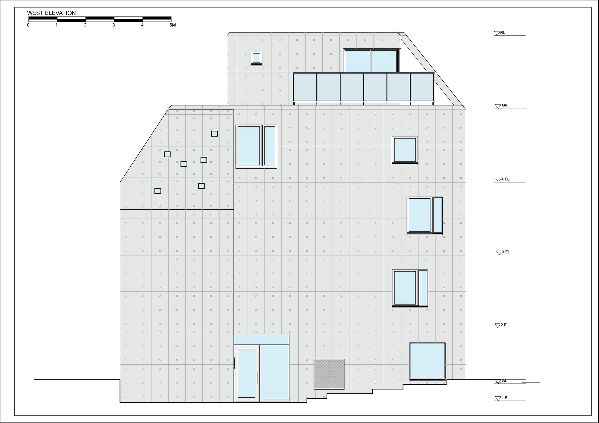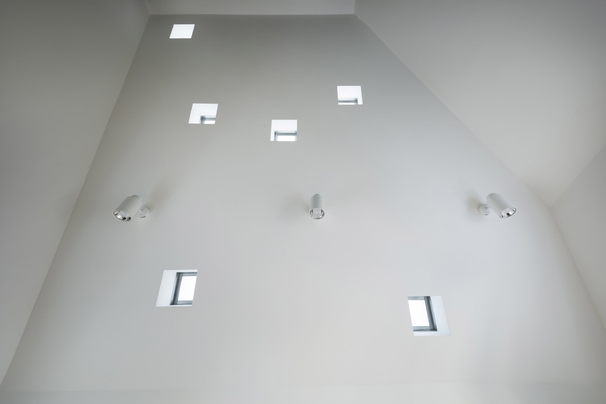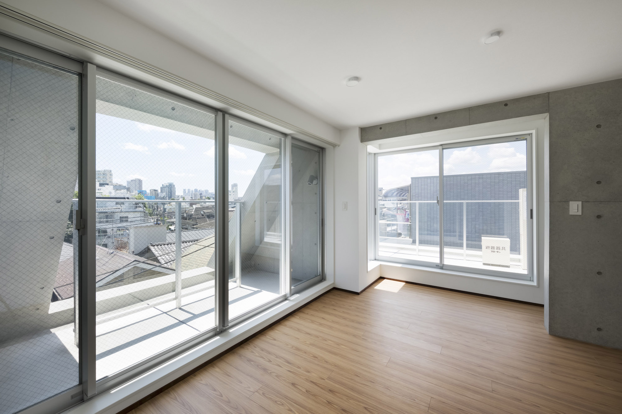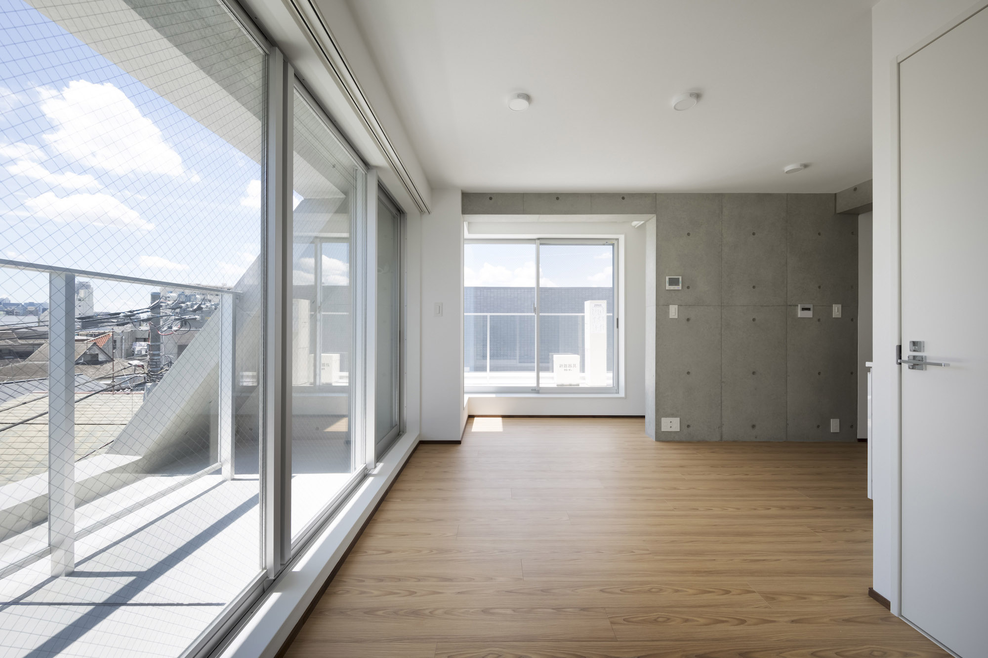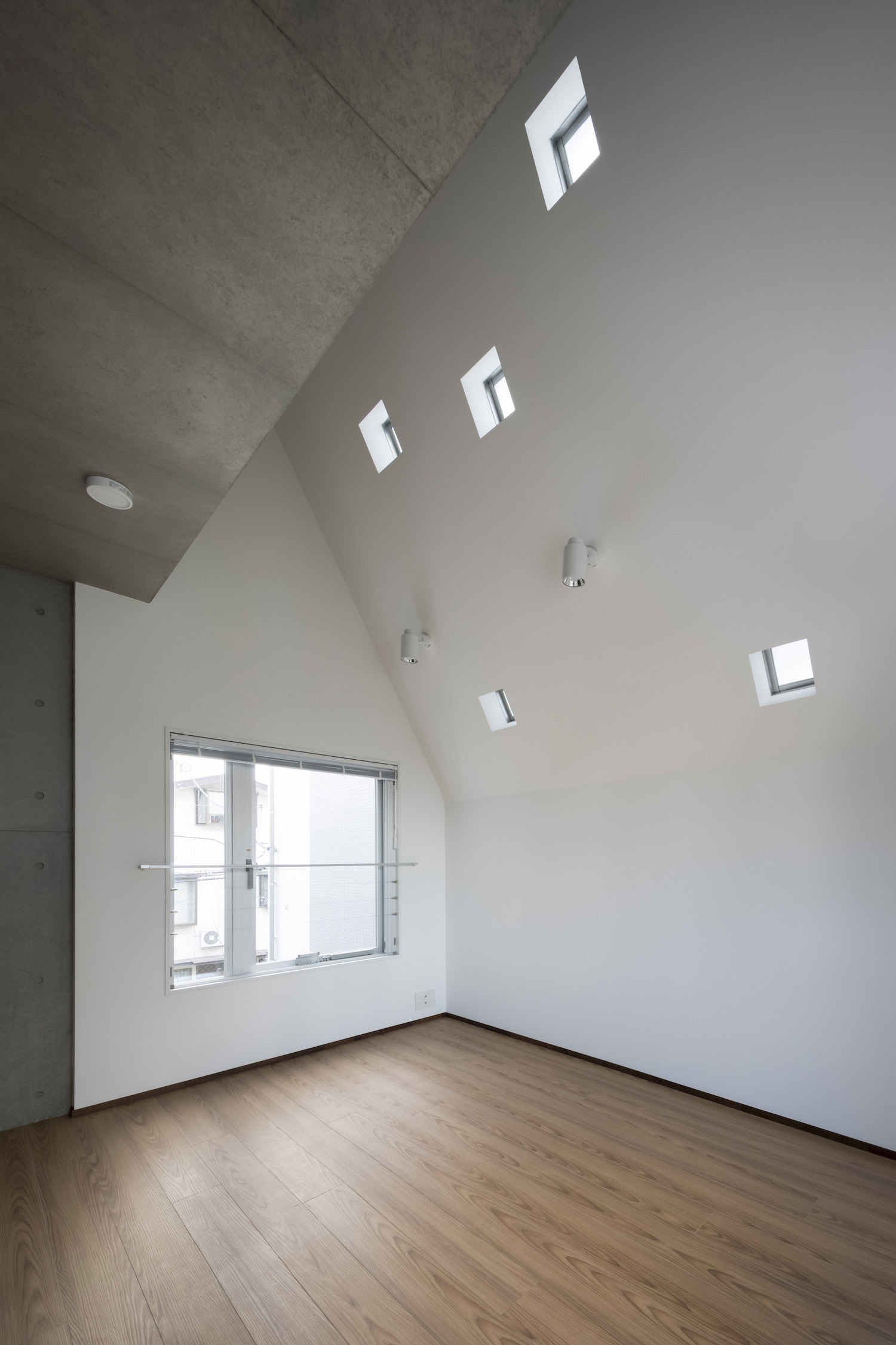 The approach is finished with Japanese roof tiles and the walls are lined with board-formed concrete. At night, the alley is filled with tranquil lights filtering through square wooden frames within the wall. The facade finished with fine exposed concrete, is given characteristic shade using square openings. The openings are recessed slightly from the surface and are bordered with wooden textures. The arrangement of the opening is shifted slightly to avoid direct views while taking light, air, and view. With this arrangement of openings, we also attempted to reduce the massive weight of the concrete. The interior shows a vivid but exquisitely simple contrast of materials. Walls are either plain white or finished with exposed concrete.