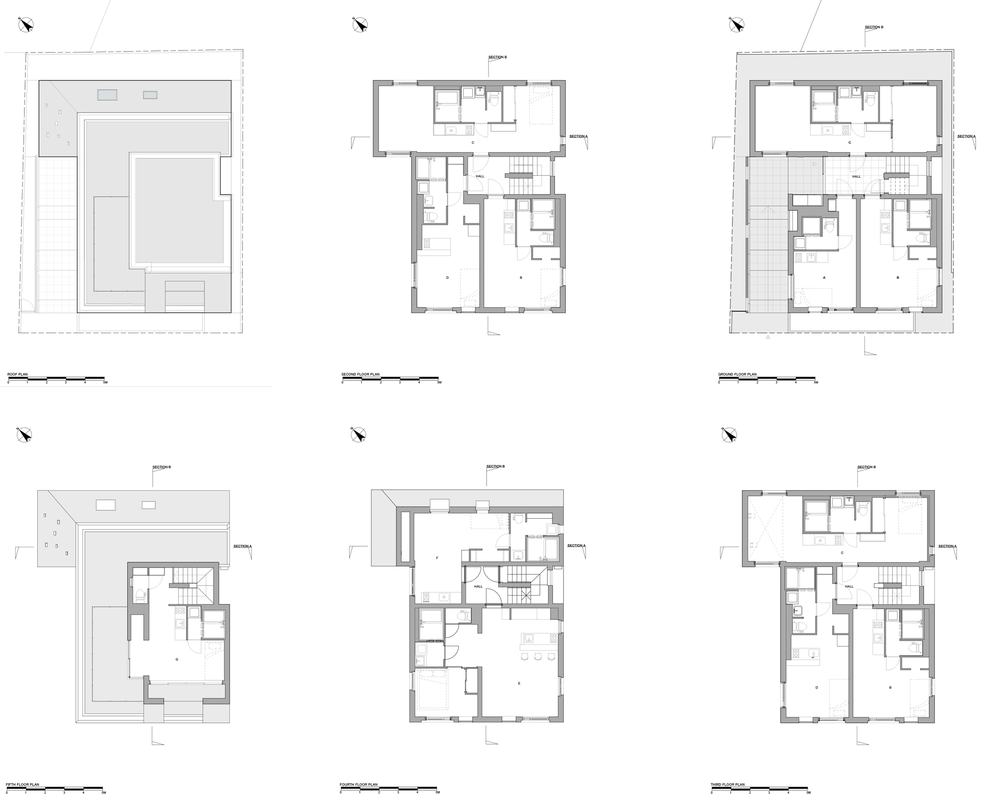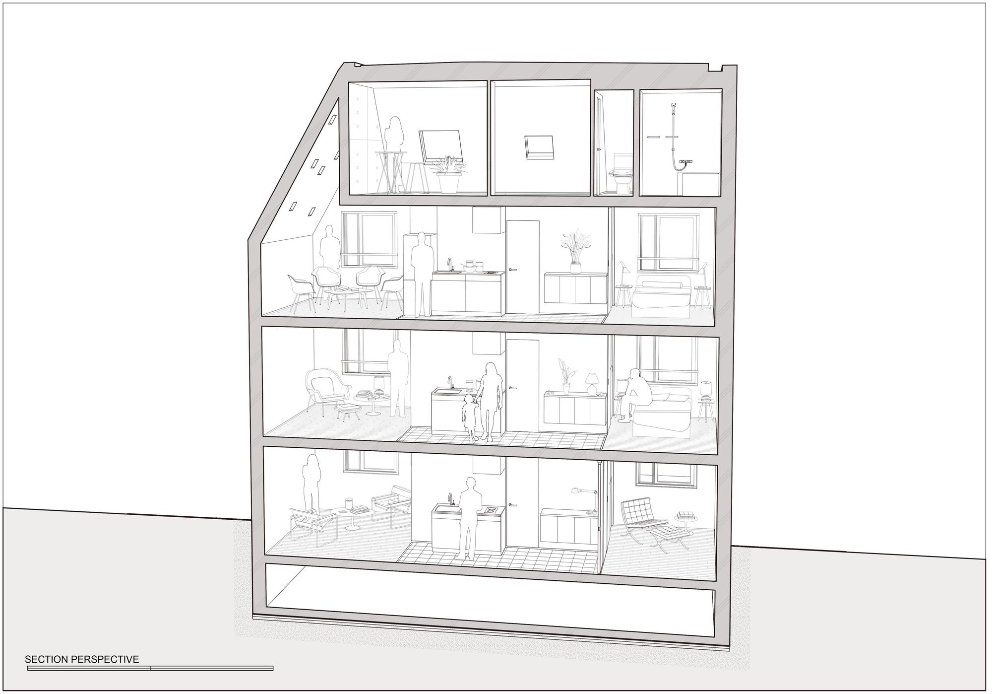 There are also walnut accents: baseboards made from offcuts from walnut furniture, shoe boxes have a chic texture and kitchens feature a balanced contrast of walnut and stainless steel. Each room’s space takes on unexpectedly diverse shapes with different atmospheres reflecting the town’s intricate depth. The interiors were consciously designed to stimulate the residents’ ideas for living. For example, open storage spaces can also be used as compact dens. By this minimalistic design of collective housing with materials and space at play, we suggest a life not reliant on products, and wealth without possession. Minimalism is in direct connection with the way of living.