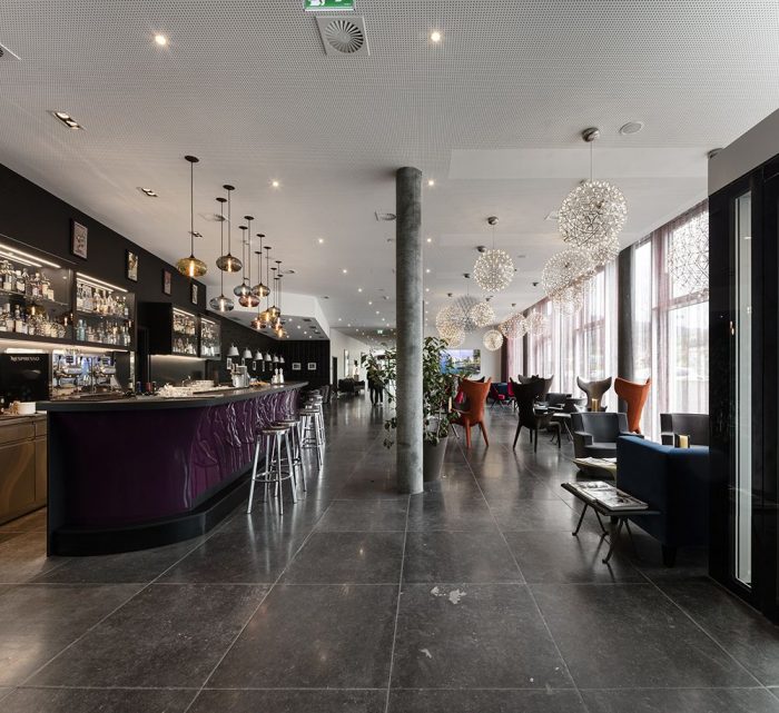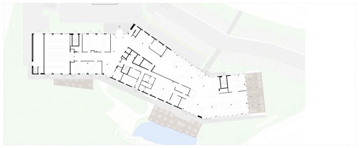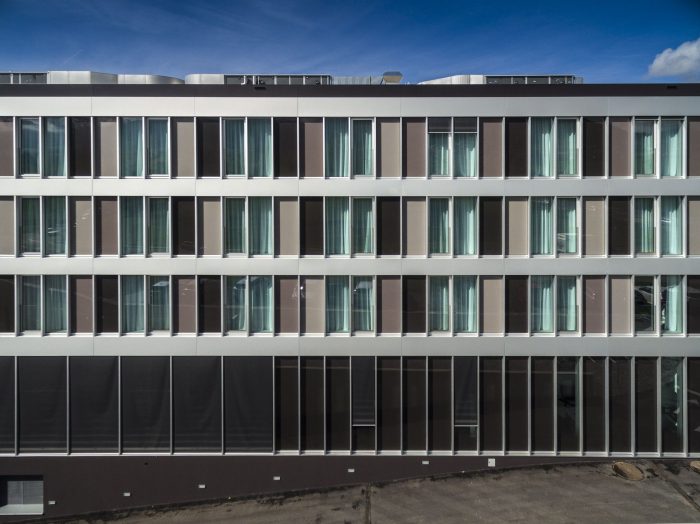 The building stretches along the length of the site but its façade has been designed as a rhythm of elements broken by only two folds which announce the main entrance to the hotel and the location of the restaurant. Ribbons of metal that run all around the building otherwise highlight its horizontality. Panels of warmly colored vertical glazing– brown, bronze, and grey – give the building an elegant, yet calm, character. The northern façade of the hotel reads like a sequence of planes which change in their appearance according to one’s particular viewpoint and also with the changing natural light.