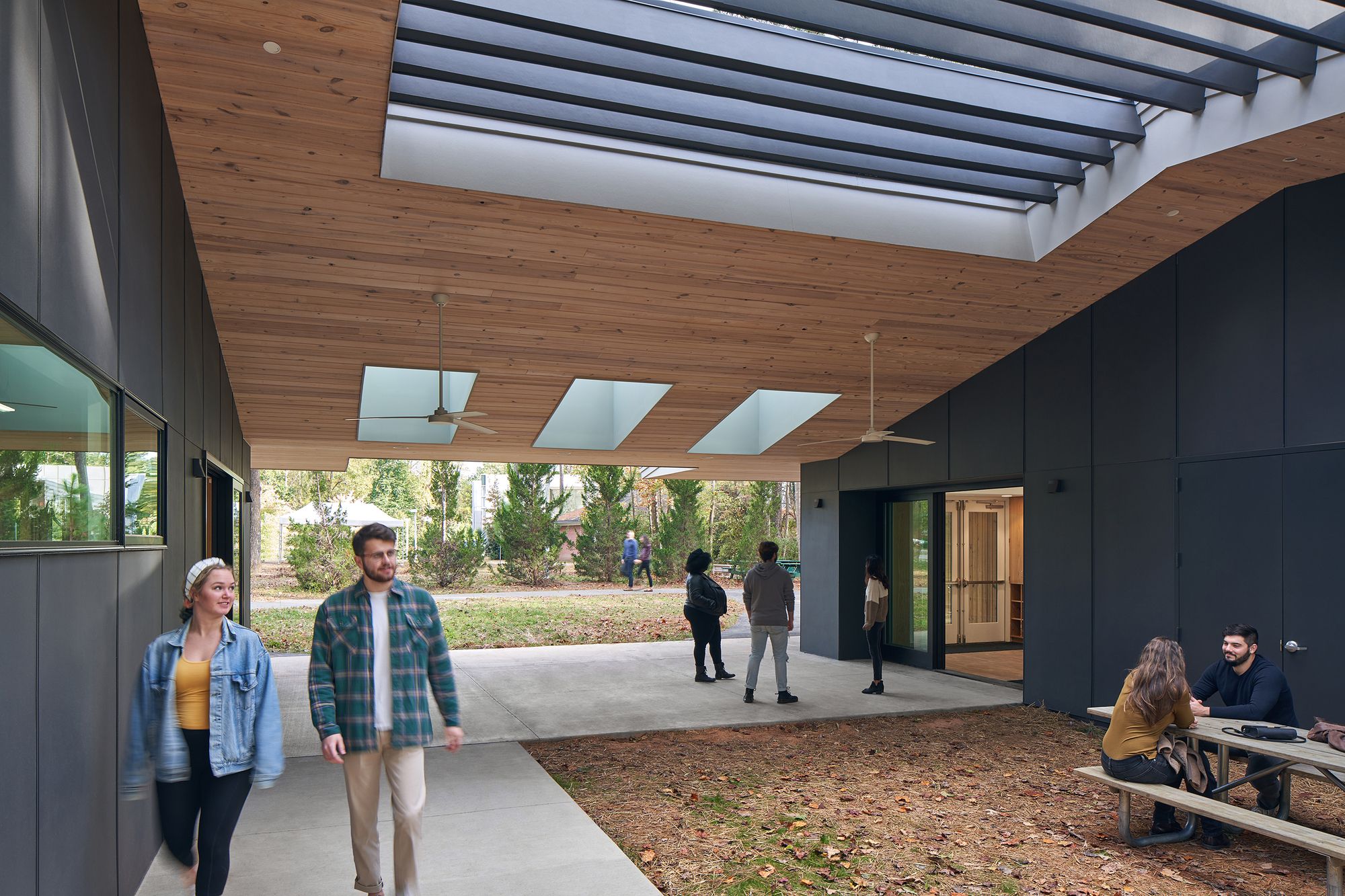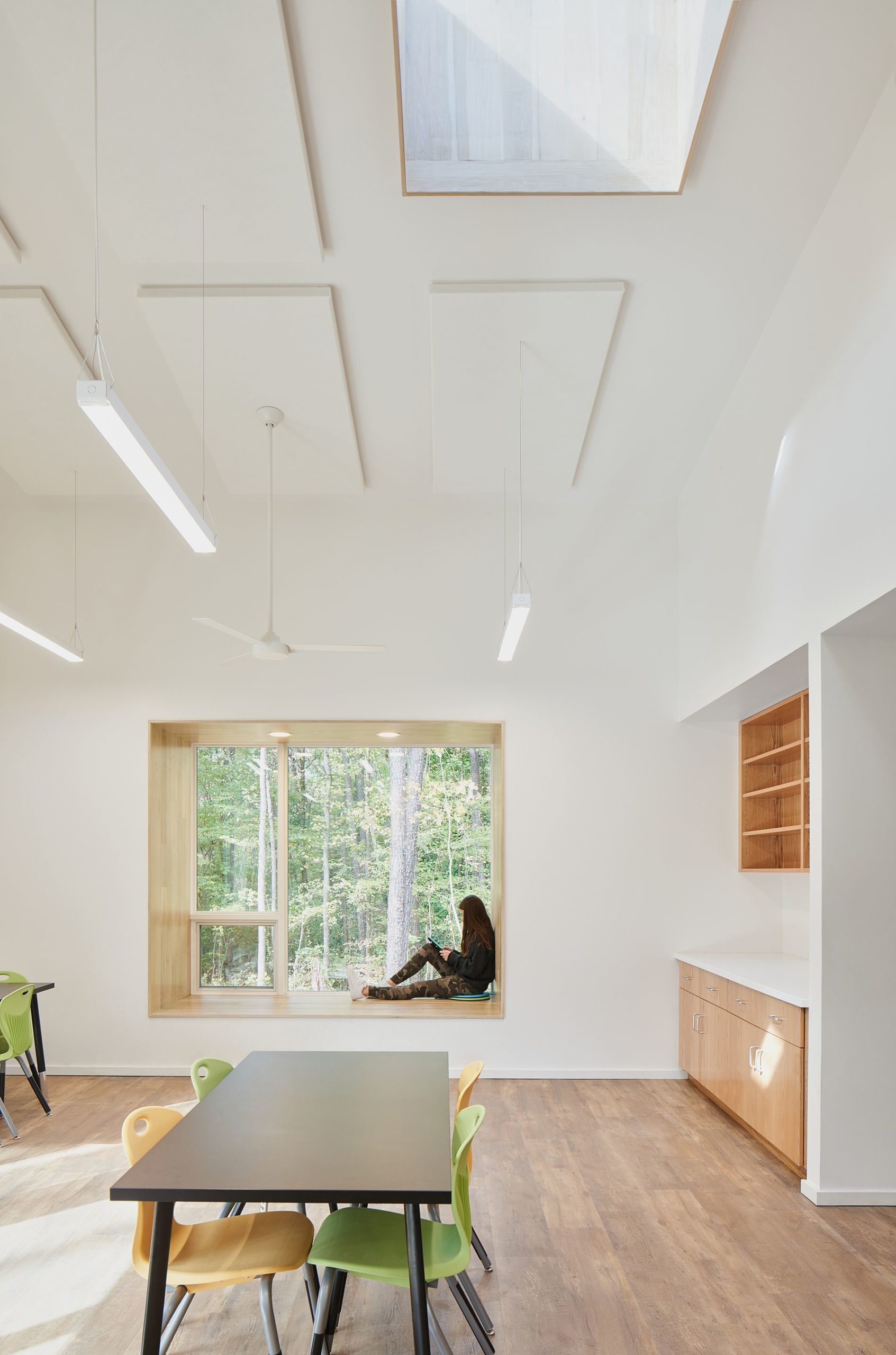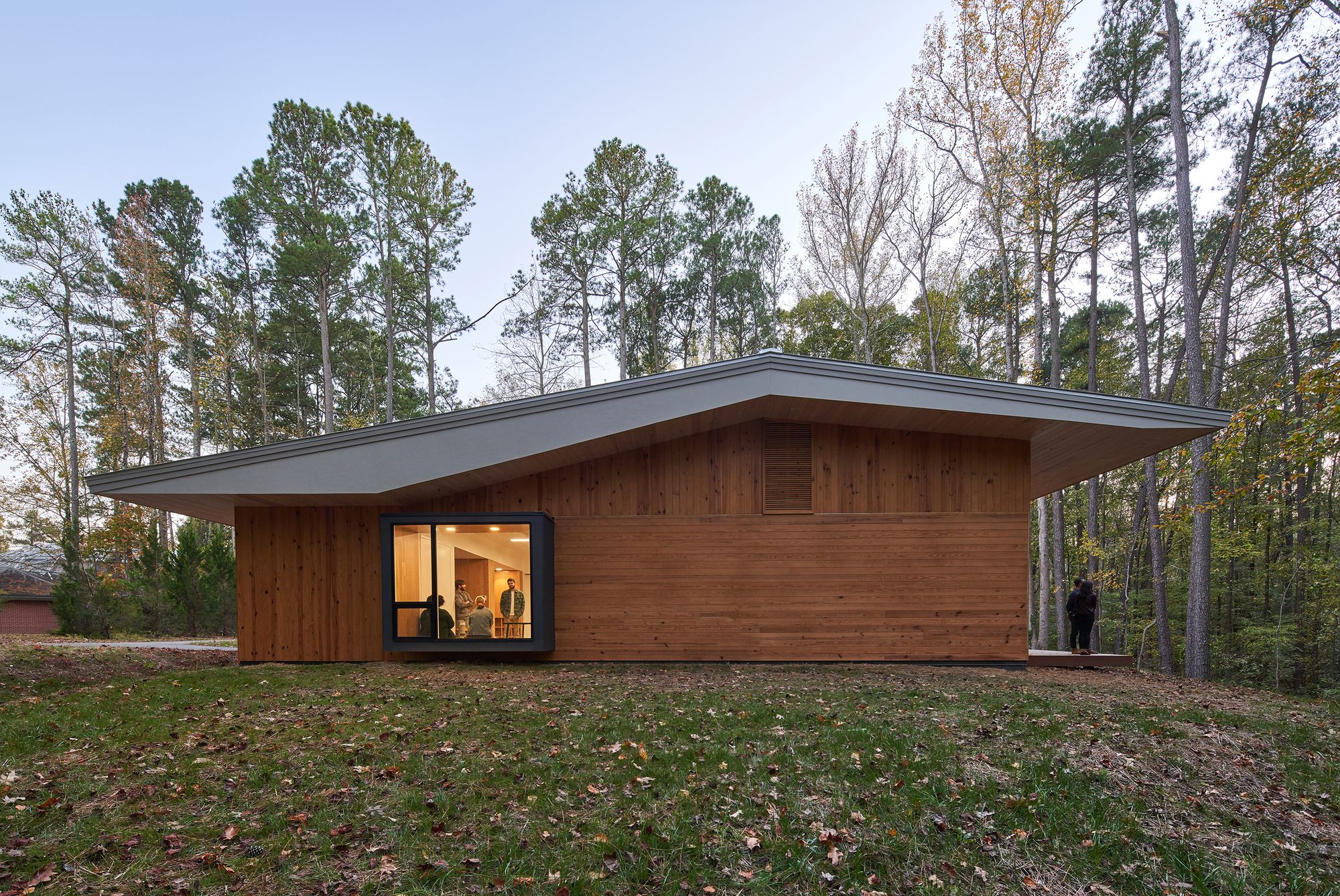 The woodland classroom is located at the edge of the woods by an outdoor gathering space shared by a cluster of other small museum buildings. The program is two separate classrooms joined by a large roof. The space between the classrooms is a breezeway that frames views of the woods. The roof is punctured by nine skylights that flood spaces beneath with natural light.