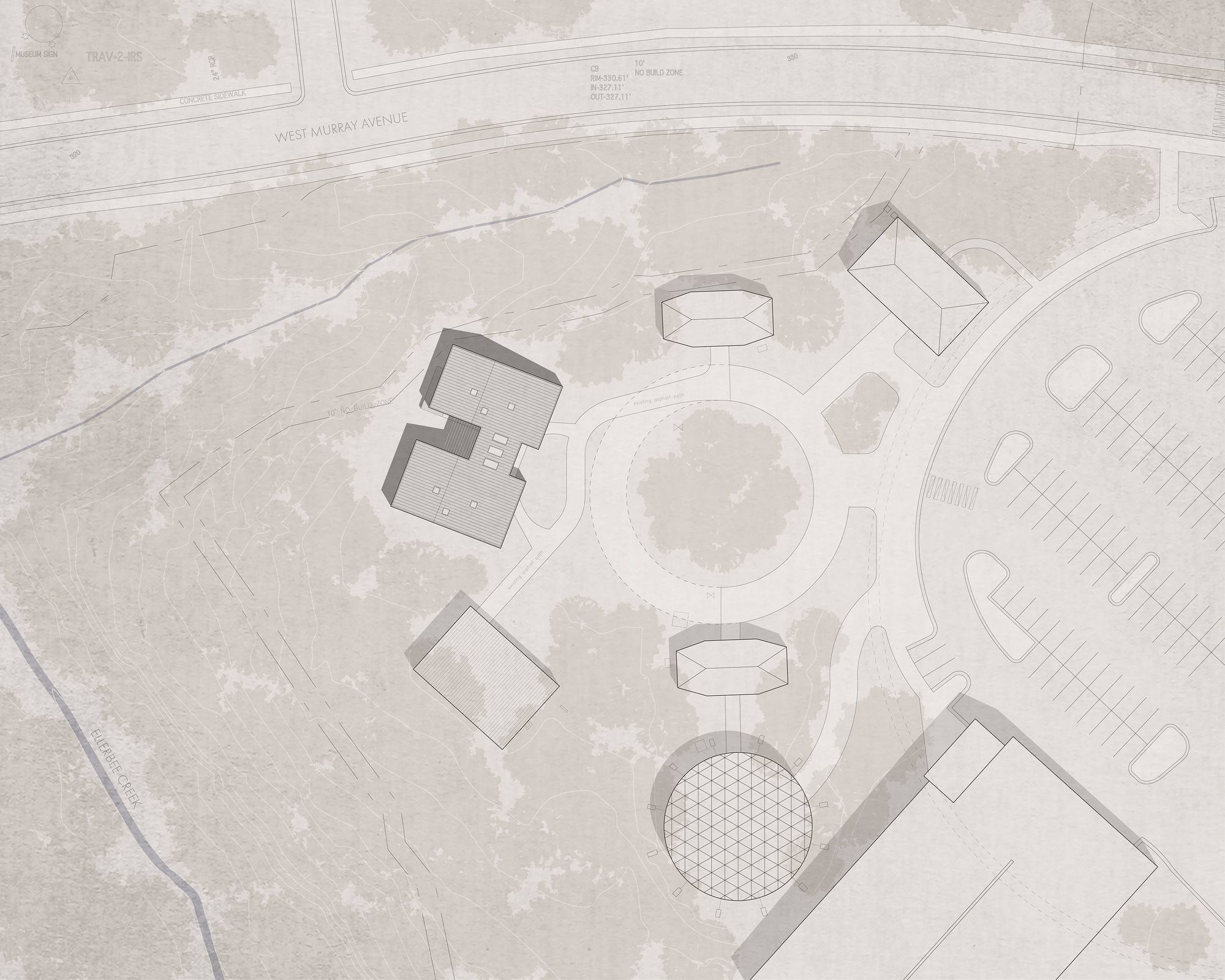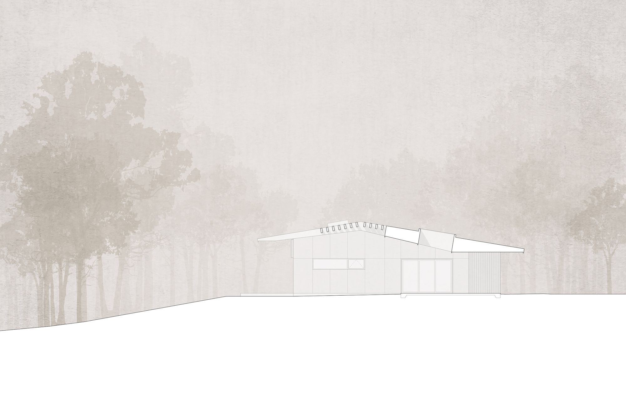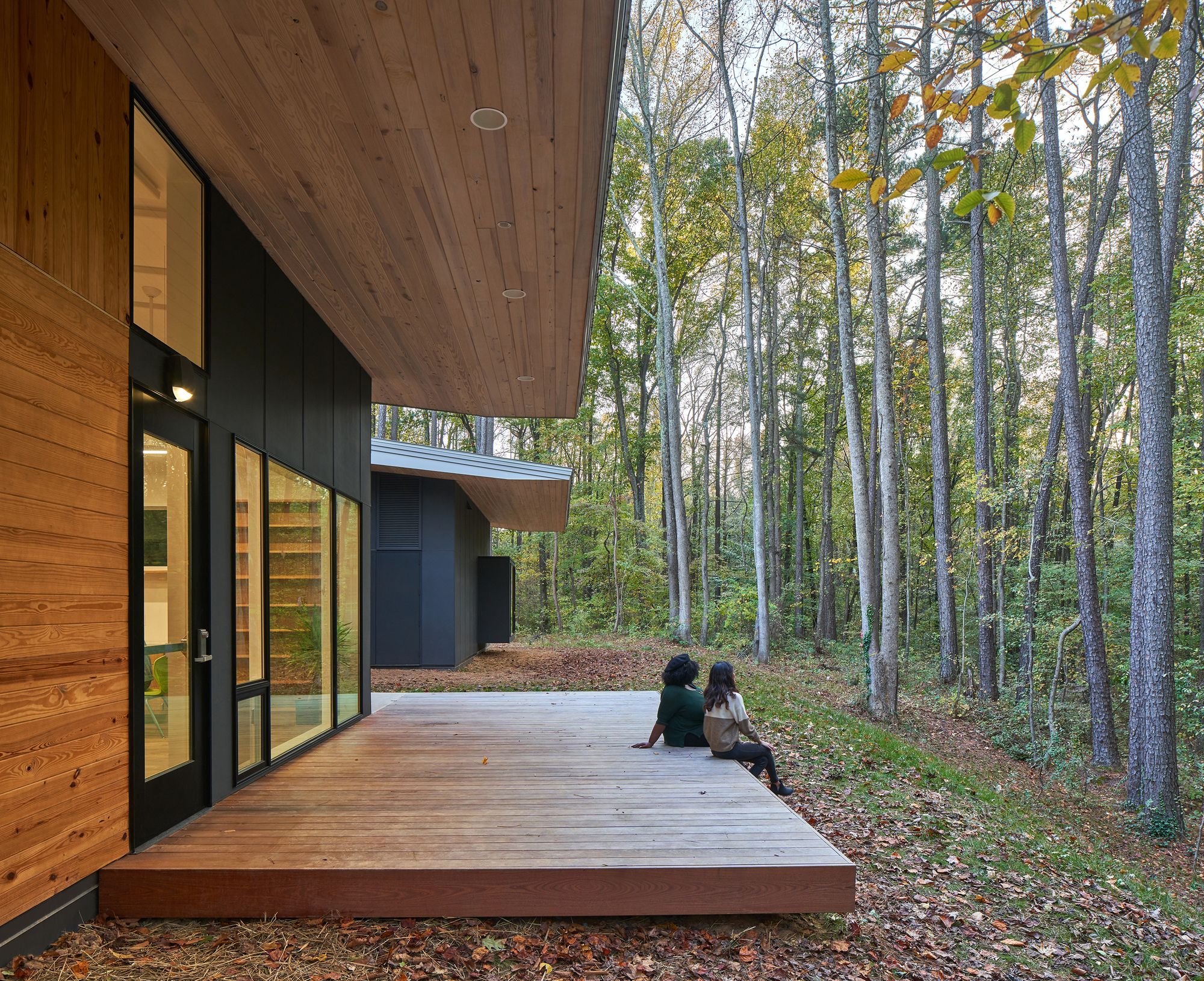The woodland classroom is located at the edge of the woods by an outdoor gathering space shared by a cluster of other small museum buildings. The program is two separate classrooms joined by a large roof. The space between the classrooms is a breezeway that frames views of the woods. The roof is punctured by nine skylights that flood spaces beneath with natural light.