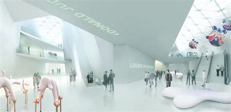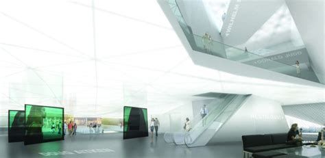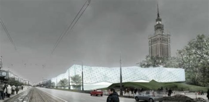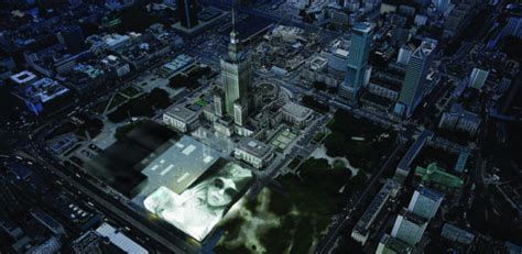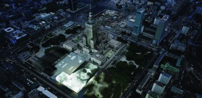 Decisions regarding space and the program refer to the physical aspect of the immediate urban context of the Museum, i.e. the view from closer and further plans, glass elevations of the so-called eastern wall, crystal chandeliers in the Palace of Culture. The glass walls, and the fifth elevation – the roof, all lit up, visible from many different locations, will become mega pictures in the scale of the city, and at the same time an “electronic canvas” for the artists.