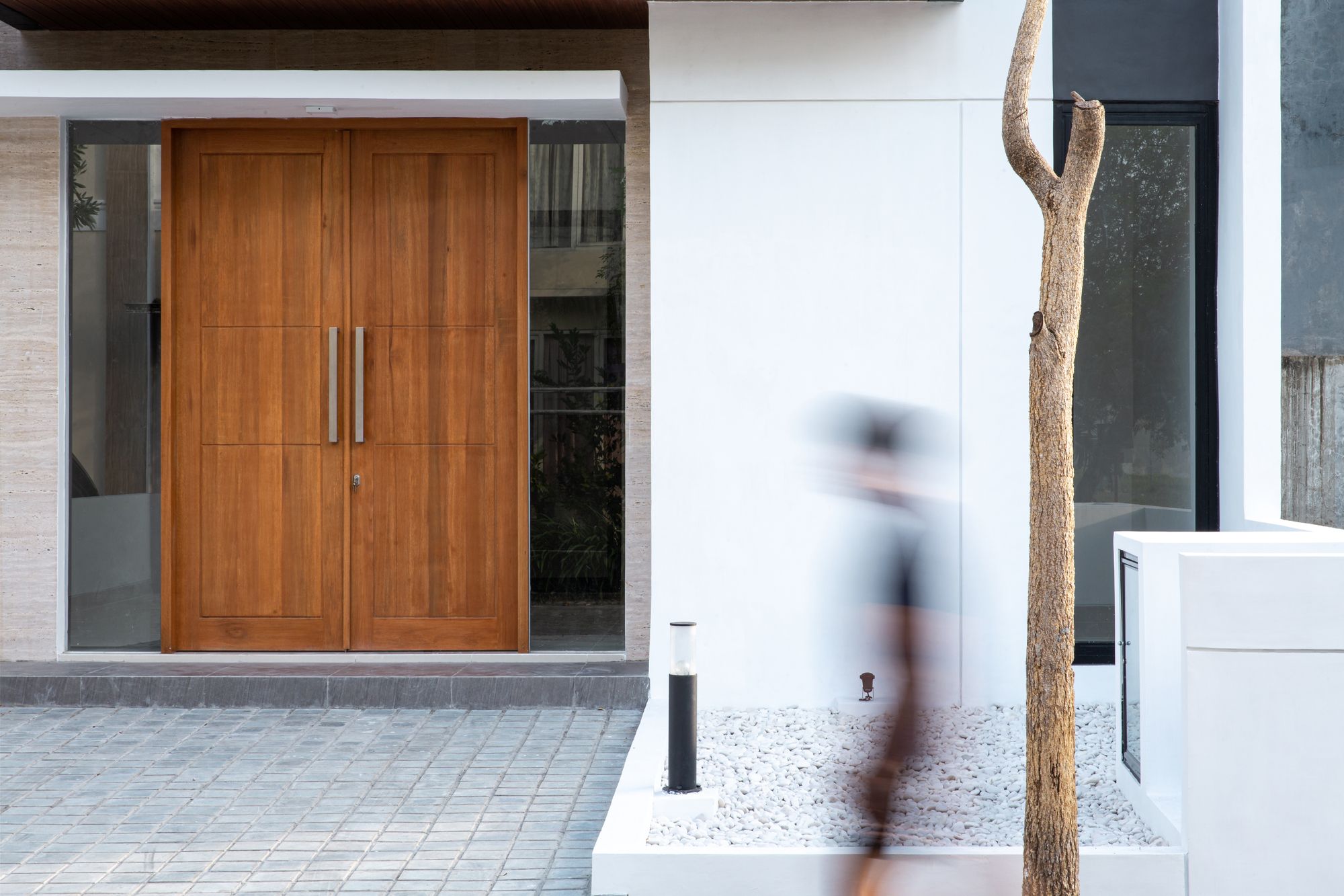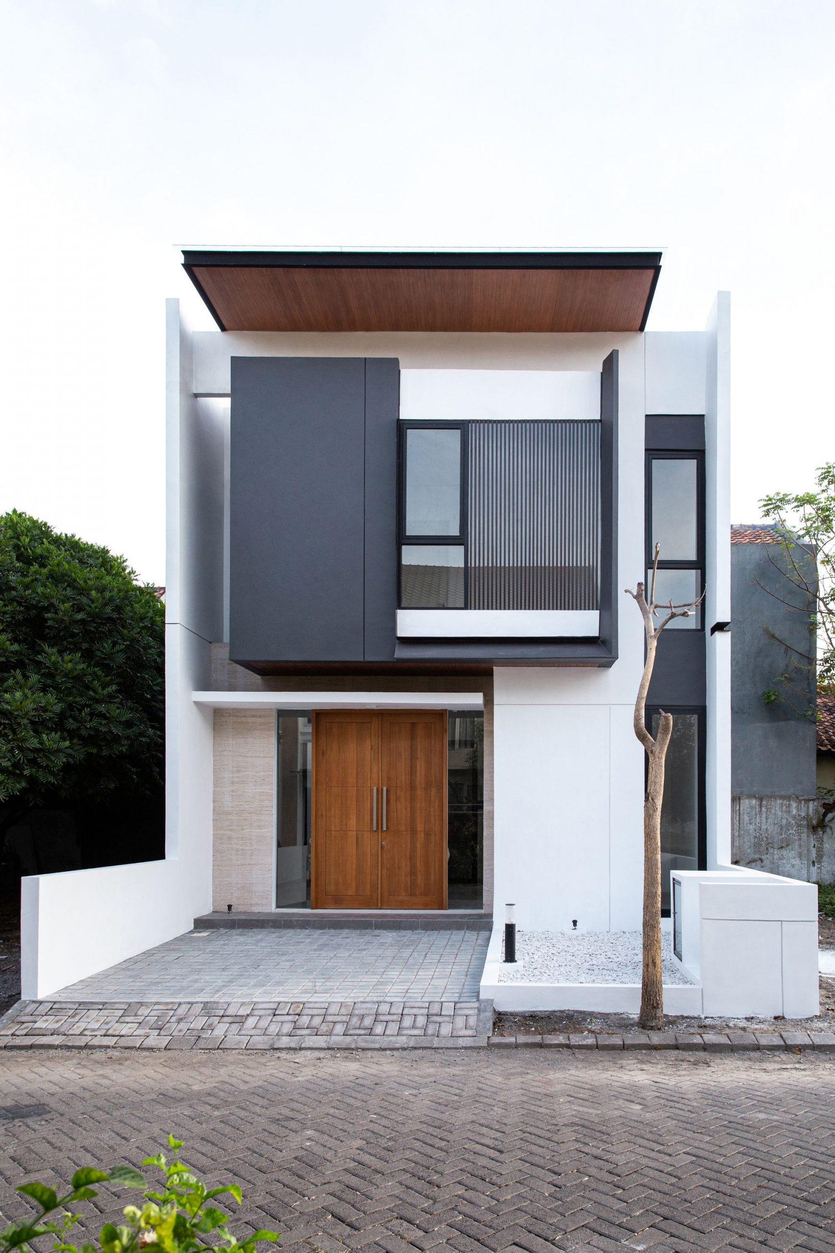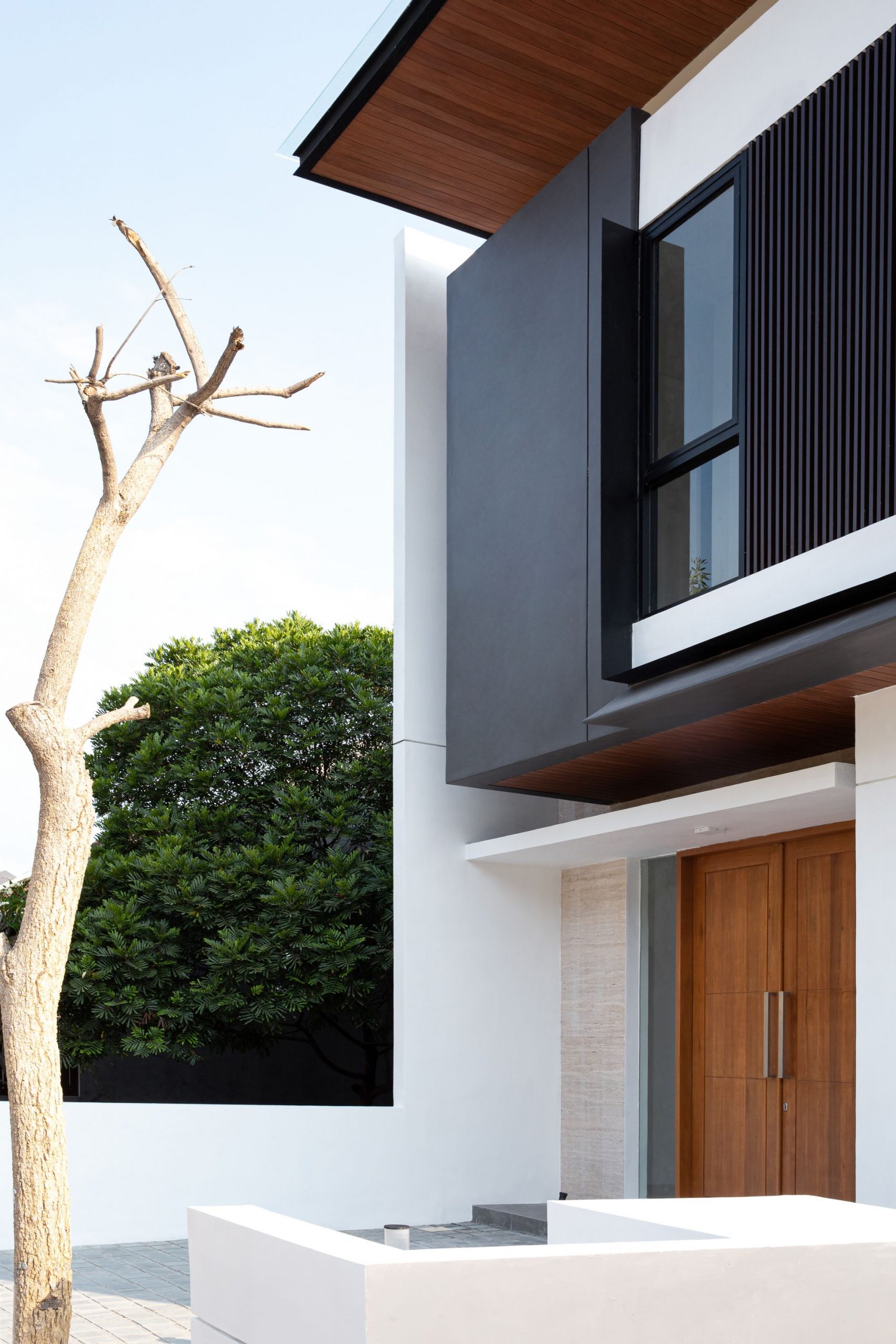 Despite the project extensive program needed, the architect avoided a full house design mass. Instead giving an open space in backyard so the light can enter the building. Areas of the house are vertically composed into two level, inside the house there’s so many window to prevent heat because humidity in Indonesian climate. In conjunction with program and room configuration, the architect also use aesthetic element to support a calming atmosphere throughout the house. Wooden stair floor, wooden ceiling, white wall all induce this atmosphere. Using white coral stone to cover the landscape allow occupant to feel calm and refreshed with the clean view. Together with the greenery surrounding the house, these details succeed in creating an ambient and serene escape from chaotic city.