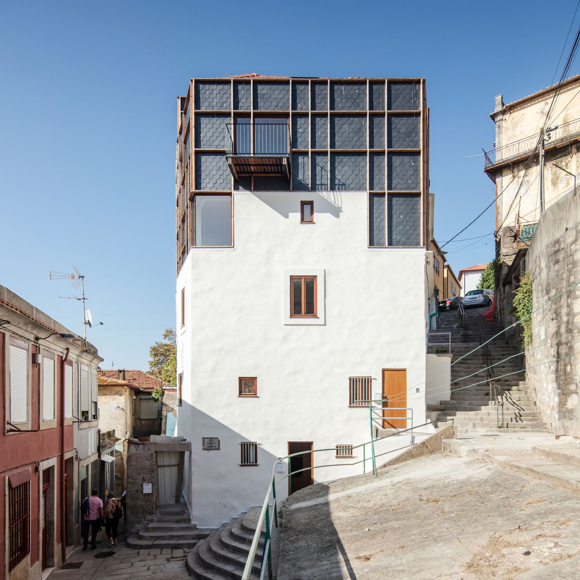 Generically destined for use as residential, the project balances the changes in levels and their impact on the different urban facades. In the original building, a wooden construction topped the stone masonry structure. In the new intervention, a light aluminum volume similar to the pre-existing one was added, with a scale-like facade and a distinct design that responds to the intended function and to the uniformization of the urban set, modernizing it with traditional construction themes, in which it stands out and assumes a distinct character.