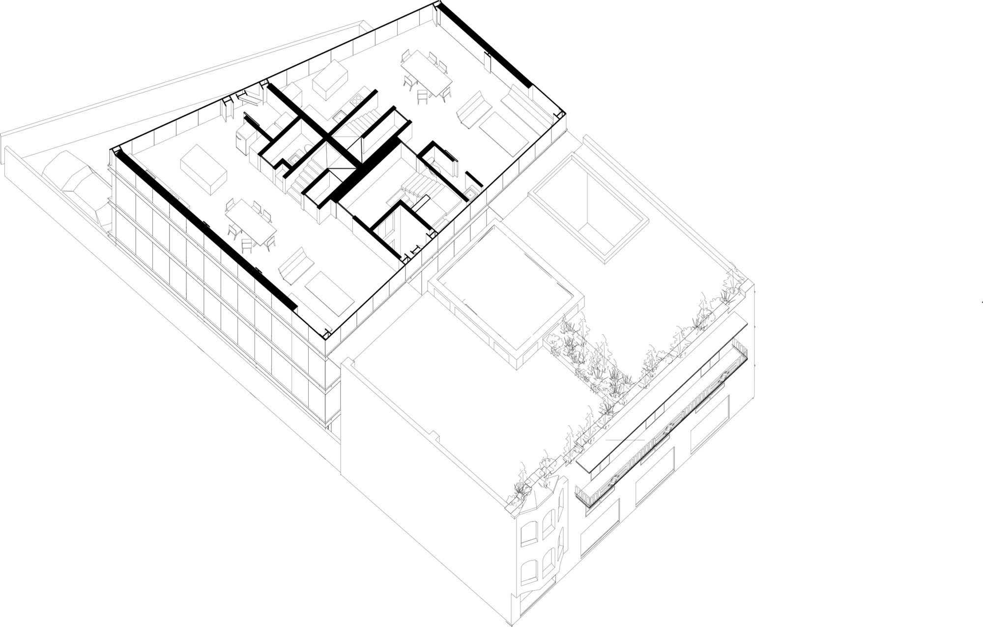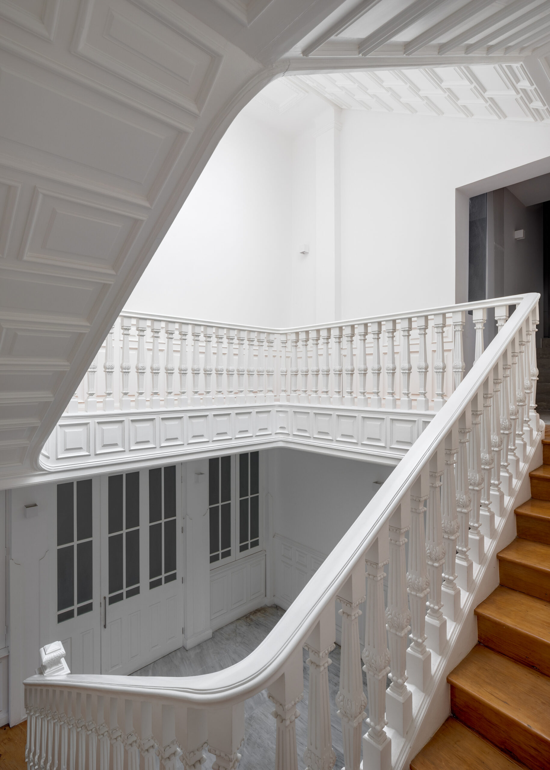 We have taken a three-story beautiful house built in 1925 that had been stripped out of its character by turning it into an office space, and we have infused it with a new life. A central goal of this project was to rescue one of the main features of this house, its wooden three flight staircase that envelopes the skylight at the center of the house. We recovered this area as the main entrance and residential lobby. This refurbished area leads to the new contemporary tower.