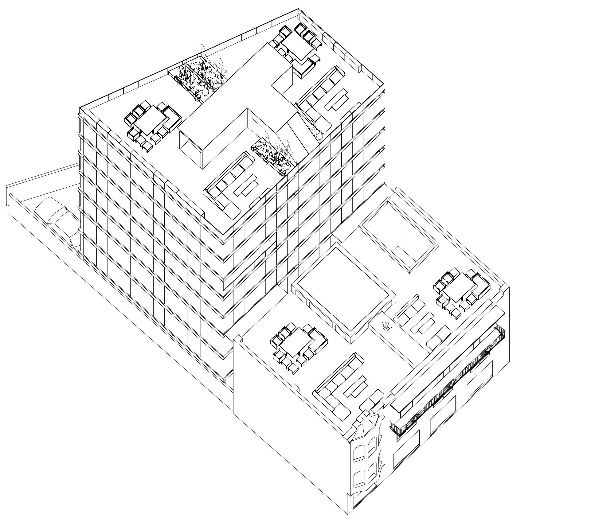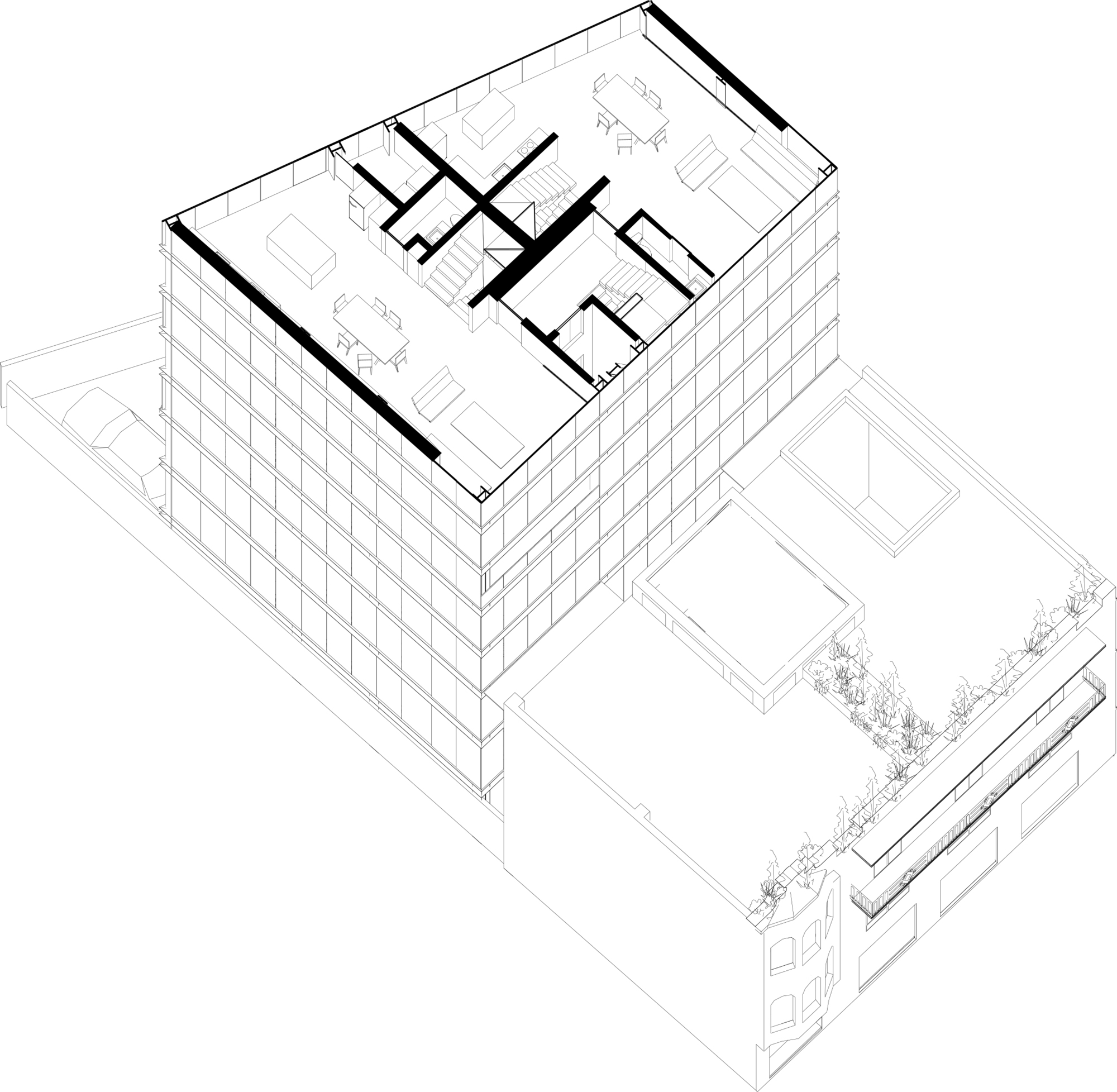 The original house occupies sixty percent of the plot; in the remaining forty percent we have built this eight-story tower using a light steel structure and a glass façade. The original house, which dimensions exceeds today’s needs, has been turned into two apartments that have respected the original layout. The new tower is attuned to the variety of lifestyles that inhabit La Colonia Roma and Mexico City as a whole. Thus, it considers the needs and requirements of a wide variety of possible residents.