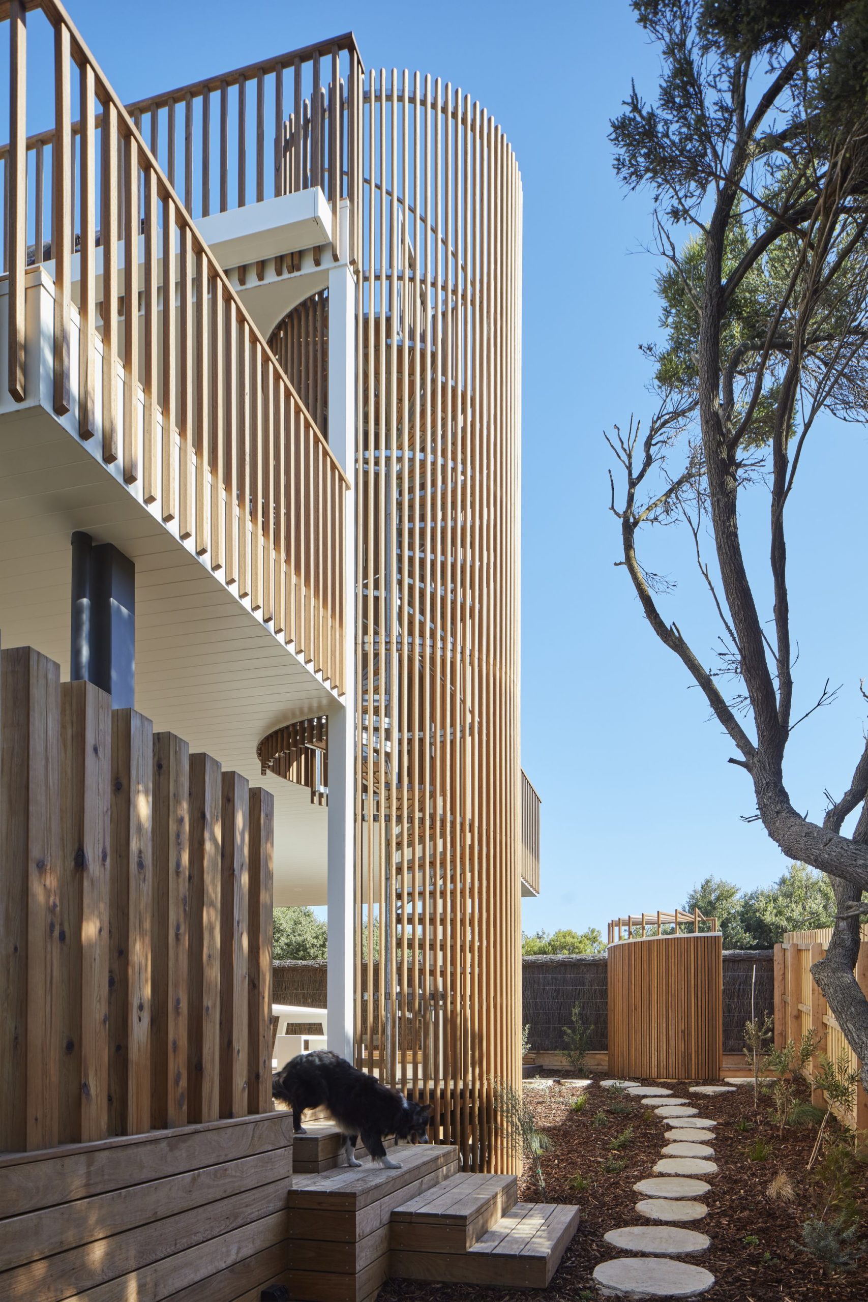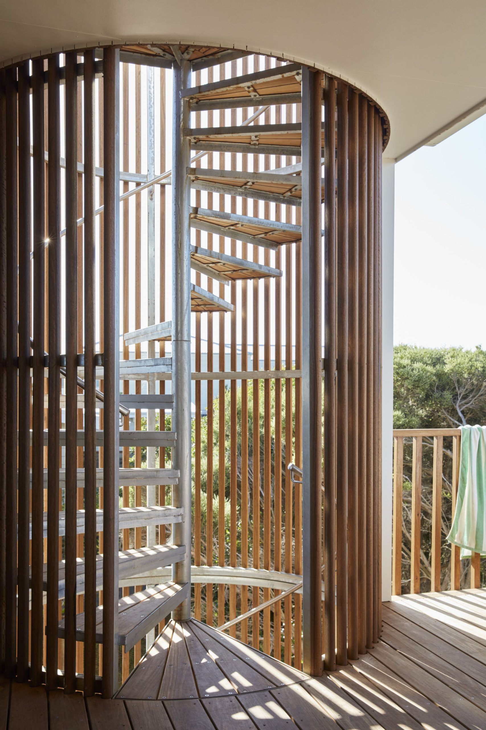 An external spiral staircase anchors the house and connects all three decks levels. Also clad in timber battens, it’s possible to see out when climbing the stairs, but it’s also private – and safe from wayward golf balls. Once clad, the staircase became both sculptural and grounding. “It’s a beacon, pegged into the earth”, noted Kirby. The client was very involved in the design process. “We enjoyed working with our client, who contributed beautiful details that customize or personalize the design,” said Kirby.
