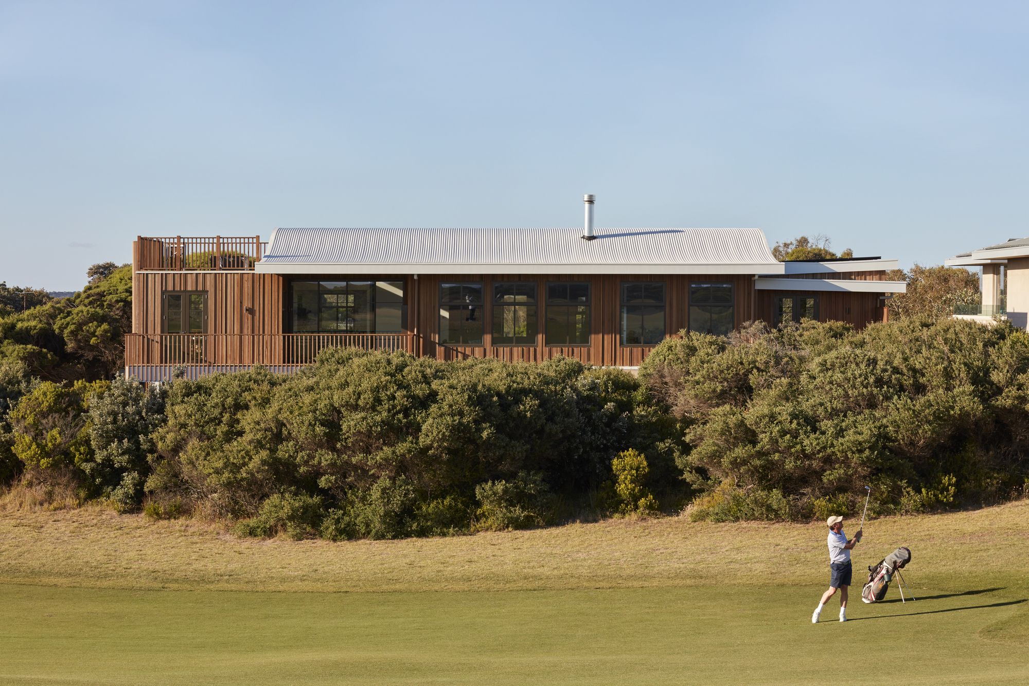The house’s fluid roofline and curving forms take inspiration from the golf course with its gentle undulations, curvaceous bunkers, and rolling greens. It doesn’t hurt, of course, that the clients are a couple of keen golfers who adore that particular fairway. Sustainably constructed from rammed earth, the house has a secure, stable feeling. Kirby describes the rammed earth as “surprisingly soft and endearing, it feels like a warm hug”.