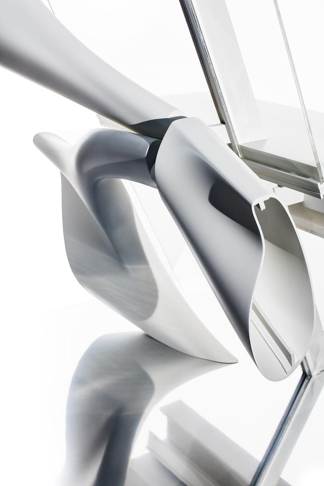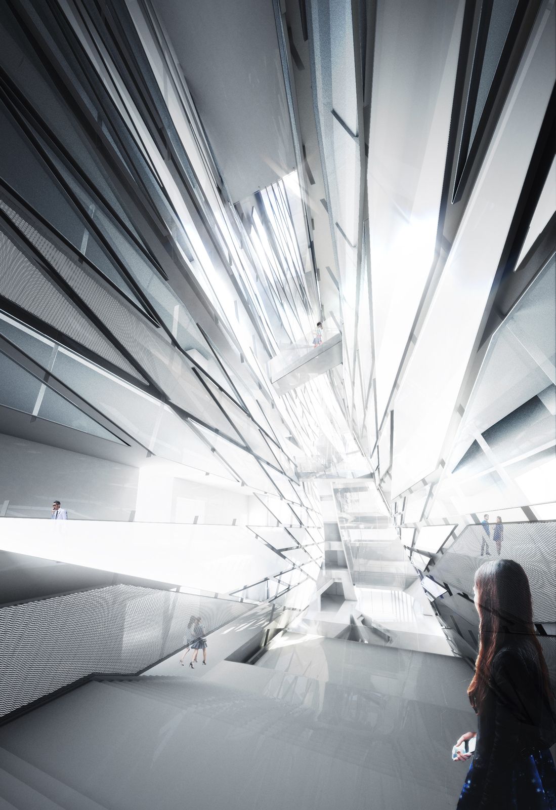 According to all the givens, Morphosis generated a high-tech folding mass around a grand entrance and a multi-storey atrium. This folding mass is directed towards the park, providing the lower floors of the building with passive shading. The mass houses the conference rooms and social spaces, in addition to street level flagship retail and exhibition galleries for the public. It, also, connects the three extending wings housing the research laboratories. A transparent ground plane by the entrance extends the landscape into the building’s interior and directs the light and circulation towards an open pedestrian laneway which leads to the grand entrance. The entrance leads to the 30-meter-high and 100-meter-long multi-storey atrium which acts as the building’s social center. The atrium’s transparent liner system is comprised of a massive 8-meter- ‘stretchers’ system displaying Kolon’s manufactured fabric and it exposing the movement on all floors of the building.