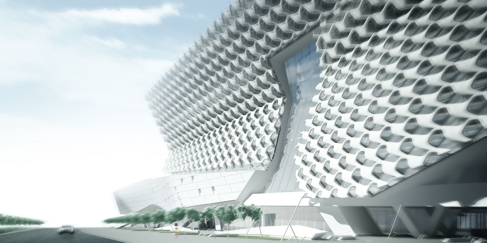 The displayed fabrics are not the only Kolon products incorporated in the design of the building. Kolon’s high-tech Aramid fabric was also used as a constituent of the Glass Fiber Reinforced Plastic GFRP which forms the unique and symbolic brise-soleil system covering the western façade of the building. The system has been parametrically designed to achieve optimum shading and view. Apart from shading, other systems were included in the building’s design to make it environmentally sustainable, like green roofs, recycled materials, and bubble deck slabs which reduce the amount of used to concrete by 30%.
