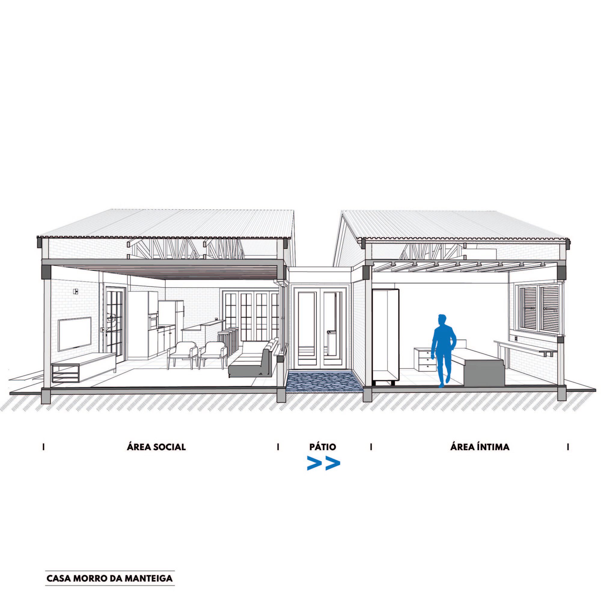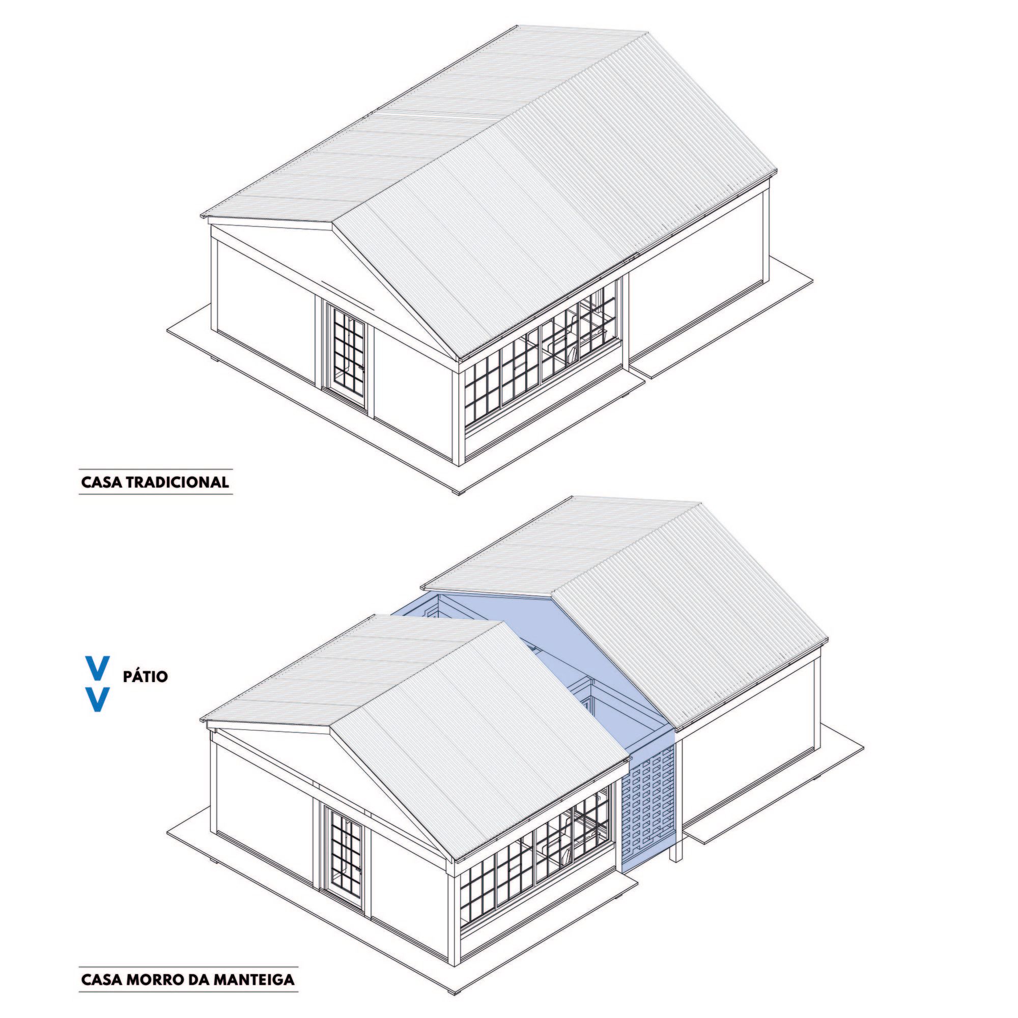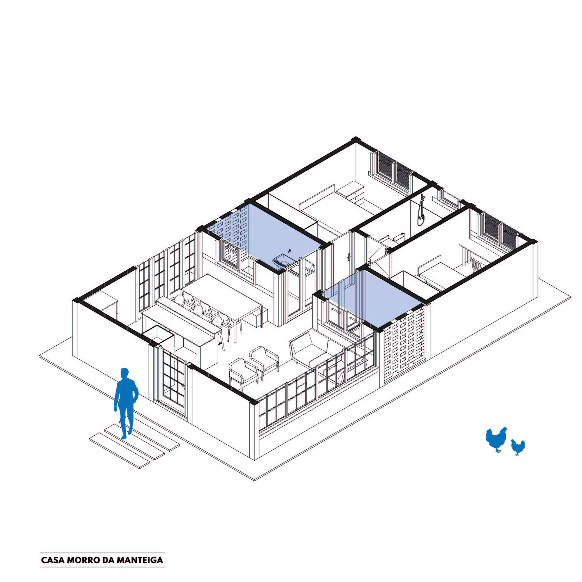 For this, a shrimp door has already been used in the kitchen / dining area, which in the future will integrate with the garage and laundry, which will be, for now, in one of the patios. It is a very significant project for us, as it shows that a house built with limited resources, by Minha Casa Minha Vida, does not need to be a ‘standard’ house, without studying thermal comfort or materiality.