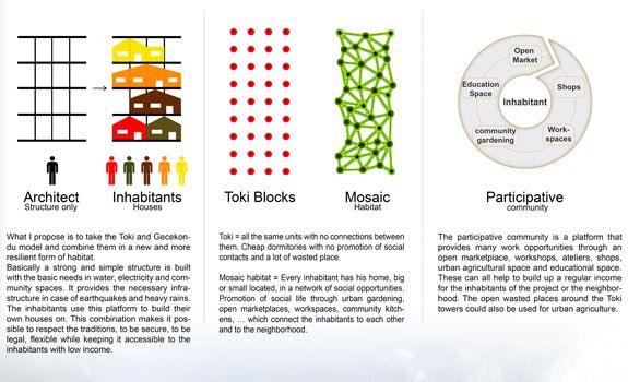 The informal housing or Gecekondu in Istanbul is a spontaneous response to the massive growth the city knows since 1945. Due to the high unemployment rate the informal settlers have a very low or no income. The Gecekondu settlements are uncontrolled, poorly built and present severe risks in case of earthquakes and strong rains, common in Istanbul. A safe and controlled solution must be found for these new settlements. An attempt to this is made by the Toki typology. The government replaces informal houses by cheap monofonctional housing blocks.